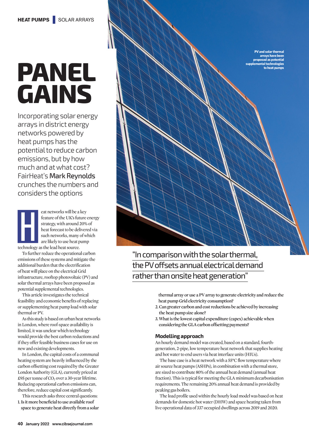 HEAT PUMPS | SOLAR ARRAYS PV and solar thermal arrays have been proposed as potential supplemental technologies to heat pumps PANEL GAINS Incorporating solar energy arrays in district energy networks powered by heat pumps has the potential to reduce carbon emissions, but by how much and at what cost? FairHeats Mark Reynolds crunches the numbers and considers the options H eat networks will be a key feature of the UKs future energy strategy, with around 20% of heat forecast to be delivered via such networks, many of which are likely to use heat pump technology as the lead heat source. To further reduce the operational carbon emissions of these systems and mitigate the additional burden that the electrification of heat will place on the electrical Grid infrastructure, rooftop photovoltaic (PV) and solar thermal arrays have been proposed as potential supplemental technologies. This article investigates the technical feasibility and economic benefits of replacing or supplementing heat pump load with solar thermal or PV. As this study is based on urban heat networks in London, where roof-space availability is limited, it was unclear which technology would provide the best carbon reductions and if they offer feasible business cases for use on new and existing developments. In London, the capital costs of a communal heating system are heavily influenced by the carbon offsetting cost required by the Greater London Authority (GLA), currently priced at 95 per tonne of CO2 over a 30-year lifetime. Reducing operational carbon emissions can, therefore, reduce capital cost significantly. This research asks three central questions: 1. Is it more beneficial to use available roof space to generate heat directly from a solar In comparison with the solar thermal, the PV offsets annual electrical demand rather than onsite heat generation thermal array or use a PV array to generate electricity and reduce the heat pump Grid electricity consumption? 2. Can greater carbon and cost reductions be achieved by increasing the heat pump size alone? 3. What is the lowest capital expenditure (capex) achievable when considering the GLA carbon offsetting payments? Modelling approach An hourly demand model was created, based on a standard, fourthgeneration, 2-pipe, low temperature heat network that supplies heating and hot water to end users via heat interface units (HIUs). The base case is a heat network with a 55C flow temperature where air source heat pumps (ASHPs), in combination with a thermal store, are sized to contribute 80% of the annual heat demand (annual heat fraction). This is typical for meeting the GLA minimum decarbonisation requirements. The remaining 20% annual heat demand is provided by peaking gas boilers. The load profile used within the hourly load model was based on heat demands for domestic hot water (DHW) and space heating taken from live operational data of 337 occupied dwellings across 2019 and 2020. 40 January 2022 www.cibsejournal.com CIBSE Jan 22 pp40-42 Heat pump solar top up.indd 40 23/12/2021 15:50