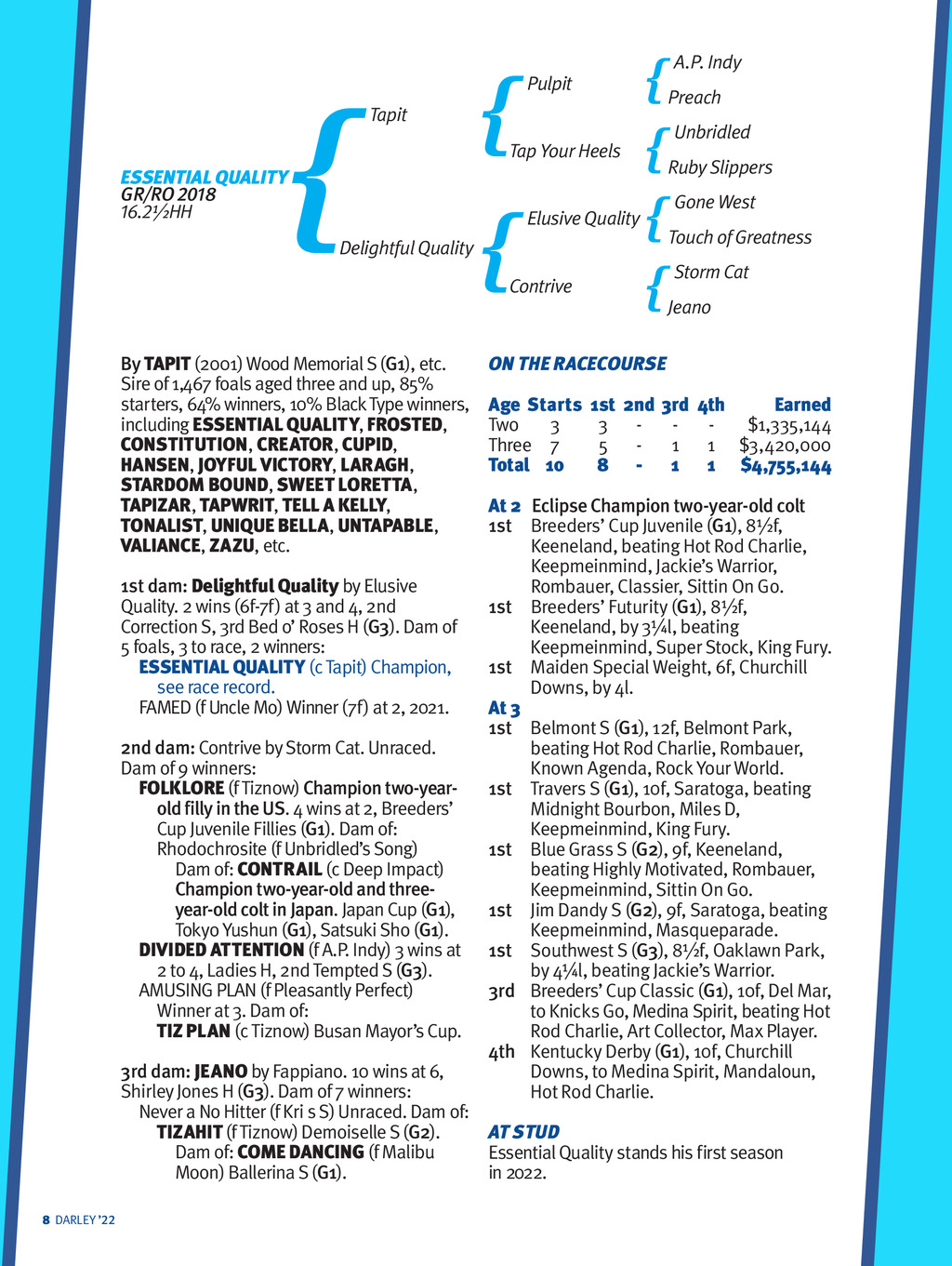 { Tapit ESSENTIAL QUALITY GR/RO 2018 16.212HH Delightful Quality { Pulpit Elusive Quality Contrive By TAPIT (2001) Wood Memorial S (G1), etc. Sire of 1,467 foals aged three and up, 85% starters, 64% winners, 10% Black Type winners, including ESSENTIAL QUALITY, FROSTED, CONSTITUTION, CREATOR, CUPID, HANSEN, JOYFUL VICTORY, LARAGH, STARDOM BOUND, SWEET LORETTA, TAPIZAR, TAPWRIT, TELL A KELLY, TONALIST, UNIQUE BELLA, UNTAPABLE, VALIANCE, ZAZU, etc. 1st dam: Delightful Quality by Elusive Quality. 2 wins (6f-7f) at 3 and 4, 2nd Correction S, 3rd Bed o Roses H (G3). Dam of 5 foals, 3 to race, 2 winners: ESSENTIAL QUALITY (c Tapit) Champion, see race record. FAMED (f Uncle Mo) Winner (7f) at 2, 2021. 2nd dam: Contrive by Storm Cat. Unraced. Dam of 9 winners: FOLKLORE (f Tiznow) Champion two-yearold filly in the US. 4 wins at 2, Breeders Cup Juvenile Fillies (G1). Dam of: Rhodochrosite (f Unbridleds Song) Dam of: CONTRAIL (c Deep Impact) Champion two-year-old and threeyear-old colt in Japan. Japan Cup (G1), Tokyo Yushun (G1), Satsuki Sho (G1). DIVIDED ATTENTION (f A.P. Indy) 3 wins at 2 to 4, Ladies H, 2nd Tempted S (G3). AMUSING PLAN (f Pleasantly Perfect) Winner at 3. Dam of: TIZ PLAN (c Tiznow) Busan Mayors Cup. A.P. Indy Preach Tap Your Heels { { { { { Unbridled Ruby Slippers Gone West Touch of Greatness Storm Cat Jeano ON THE RACECOURSE Age Starts Two 3 Three 7 Total 10 1st 2nd 3rd 4th Earned 3 $1,335,144 5 1 1 $3,420,000 8 - 1 1 $4,755,144 At 2 Eclipse Champion two-year-old colt 1st Breeders Cup Juvenile (G1), 812f, Keeneland, beating Hot Rod Charlie, Keepmeinmind, Jackies Warrior, Rombauer, Classier, Sittin On Go. 1st Breeders Futurity (G1), 812f, Keeneland, by 314l, beating Keepmeinmind, Super Stock, King Fury. 1st Maiden Special Weight, 6f, Churchill Downs, by 4l. At 3 1st Belmont S (G1), 12f, Belmont Park, beating Hot Rod Charlie, Rombauer, Known Agenda, Rock Your World. 1st Travers S (G1), 10f, Saratoga, beating Midnight Bourbon, Miles D, Keepmeinmind, King Fury. 1st Blue Grass S (G2), 9f, Keeneland, beating Highly Motivated, Rombauer, Keepmeinmind, Sittin On Go. 1st Jim Dandy S (G2), 9f, Saratoga, beating Keepmeinmind, Masqueparade. 1st Southwest S (G3), 812f, Oaklawn Park, by 414l, beating Jackies Warrior. 3rd Breeders Cup Classic (G1), 10f, Del Mar, to Knicks Go, Medina Spirit, beating Hot Rod Charlie, Art Collector, Max Player. 4th Kentucky Derby (G1), 10f, Churchill Downs, to Medina Spirit, Mandaloun, Hot Rod Charlie. 3rd dam: JEANO by Fappiano. 10 wins at 6, Shirley Jones H (G3). Dam of 7 winners: Never a No Hitter (f Kri s S) Unraced. Dam of: TIZAHIT (f Tiznow) Demoiselle S (G2). AT STUD Dam of: COME DANCING (f Malibu Essential Quality stands his first season Moon) Ballerina S (G1). in 2022. 8 DARLEY 22