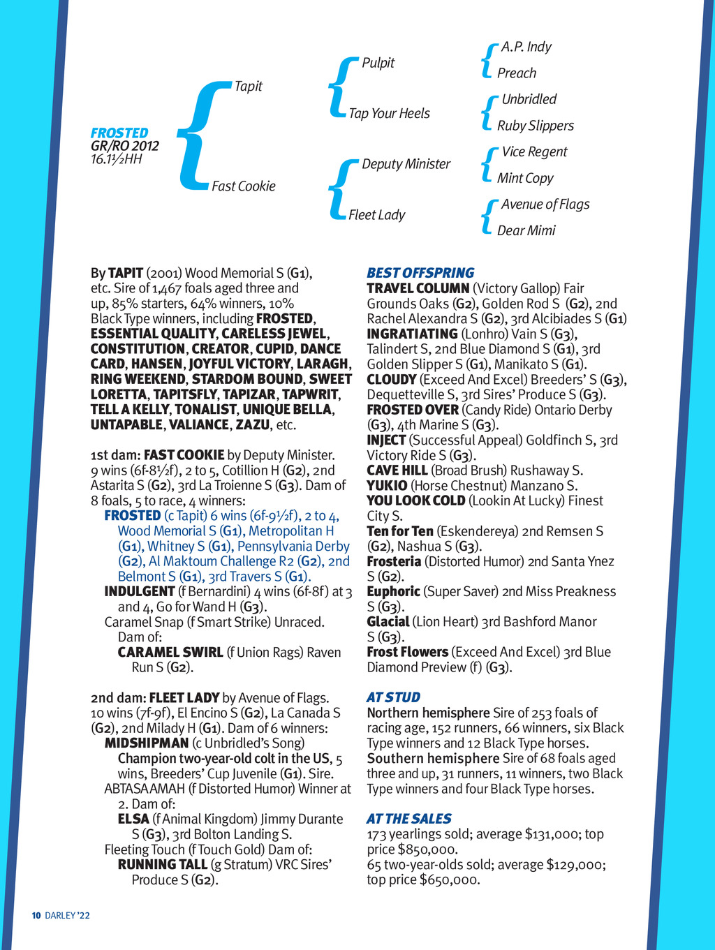 FROSTED GR/RO 2012 16.112HH { Tapit Fast Cookie { Pulpit Tap Your Heels { Deputy Minister Fleet Lady { { { { A.P. Indy Preach Unbridled Ruby Slippers Vice Regent Mint Copy Avenue of Flags Dear Mimi By TAPIT (2001) Wood Memorial S (G1), etc. Sire of 1,467 foals aged three and up, 85% starters, 64% winners, 10% Black Type winners, including FROSTED, ESSENTIAL QUALITY, CARELESS JEWEL, CONSTITUTION, CREATOR, CUPID, DANCE CARD, HANSEN, JOYFUL VICTORY, LARAGH, RING WEEKEND, STARDOM BOUND, SWEET LORETTA, TAPITSFLY, TAPIZAR, TAPWRIT, TELL A KELLY, TONALIST, UNIQUE BELLA, UNTAPABLE, VALIANCE, ZAZU, etc. BEST OFFSPRING TRAVEL COLUMN (Victory Gallop) Fair Grounds Oaks (G2), Golden Rod S (G2), 2nd Rachel Alexandra S (G2), 3rd Alcibiades S (G1) INGRATIATING (Lonhro) Vain S (G3), Talindert S, 2nd Blue Diamond S (G1), 3rd Golden Slipper S (G1), Manikato S (G1). CLOUDY (Exceed And Excel) Breeders S (G3), Dequetteville S, 3rd Sires Produce S (G3). FROSTED OVER (Candy Ride) Ontario Derby (G3), 4th Marine S (G3). INJECT (Successful Appeal) Goldfinch S, 3rd 1st dam: FAST COOKIE by Deputy Minister. Victory Ride S (G3). 9 wins (6f-812f), 2 to 5, Cotillion H (G2), 2nd CAVE HILL (Broad Brush) Rushaway S. Astarita S (G2), 3rd La Troienne S (G3). Dam of YUKIO (Horse Chestnut) Manzano S. 8 foals, 5 to race, 4 winners: YOU LOOK COLD (Lookin At Lucky) Finest FROSTED (c Tapit) 6 wins (6f-912f), 2 to 4, City S. Wood Memorial S (G1), Metropolitan H Ten for Ten (Eskendereya) 2nd Remsen S (G1), Whitney S (G1), Pennsylvania Derby (G2), Nashua S (G3). (G2), Al Maktoum Challenge R2 (G2), 2nd Frosteria (Distorted Humor) 2nd Santa Ynez S (G2). Belmont S (G1), 3rd Travers S (G1). INDULGENT (f Bernardini) 4 wins (6f-8f) at 3 Euphoric (Super Saver) 2nd Miss Preakness S (G3). and 4, Go for Wand H (G3). Glacial (Lion Heart) 3rd Bashford Manor Caramel Snap (f Smart Strike) Unraced. S (G3). Dam of: Frost Flowers (Exceed And Excel) 3rd Blue CARAMEL SWIRL (f Union Rags) Raven Diamond Preview (f) (G3). Run S (G2). 2nd dam: FLEET LADY by Avenue of Flags. 10 wins (7f-9f), El Encino S (G2), La Canada S (G2), 2nd Milady H (G1). Dam of 6 winners: MIDSHIPMAN (c Unbridleds Song) Champion two-year-old colt in the US, 5 wins, Breeders Cup Juvenile (G1). Sire. ABTASAAMAH (f Distorted Humor) Winner at 2. Dam of: ELSA (f Animal Kingdom) Jimmy Durante S (G3), 3rd Bolton Landing S. Fleeting Touch (f Touch Gold) Dam of: RUNNING TALL (g Stratum) VRC Sires Produce S (G2). 10 DARLEY 22 AT STUD Northern hemisphere Sire of 253 foals of racing age, 152 runners, 66 winners, six Black Type winners and 12 Black Type horses. Southern hemisphere Sire of 68 foals aged three and up, 31 runners, 11 winners, two Black Type winners and four Black Type horses. AT THE SALES 173 yearlings sold; average $131,000; top price $850,000. 65 two-year-olds sold; average $129,000; top price $650,000.