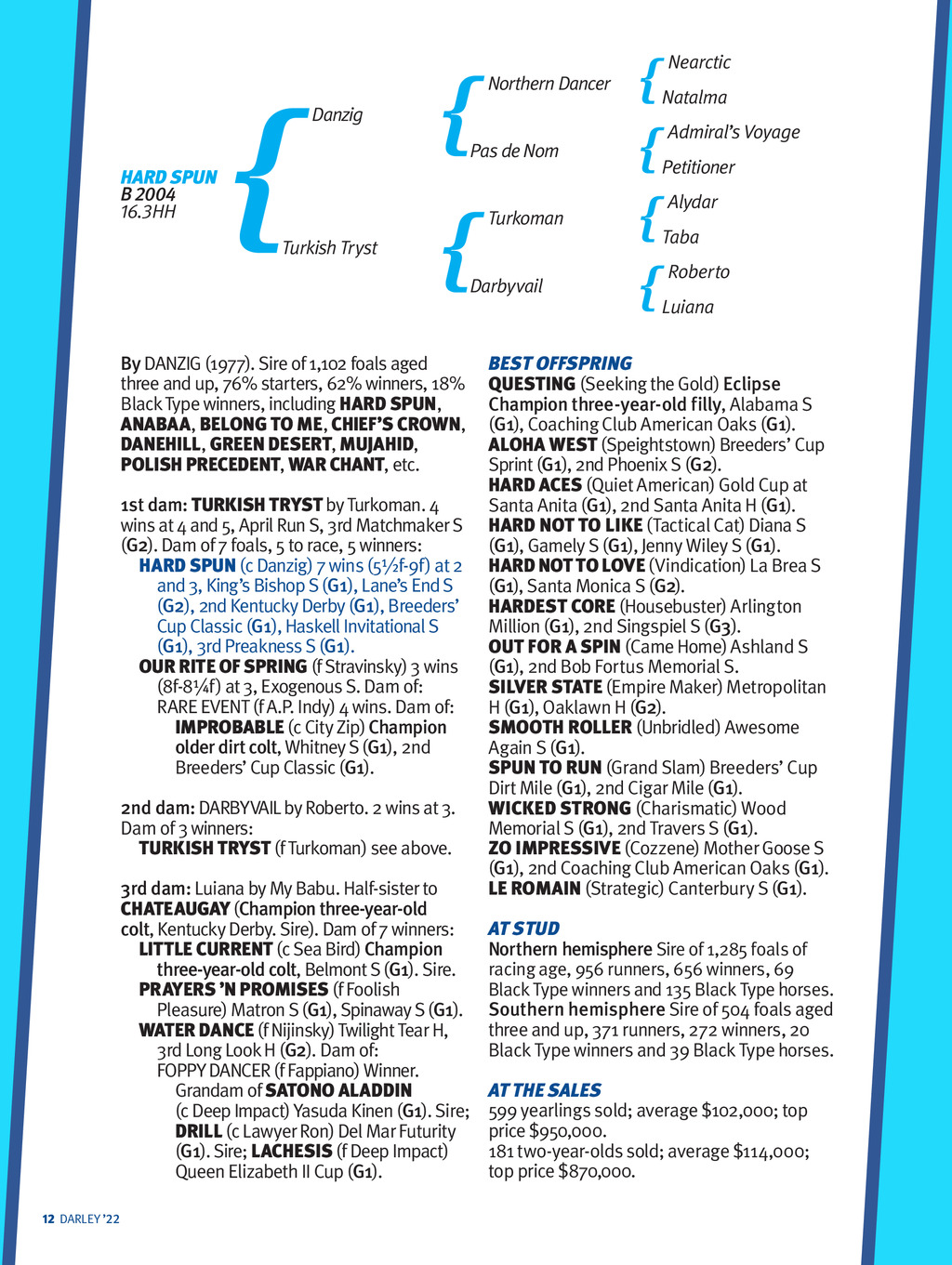 HARD SPUN B 2004 16.3HH { Danzig Turkish Tryst { Northern Dancer Pas de Nom { Turkoman Darbyvail By DANZIG (1977). Sire of 1,102 foals aged three and up, 76% starters, 62% winners, 18% Black Type winners, including HARD SPUN, ANABAA, BELONG TO ME, CHIEFS CROWN, DANEHILL, GREEN DESERT, MUJAHID, POLISH PRECEDENT, WAR CHANT, etc. 1st dam: TURKISH TRYST by Turkoman. 4 wins at 4 and 5, April Run S, 3rd Matchmaker S (G2). Dam of 7 foals, 5 to race, 5 winners: HARD SPUN (c Danzig) 7 wins (5f-9f) at 2 and 3, Kings Bishop S (G1), Lanes End S (G2), 2nd Kentucky Derby (G1), Breeders Cup Classic (G1), Haskell Invitational S (G1), 3rd Preakness S (G1). OUR RITE OF SPRING (f Stravinsky) 3 wins (8f-814f) at 3, Exogenous S. Dam of: RARE EVENT (f A.P. Indy) 4 wins. Dam of: IMPROBABLE (c City Zip) Champion older dirt colt, Whitney S (G1), 2nd Breeders Cup Classic (G1). 2nd dam: DARBYVAIL by Roberto. 2 wins at 3. Dam of 3 winners: TURKISH TRYST (f Turkoman) see above. 3rd dam: Luiana by My Babu. Half-sister to CHATEAUGAY (Champion three-year-old colt, Kentucky Derby. Sire). Dam of 7 winners: LITTLE CURRENT (c Sea Bird) Champion three-year-old colt, Belmont S (G1). Sire. PRAYERS N PROMISES (f Foolish Pleasure) Matron S (G1), Spinaway S (G1). WATER DANCE (f Nijinsky) Twilight Tear H, 3rd Long Look H (G2). Dam of: FOPPY DANCER (f Fappiano) Winner. Grandam of SATONO ALADDIN (c Deep Impact) Yasuda Kinen (G1). Sire; DRILL (c Lawyer Ron) Del Mar Futurity (G1). Sire; LACHESIS (f Deep Impact) Queen Elizabeth II Cup (G1). 12 DARLEY 22 { { { { Nearctic Natalma Admirals Voyage Petitioner Alydar Taba Roberto Luiana BEST OFFSPRING QUESTING (Seeking the Gold) Eclipse Champion three-year-old filly, Alabama S (G1), Coaching Club American Oaks (G1). ALOHA WEST (Speightstown) Breeders Cup Sprint (G1), 2nd Phoenix S (G2). HARD ACES (Quiet American) Gold Cup at Santa Anita (G1), 2nd Santa Anita H (G1). HARD NOT TO LIKE (Tactical Cat) Diana S (G1), Gamely S (G1), Jenny Wiley S (G1). HARD NOT TO LOVE (Vindication) La Brea S (G1), Santa Monica S (G2). HARDEST CORE (Housebuster) Arlington Million (G1), 2nd Singspiel S (G3). OUT FOR A SPIN (Came Home) Ashland S (G1), 2nd Bob Fortus Memorial S. SILVER STATE (Empire Maker) Metropolitan H (G1), Oaklawn H (G2). SMOOTH ROLLER (Unbridled) Awesome Again S (G1). SPUN TO RUN (Grand Slam) Breeders Cup Dirt Mile (G1), 2nd Cigar Mile (G1). WICKED STRONG (Charismatic) Wood Memorial S (G1), 2nd Travers S (G1). ZO IMPRESSIVE (Cozzene) Mother Goose S (G1), 2nd Coaching Club American Oaks (G1). LE ROMAIN (Strategic) Canterbury S (G1). AT STUD Northern hemisphere Sire of 1,285 foals of racing age, 956 runners, 656 winners, 69 Black Type winners and 135 Black Type horses. Southern hemisphere Sire of 504 foals aged three and up, 371 runners, 272 winners, 20 Black Type winners and 39 Black Type horses. AT THE SALES 599 yearlings sold; average $102,000; top price $950,000. 181 two-year-olds sold; average $114,000; top price $870,000.