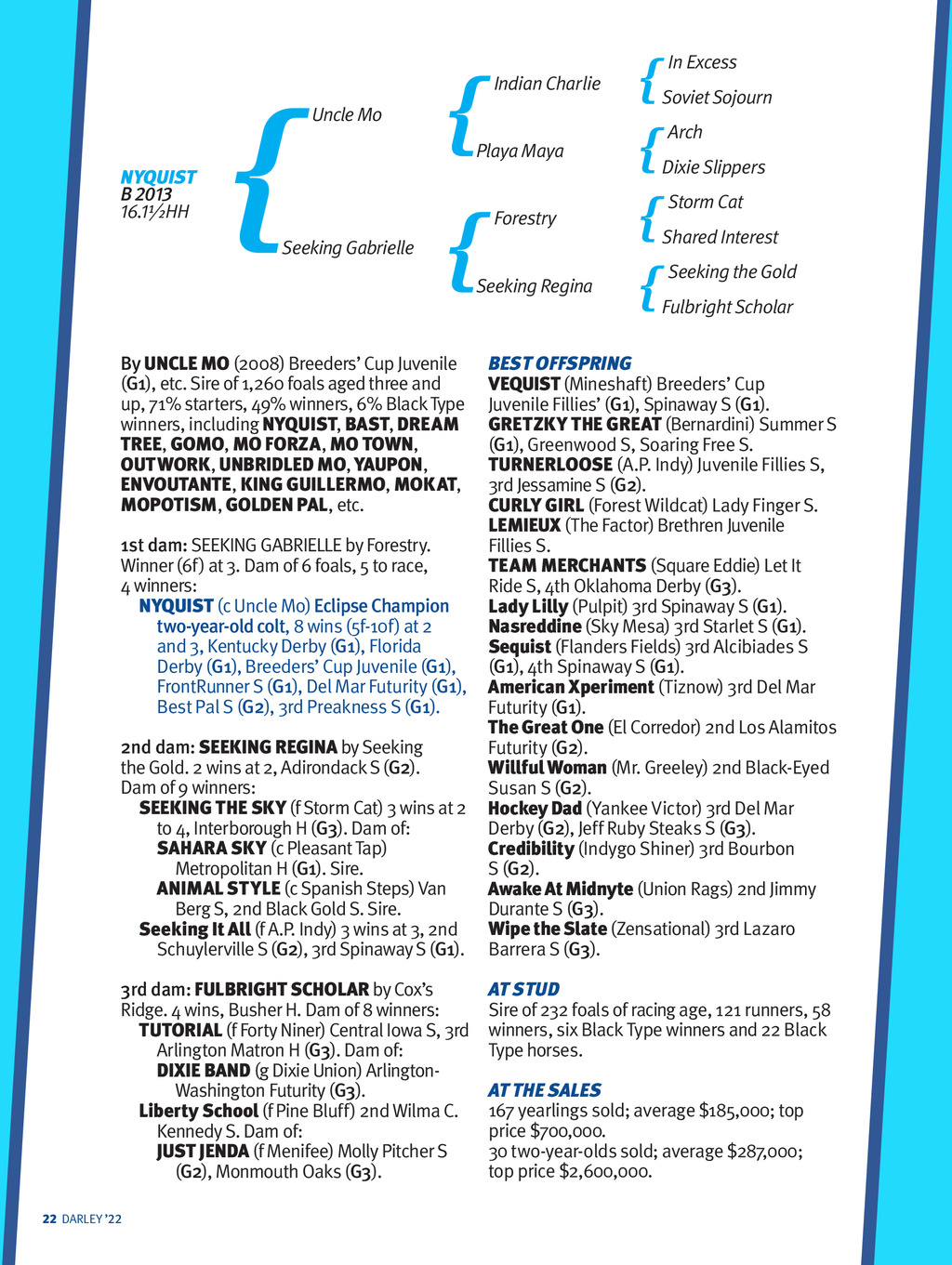 NYQUIST B 2013 16.112HH { Uncle Mo Seeking Gabrielle { Indian Charlie Playa Maya { Forestry Seeking Regina By UNCLE MO (2008) Breeders Cup Juvenile (G1), etc. Sire of 1,260 foals aged three and up, 71% starters, 49% winners, 6% Black Type winners, including NYQUIST, BAST, DREAM TREE, GOMO, MO FORZA, MO TOWN, OUTWORK, UNBRIDLED MO, YAUPON, ENVOUTANTE, KING GUILLERMO, MOKAT, MOPOTISM, GOLDEN PAL, etc. 1st dam: SEEKING GABRIELLE by Forestry. Winner (6f) at 3. Dam of 6 foals, 5 to race, 4 winners: NYQUIST (c Uncle Mo) Eclipse Champion two-year-old colt, 8 wins (5f-10f) at 2 and 3, Kentucky Derby (G1), Florida Derby (G1), Breeders Cup Juvenile (G1), FrontRunner S (G1), Del Mar Futurity (G1), Best Pal S (G2), 3rd Preakness S (G1). 2nd dam: SEEKING REGINA by Seeking the Gold. 2 wins at 2, Adirondack S (G2). Dam of 9 winners: SEEKING THE SKY (f Storm Cat) 3 wins at 2 to 4, Interborough H (G3). Dam of: SAHARA SKY (c Pleasant Tap) Metropolitan H (G1). Sire. ANIMAL STYLE (c Spanish Steps) Van Berg S, 2nd Black Gold S. Sire. Seeking It All (f A.P. Indy) 3 wins at 3, 2nd Schuylerville S (G2), 3rd Spinaway S (G1). 3rd dam: FULBRIGHT SCHOLAR by Coxs Ridge. 4 wins, Busher H. Dam of 8 winners: TUTORIAL (f Forty Niner) Central Iowa S, 3rd Arlington Matron H (G3). Dam of: DIXIE BAND (g Dixie Union) ArlingtonWashington Futurity (G3). Liberty School (f Pine Bluff) 2nd Wilma C. Kennedy S. Dam of: JUST JENDA (f Menifee) Molly Pitcher S (G2), Monmouth Oaks (G3). 22 DARLEY 22 { { { { In Excess Soviet Sojourn Arch Dixie Slippers Storm Cat Shared Interest Seeking the Gold Fulbright Scholar BEST OFFSPRING VEQUIST (Mineshaft) Breeders Cup Juvenile Fillies (G1), Spinaway S (G1). GRETZKY THE GREAT (Bernardini) Summer S (G1), Greenwood S, Soaring Free S. TURNERLOOSE (A.P. Indy) Juvenile Fillies S, 3rd Jessamine S (G2). CURLY GIRL (Forest Wildcat) Lady Finger S. LEMIEUX (The Factor) Brethren Juvenile Fillies S. TEAM MERCHANTS (Square Eddie) Let It Ride S, 4th Oklahoma Derby (G3). Lady Lilly (Pulpit) 3rd Spinaway S (G1). Nasreddine (Sky Mesa) 3rd Starlet S (G1). Sequist (Flanders Fields) 3rd Alcibiades S (G1), 4th Spinaway S (G1). American Xperiment (Tiznow) 3rd Del Mar Futurity (G1). The Great One (El Corredor) 2nd Los Alamitos Futurity (G2). Willful Woman (Mr. Greeley) 2nd Black-Eyed Susan S (G2). Hockey Dad (Yankee Victor) 3rd Del Mar Derby (G2), Jeff Ruby Steaks S (G3). Credibility (Indygo Shiner) 3rd Bourbon S (G2). Awake At Midnyte (Union Rags) 2nd Jimmy Durante S (G3). Wipe the Slate (Zensational) 3rd Lazaro Barrera S (G3). AT STUD Sire of 232 foals of racing age, 121 runners, 58 winners, six Black Type winners and 22 Black Type horses. AT THE SALES 167 yearlings sold; average $185,000; top price $700,000. 30 two-year-olds sold; average $287,000; top price $2,600,000.
