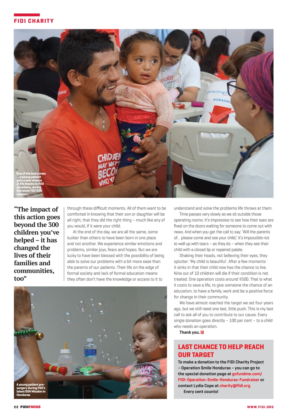 F ID I C H A RI T Y XXXXXXX One of the lucky ones ... a young patient gets a new chance at life thanks to FIDI donations, during the latest FIDI OSH mission The impact of this action goes beyond the 300 children youve helped it has changed the lives of their families and communities, too through these difficult moments. All of them want to be comforted in knowing that their son or daughter will be all right, that they did the right thing much like any of you would, if it were your child. At the end of the day, we are all the same, some luckier than others to have been born in one place and not another. We experience similar emotions and problems, similar joys, fears and hopes. But we are lucky to have been blessed with the possibility of being able to solve our problems with a bit more ease than the parents of our patients. Their life on the edge of formal society and lack of formal education means they often dont have the knowledge or access to it to understand and solve the problems life throws at them. Time passes very slowly as we sit outside those operating rooms. Its impressive to see how their eyes are fixed on the doors waiting for someone to come outwith news. And when you get the call to say:Willtheparents of please come and see your child, its impossible not to well up with tears as they do whenthey see their child with a closed lip or repaired palate. Shaking their heads, not believing their eyes, they splutter: My child is beautiful. After a few moments it sinks in that their child now has the chance to live. Nine out of 10 children will die if their condition is not treated. One operation costs around $500. That is what it costs to save a life, to give someone the chance of an education, to have a family, work and be a positive force for change in their community. We have almost reached the target we set four years ago, but we still need one last, little push. This is my last call to ask all of you to contribute to our cause. Every single donation goes directly 100 per cent to a child who needs an operation. Thank you. LAST CHANCE TO HELP REACH OUR TARGET A young patient presurgery during FIDIs latest OSH Mission in Honduras 22 FF290 pp20-23 Charity.indd 22 To make a donation to the FIDI Charity Project Operation Smile Honduras you can go to the special donation page at gofundme.com/ FIDI-Operation-Smile-Honduras-Fundraiser or contact Lydia Cope at charity@fidi.org Every cent counts! WWW. F I D I . OR G 13/03/2019 11:36