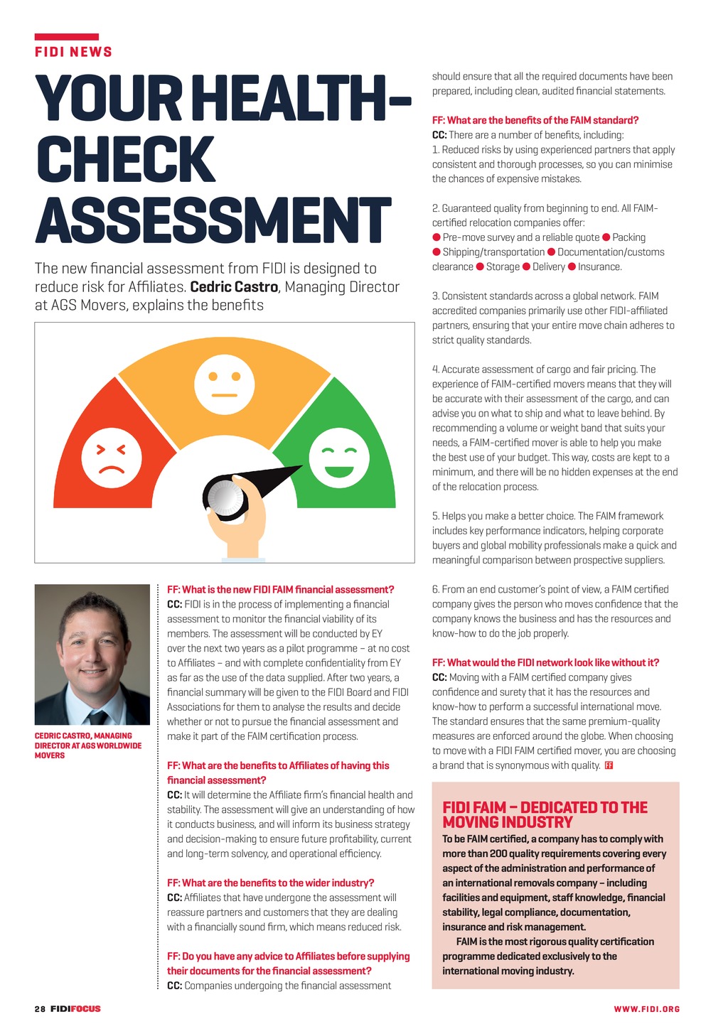 F ID I N E WS YOUR HEALTHCHECK ASSESSMENT The new financial assessment from FIDI is designed to reduce risk for Affiliates. Cedric Castro, Managing Director at AGS Movers, explains the benefits should ensure that all the required documents have been prepared, including clean, audited financial statements. FF: What are the benefits of the FAIM standard? CC: There are a number of benefits, including: 1. Reduced risks by using experienced partners that apply consistent and thorough processes, so you can minimise the chances of expensive mistakes. 2. Guaranteed quality from beginning to end. All FAIMcertified relocation companies offer: l Pre-move survey and a reliable quote l Packing l Shipping/transportation l Documentation/customs clearance l Storage l Delivery l Insurance. 3. Consistent standards across a global network. FAIM accredited companies primarily use other FIDI-affiliated partners, ensuring that your entire move chain adheres to strict quality standards. 4. Accurate assessment of cargo and fair pricing. The experience of FAIM-certified movers means that they will be accurate with their assessment of the cargo, and can advise you on what to ship and what to leave behind. By recommending a volume or weight band that suits your needs, a FAIM-certified mover is able to help you make the best use of your budget. This way, costs are kept to a minimum, and there will be no hidden expenses at the end of the relocation process. 5. Helps you make a better choice. The FAIM framework includes key performance indicators, helping corporate buyers and global mobility professionals make a quick and meaningful comparison between prospective suppliers. CEDRIC CASTRO, MANAGING DIRECTOR AT AGS WORLDWIDE MOVERS FF: What is the new FIDI FAIM financial assessment? CC: FIDI is in the process of implementing a financial assessment to monitor the financial viability of its members. The assessment will be conducted by EY overthe next two years as a pilot programme at no cost to Affiliates and with complete confidentiality from EY as far as the use of thedata supplied. After two years, a financial summary willbe given to the FIDI Board and FIDI Associations for themtoanalyse the results and decide whether or not topursue the financial assessment and make it part of theFAIM certification process. FF: What are the benefits to Affiliates of having this financial assessment? CC: It will determine the Affiliate firms financial health and stability. The assessment will give an understanding of how it conducts business, and will inform its business strategy and decision-making to ensure future profitability, current and long-term solvency, and operational efficiency. FF: What are the benefits to the wider industry? CC: Affiliates that have undergone the assessment will reassure partners and customers that they are dealing with a financially sound firm, which means reduced risk. FF: Do you have any advice to Affiliates before supplying their documents for the financial assessment? CC: Companies undergoing the financial assessment 28 FF290 pp28-29 FIDI News Cedric interview.indd 28 6. From an end customers point of view, a FAIM certified company gives the person who moves confidence that the company knows the business and has the resources and know-how to do the job properly. FF: What would the FIDI network look like without it? CC: Moving with a FAIM certified company gives confidence and surety that it has the resources and know-how to perform a successful international move. The standard ensures that the same premium-quality measures are enforced around the globe. When choosing to move with a FIDI FAIM certified mover, you are choosing a brand that is synonymous with quality. FIDI FAIM DEDICATED TO THE MOVING INDUSTRY To be FAIM certified, a company has to comply with more than 200 quality requirements covering every aspect of the administration and performance of an international removals company including facilities and equipment, staff knowledge, financial stability, legal compliance, documentation, insurance and risk management. FAIM is the most rigorous quality certification programme dedicated exclusively to the international moving industry. WWW. F I D I . OR G 13/03/2019 11:41