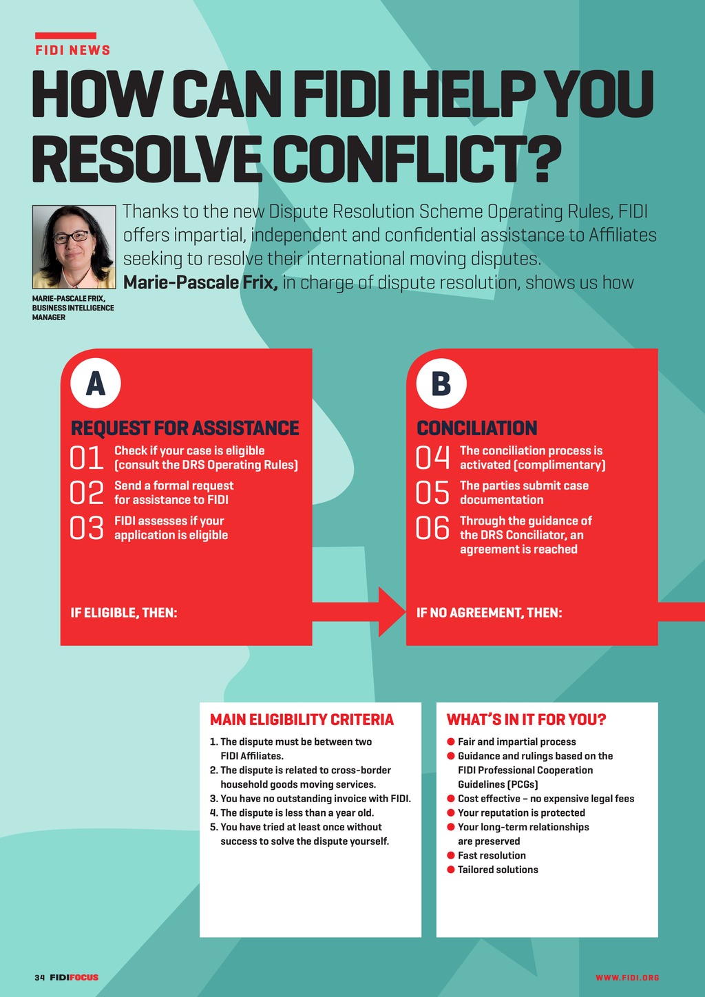FIDI NEWS HOW CAN FIDI HELP YOU RESOLVE CONFLICT? MARIE-PASCALE FRIX, BUSINESS INTELLIGENCE MANAGER Thanks to the new Dispute Resolution Scheme Operating Rules, FIDI offers impartial, independent and confidential assistance to Affiliates seeking to resolve their international moving disputes. Marie-Pascale Frix, in charge of dispute resolution, shows us how REQUEST FOR ASSISTANCE 01 02 03 Check if your case is eligible (consult the DRS Operating Rules) Send a formal request for assistance to FIDI FIDI assesses if your application is eligible FF290 pp34-35 Infographic V2.indd 34 04 05 06 The conciliation process is activated (complimentary) The parties submit case documentation Through the guidance of the DRS Conciliator, an agreement is reached IF ELIGIBLE, THEN: 34 CONCILIATION IF NO AGREEMENT, THEN: MAIN ELIGIBILITY CRITERIA WHATS IN IT FOR YOU? 1. The dispute must be between two FIDI Affiliates. 2. The dispute is related to cross-border household goods moving services. 3. You have no outstanding invoice with FIDI. 4. The dispute is less than a year old. 5. You have tried at least once without success to solve the dispute yourself. l Fair and impartial process lG uidance and rulings based on the FIDI Professional Cooperation Guidelines (PCGs) l Cost effective no expensive legal fees l Your reputation is protected lY our long-term relationships are preserved l Fast resolution l Tailored solutions WWW. F I D I . OR G 13/03/2019 11:47