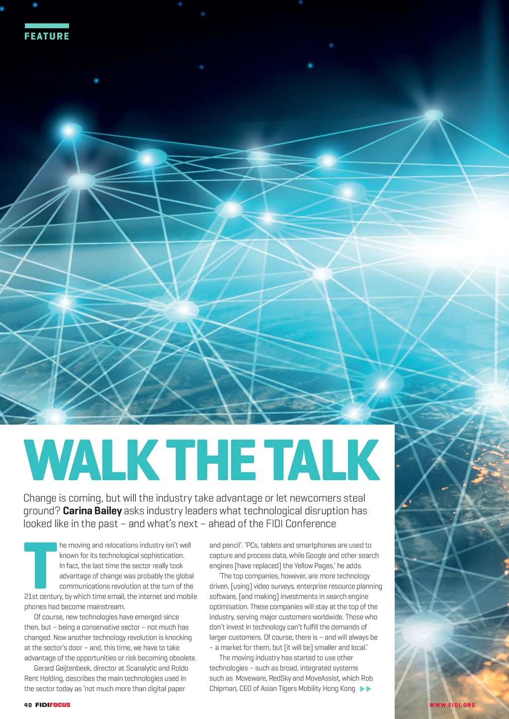 F E AT U RE WALK THE TALK Change is coming, but will the industry take advantage or let newcomers steal ground? Carina Bailey asks industry leaders what technological disruption has looked like in the past and whats next ahead of the FIDI Conference T he moving and relocations industry isnt well known for its technological sophistication. In fact, the last time the sector really took advantage of change was probably the global communications revolution at the turn of the 21st century, by which time email, the internet and mobile phones had become mainstream. Of course, new technologies have emerged since then, but being a conservative sector not much has changed. Now another technology revolution is knocking at the sectors door and, this time, we have to take advantage of the opportunities or risk becoming obsolete. Gerard Geijtenbeek, director at Scanalytic and Roldo Rent Holding, describes the main technologies used in the sector today as not much more than digital paper 40 FF290 pp40-47 Technology 1-Disruptors.indd 40 and pencil. PCs, tablets and smartphones are used to capture and process data, while Google and other search engines [have replaced] the Yellow Pages, he adds. The top companies, however, are more technology driven, [using] video surveys, enterprise resource planning software, [and making] investments in search engine optimisation. These companies will stay at the top of the industry, serving major customers worldwide. Those who dont invest in technology cant fulfill the demands of larger customers. Of course, there is and will always be a market for them, but [it will be] smaller and local. The moving industry has started to use other technologies such as broad, integrated systems such as Moveware, RedSky and MoveAssist, which Rob Chipman, CEO of Asian Tigers Mobility Hong Kong WWW. F I D I . OR G 13/03/2019 11:55