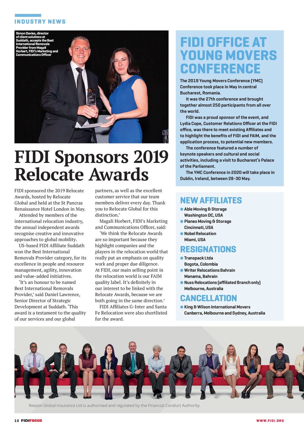 IN D U ST RY N EW S Simon Davies, director of client solutions at Suddath, accepts the Best International Removals Provider from Magali Horbert, FIDIs Marketing and Communications Officer FIDI OFFICE AT YOUNG MOVERS CONFERENCE FIDI Sponsors 2019 Relocate Awards FIDI sponsored the 2019 Relocate Awards, hosted by Relocate Global and held at the St Pancras Renaissance Hotel London in May. Attended by members of the international relocation industry, the annual independent awards recognise creative and innovative approaches to global mobility. US-based FIDI Afliate Suddath won the Best International Removals Provider category, for its excellence in people and resource management, agility, innovation and value-added initiatives. Its an honour to be named Best International Removals Provider, said Daniel Lawrence, Senior Director of Strategic Development at Suddath. This award is a testament to the quality of our services and our global partners, as well as the excellent customer service that our team members deliver every day. Thank you to Relocate Global for this distinction. Magali Horbert, FIDIs Marketing and Communications Ofcer, said: We think the Relocate Awards are so important because they highlight companies and the players in the relocation world that really put an emphasis on quality work and proper due diligence. At FIDI, our main selling point in the relocation world is our FAIM quality label. Its denitely in our interest to be linked with the Relocate Awards, because we are both going in the same direction. FIDI Afliates G-Inter and Santa Fe Relocation were also shortlisted for the award. The 2019 Young Movers Conference (YMC) Conference took place in May in central Bucharest, Romania. It was the 27th conference and brought together almost 250 participants from all over the world. FIDI was a proud sponsor of the event, and Lydia Cope, Customer Relations Officer at the FIDI office, was there to meet existing Affiliates and to highlight the benefits of FIDI and FAIM, and the application process, to potential new members. The conference featured a number of keynote speakers and cultural and social activities, including a visit to Bucharests Palace of the Parliament. The YMC Conference in 2020 will take place in Dublin, Ireland, between 28-30 May. NEW AFFILIATES Able Moving & Storage Washington DC, USA Planes Moving & Storage Cincinnati, USA Nobel Relocation Miami, USA RESIGNATIONS Transpack Ltda Bogota, Colombia Writer Relocations Bahrain Manama, Bahrain Nuss Relocations (affiliated Branch only) Melbourne, Australia CANCELLATION King & Wilson International Movers Canberra, Melbourne and Sydney, Australia Reason Global Insurance Ltd is authorised and regulated by the Financial Conduct Authority. 12 FF292 AugSep19 pp08-15 News.indd 12 WWW. F I D I . OR G 15/07/2019 14:39