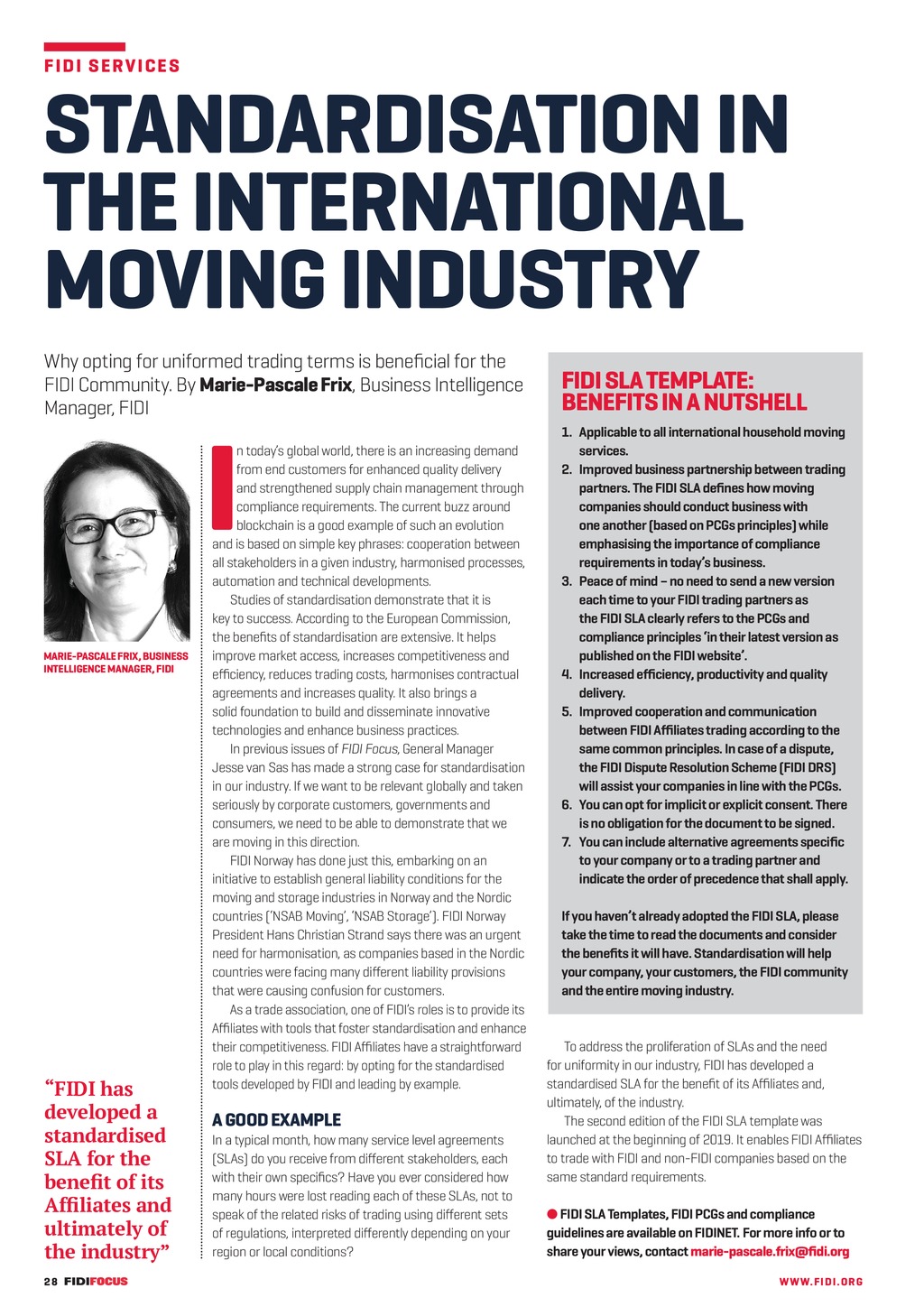 F ID I S E RV I C E S STANDARDISATION IN THE INTERNATIONAL MOVING INDUSTRY Why opting for uniformed trading terms is beneficial for the FIDI Community. By Marie-Pascale Frix, Business Intelligence Manager, FIDI I MARIE-PASCALE FRIX, BUSINESS INTELLIGENCE MANAGER, FIDI FIDI has developed a standardised SLA for the benefit of its Affiliates and ultimately of the industry n todays global world, there is an increasing demand from end customers for enhanced quality delivery and strengthened supply chain management through compliance requirements. The current buzz around blockchain is a good example of such an evolution and is based on simple key phrases: cooperation between all stakeholders in a given industry, harmonised processes, automation and technical developments. Studies of standardisation demonstrate that it is key to success. According to the European Commission, the benefits of standardisation are extensive. It helps improve market access, increases competitiveness and efficiency, reduces trading costs, harmonises contractual agreements and increases quality. It also brings a solid foundation to build and disseminate innovative technologies and enhance business practices. In previous issues of FIDI Focus, General Manager Jesse van Sas has made a strong case for standardisation in our industry. If we want to be relevant globally and taken seriously by corporate customers, governments and consumers, we need to be able to demonstrate that we are moving in this direction. FIDI Norway has done just this, embarking on an initiative to establish general liability conditions for the moving and storage industries in Norway and the Nordic countries (NSAB Moving, NSAB Storage). FIDI Norway President Hans Christian Strand says there was an urgent need for harmonisation, as companies based in the Nordic countries were facing many different liability provisions that were causing confusion for customers. As a trade association, one of FIDIs roles is to provide its Affiliates with tools that foster standardisation and enhance their competitiveness. FIDI Affiliates have a straightforward role to play in this regard: by opting for the standardised tools developed by FIDI and leading by example. A GOOD EXAMPLE In a typical month, how many service level agreements (SLAs) do you receive from different stakeholders, each with their own specifics? Have you ever considered how many hours were lost reading each of these SLAs, not to speak of the related risks of trading using different sets of regulations, interpreted differently depending on your region or local conditions? 28 FF292 AugSep19 pp28-29 Services Standardisation.indd 28 FIDI SLA TEMPLATE: BENEFITS IN A NUTSHELL 1.Applicable to all international household moving services. 2.Improved business partnership between trading partners. The FIDI SLA defines how moving companies should conduct business with one another (based on PCGs principles) while emphasising the importance of compliance requirements in todays business. 3.Peace of mind no need to send a new version each time to your FIDI trading partners as the FIDI SLA clearly refers to the PCGs and compliance principles in their latest version as published on the FIDI website. 4.Increased efficiency, productivity and quality delivery. 5.Improved cooperation and communication between FIDI Affiliates trading according to the same common principles. In case of a dispute, the FIDI DisputeResolution Scheme (FIDI DRS) will assist your companies in line withthe PCGs. 6.You can opt for implicit or explicit consent. There is no obligation for the document to be signed. 7.You can include alternative agreements specific to your company or to a trading partner and indicate the order of precedence that shall apply. If you havent already adopted the FIDI SLA, please take the timeto read the documents and consider the benefits it will have. Standardisation willhelp your company, your customers, the FIDI community and the entire moving industry. To address the proliferation of SLAs and the need for uniformity in our industry, FIDI has developed a standardised SLA for the benefit of its Affiliates and, ultimately, of the industry. The second edition of the FIDI SLA template was launched at the beginning of 2019. It enables FIDI Affiliates to trade with FIDI and non-FIDI companies based on the same standard requirements. l FIDI SLA Templates, FIDI PCGs and compliance guidelines are available on FIDINET. For more info or to share your views, contact marie-pascale.frix@fidi.org WWW. F I D I . OR G 15/07/2019 14:52