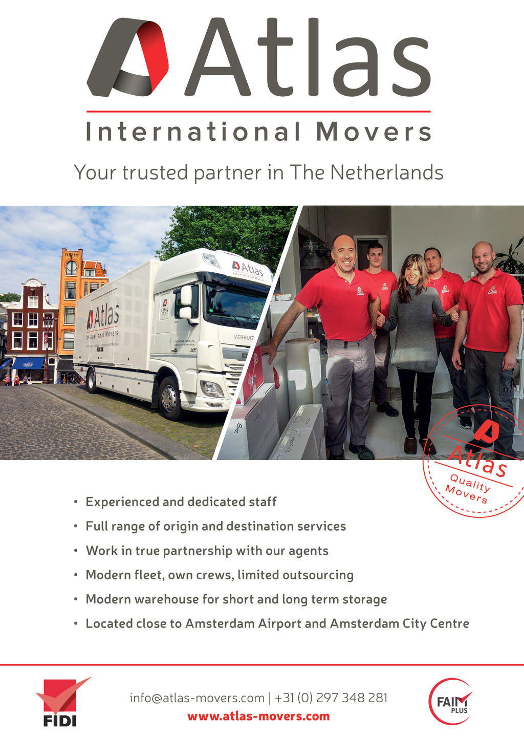 Your trusted partner in The Netherlands Experienced and dedicated staff Full range of origin and destination services Work in true partnership with our agents Modern fleet, own crews, limited outsourcing Modern warehouse for short and long term storage Located close to Amsterdam Airport and Amsterdam City Centre info@atlas-movers.com | +31 (0) 297 348 281 www.atlas-movers.com FF295 FebMar20 pp50-55 FAIM DSP.indd 50 20/01/2020 15:30