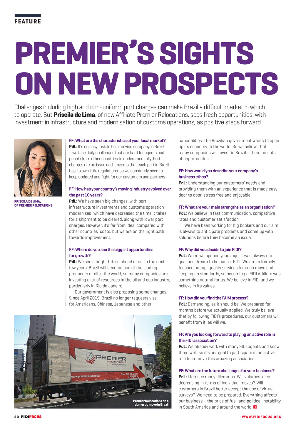 F E AT U RE PREMIERS SIGHTS ON NEW PROSPECTS Challenges including high and non-uniform port charges can make Brazil a difficult market in which to operate. But Priscila de Lima, of new Affiliate Premier Relocations, sees fresh opportunities, with investment in infrastructure and modernisation of customs operations, as positive steps forward FF: What are the characteristics of your local market? PdL: Its no easy task to be a moving company in Brazil we face daily challenges that are hard for agents and people from other countries to understand fully. Port charges are an issue and it seems that each port in Brazil has its own little regulations, so we constantly need to keep updated and fight for our customers and partners. PRISCILA DE LIMA, OF PREMIER RELOCATIONS FF: How has your countrys moving industry evolved over the past 10 years? PdL: We have seen big changes, with port infrastructure investments and customs operation modernised, which have decreased the time it takes for a shipment to be cleared, along with lower port charges. However, its far from ideal compared with other countries costs, but we are on the right path towards improvement. FF: Where do you see the biggest opportunities for growth? PdL: We see a bright future ahead of us. In the next few years, Brazil will become one of the leading producers of oil in the world, so many companies are investing a lot of resources in the oil and gas industry, particularly in Rio de Janeiro. Our government is also proposing some changes. Since April 2019, Brazil no longer requests visa for Americans, Chinese, Japanese and other nationalities. The Brazilian government wants to open up its economy to the world. So we believe that many companies will invest in Brazil there are lots of opportunities. FF: How would you describe your companys business ethos? PdL: Understanding our customers needs and providing them with an experience that is made easy door to door, stress free and enjoyable. FF: What are your main strengths as an organisation? PdL: We believe in fast communication, competitive rates and customer satisfaction. We have been working for big bookers and our aim is always to anticipate problems and come up with solutions before they become an issue. FF: Why did you decide to join FIDI? PdL: When we opened years ago, it was always our goal and dream to be part of FIDI. We are extremely focused on top-quality services for each move and keeping up standards, so becoming a FIDI Affiliate was something natural for us. We believe in FIDI and we believe in its values. FF: How did you find the FAIM process? PdL: Demanding, as it should be. We prepared for months before we actually applied. We truly believe that by following FIDIs procedures, our customers will benefit from it, as will we. FF: Are you looking forward to playing an active role in the FIDI association? PdL: We already work with many FIDI agents and know them well, so its our goal to participate in an active role to improve this amazing association. Premier Relocations on a domestic move in Brazil 80 FF295 FebMar20 pp80-81 New Affiliate.indd 80 FF: What are the future challenges for your business? PdL: I foresee many dilemmas. Will volumes keep decreasing in terms of individual moves? Will customers in Brazil better accept the use of virtual surveys? We need to be prepared. Everything affects our business the price of fuel, and political instability in South America and around the world. WW W. F I D I FOC U S . OR G 20/01/2020 15:43