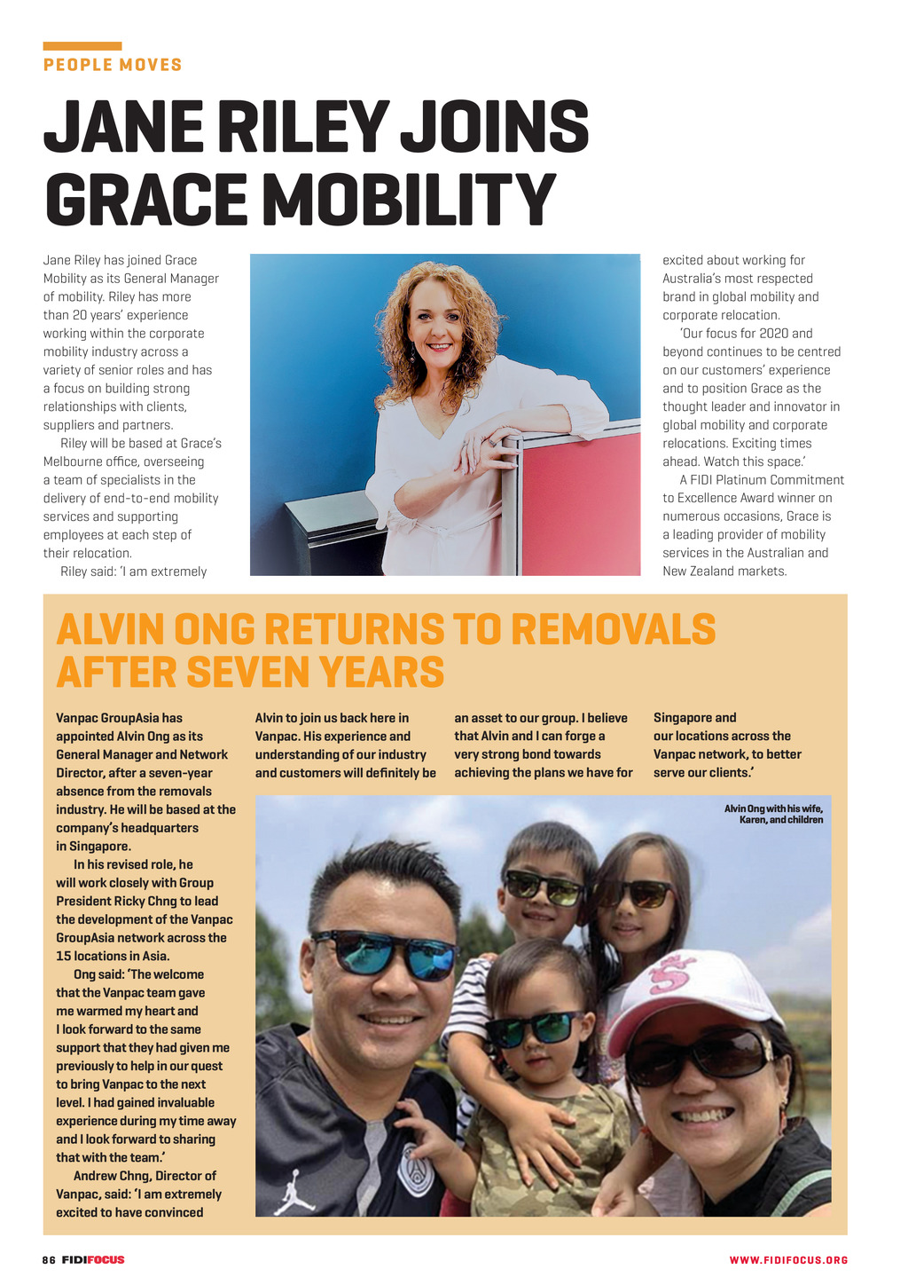 P E O P L E M OVES JANE RILEY JOINS GRACE MOBILITY excited about working for Australias most respected brand in global mobility and corporate relocation. Our focus for 2020 and beyond continues to be centred on our customers experience and to position Grace as the thought leader and innovator in global mobility and corporate relocations. Exciting times ahead. Watch this space. A FIDI Platinum Commitment to Excellence Award winner on numerous occasions, Grace is a leading provider of mobility services in the Australian and New Zealand markets. Jane Riley has joined Grace Mobility as its General Manager of mobility. Riley has more than 20 years experience working within the corporate mobility industry across a variety of senior roles and has a focus on building strong relationships with clients, suppliers and partners. Riley will be based at Graces Melbourne office, overseeing a team of specialists in the delivery of end-to-end mobility services and supporting employees at each step of their relocation. Riley said: I am extremely ALVIN ONG RETURNS TO REMOVALS AFTER SEVEN YEARS Vanpac GroupAsia has appointed Alvin Ong as its General Manager and Network Director, after a seven-year absence from the removals industry. He will be based at the companys headquarters in Singapore. In his revised role, he will work closely with Group President Ricky Chng to lead the development of the Vanpac GroupAsia network across the 15 locations in Asia. Ong said: The welcome that the Vanpac team gave me warmed my heart and I look forward to the same support that they had given me previously to help in our quest to bring Vanpac to the next level. I had gained invaluable experience during my time away and I look forward to sharing that with the team. Andrew Chng, Director of Vanpac, said: I am extremely excited to have convinced 86 FF295 FebMar20 pp82-87 People moves.indd 86 Alvin to join us back here in Vanpac. His experience and understanding of our industry and customers will definitely be an asset to our group. I believe that Alvin and I can forge a very strong bond towards achieving the plans we have for Singapore and our locations across the Vanpac network, to better serve our clients. Alvin Ong with his wife, Karen, and children WW W. F I D I FOC U S . OR G 20/01/2020 15:44