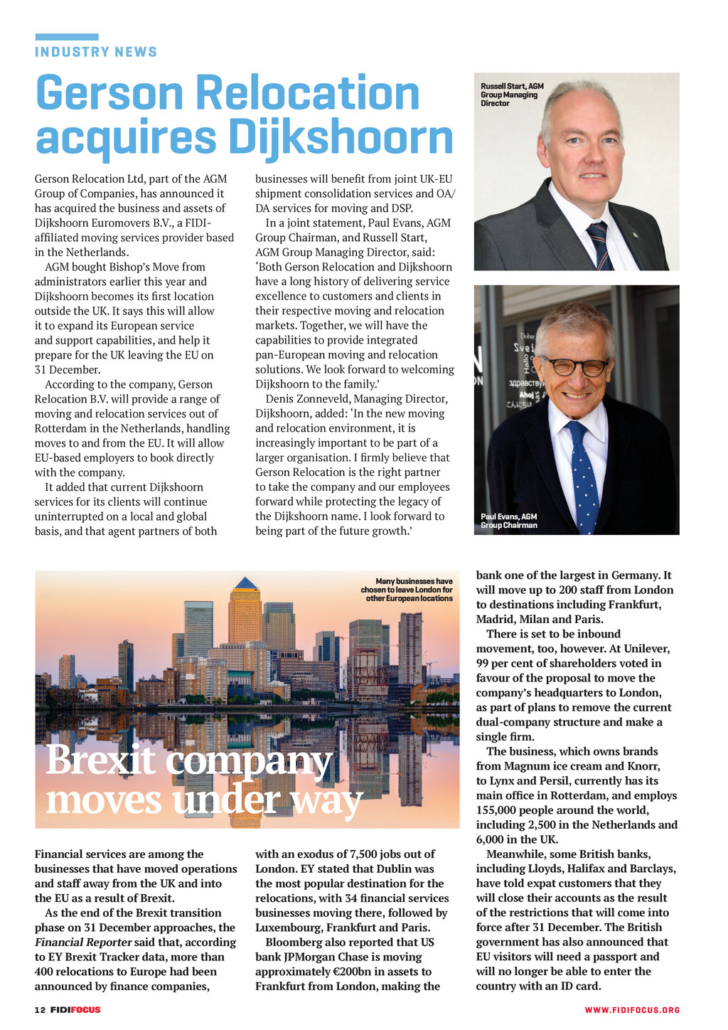 IN D U ST RY N EW S Gerson Relocation acquires Dijkshoorn Gerson Relocation Ltd, part of the AGM Group of Companies, has announced it has acquired the business and assets of Dijkshoorn Euromovers B.V., a FIDIaffiliated moving services provider based in the Netherlands. AGM bought Bishops Move from administrators earlier this year and Dijkshoorn becomes its first location outside the UK. It says this will allow it to expand its European service and support capabilities, and help it prepare for the UK leaving the EU on 31 December. According to the company, Gerson Relocation B.V. will provide a range of moving and relocation services out of Rotterdam in the Netherlands, handling moves to and from the EU. It will allow EU-based employers to book directly with the company. It added that current Dijkshoorn services for its clients will continue uninterrupted on a local and global basis, and that agent partners of both businesses will benefit from joint UK-EU shipment consolidation services and OA/ DA services for moving and DSP. In a joint statement, Paul Evans, AGM Group Chairman, and Russell Start, AGM Group Managing Director, said: Both Gerson Relocation and Dijkshoorn have a long history of delivering service excellence to customers and clients in their respective moving and relocation markets. Together, we will have the capabilities to provide integrated pan-European moving and relocation solutions. We look forward to welcoming Dijkshoorn to the family. Denis Zonneveld, Managing Director, Dijkshoorn, added: In the new moving and relocation environment, it is increasingly important to be part of a larger organisation. I firmly believe that Gerson Relocation is the right partner to take the company and our employees forward while protecting the legacy of the Dijkshoorn name. I look forward to being part of the future growth. Many businesses have chosen to leave London for other European locations Brexit company moves under way Financial services are among the businesses that have moved operations and staff away from the UK and into the EU as a result of Brexit. As the end of the Brexit transition phase on 31 December approaches, the Financial Reporter said that, according to EY Brexit Tracker data, more than 400 relocations to Europe had been announced by finance companies, 12 FF300 DecJan21 pp10-17 News.indd 12 with an exodus of 7,500 jobs out of London. EY stated that Dublin was the most popular destination for the relocations, with 34 financial services businesses moving there, followed by Luxembourg, Frankfurt and Paris. Bloomberg also reported that US bank JPMorgan Chase is moving approximately 200bn in assets to Frankfurt from London, making the Russell Start, AGM Group Managing Director Paul Evans, AGM Group Chairman bank one of the largest in Germany. It will move up to 200 staff from London to destinations including Frankfurt, Madrid, Milan and Paris. There is set to be inbound movement, too, however. At Unilever, 99 per cent of shareholders voted in favour of the proposal to move the companys headquarters to London, as part of plans to remove the current dual-company structure and make a single firm. The business, which owns brands from Magnum ice cream and Knorr, to Lynx and Persil, currently has its main office in Rotterdam, and employs 155,000 people around the world, including 2,500 in the Netherlands and 6,000 in the UK. Meanwhile, some British banks, including Lloyds, Halifax and Barclays, have told expat customers that they will close their accounts as the result of the restrictions that will come into force after 31 December. The British government has also announced that EU visitors will need a passport and will no longer be able to enter the country with an ID card. WW W. F I D I FOC U S . OR G 24/11/2020 11:53