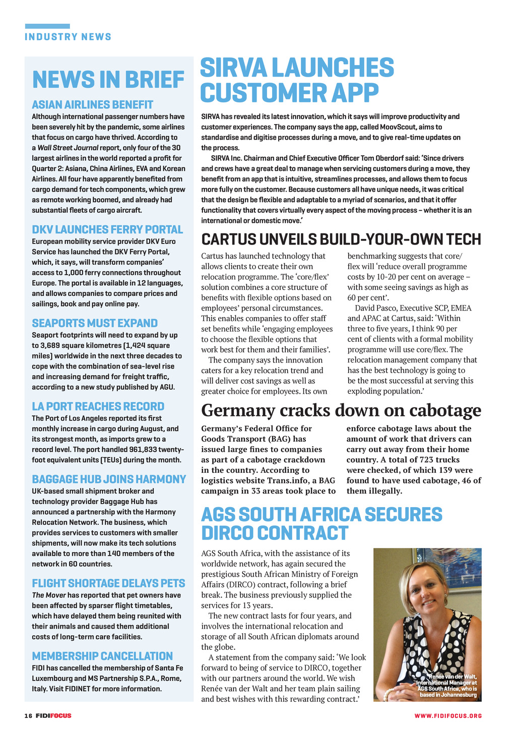 IN D U ST RY N EW S SIRVA LAUNCHES NEWS IN BRIEF CUSTOMER APP ASIAN AIRLINES BENEFIT Although international passenger numbers have been severely hit by the pandemic, some airlines that focus on cargo have thrived. According to a Wall Street Journal report, only four of the 30 largest airlines in the world reported a profit for Quarter 2: Asiana, China Airlines, EVA and Korean Airlines. All four have apparently benefited from cargo demand for tech components, which grew as remote working boomed, and already had substantial fleets of cargo aircraft. DKV LAUNCHES FERRY PORTAL European mobility service provider DKV Euro Service has launched the DKV Ferry Portal, which, it says, will transform companies access to 1,000 ferry connections throughout Europe. The portal is available in 12 languages, and allows companies to compare prices and sailings, book and pay online pay. SIRVA has revealed its latest innovation, which it says will improve productivity and customer experiences. The company says the app, called MoovScout, aims to standardise and digitise processes during a move, and to give real-time updates on the process. SIRVA Inc. Chairman and Chief Executive Ocer Tom Oberdorf said: Since drivers and crews have a great deal to manage when servicing customers during a move, they benefit from an app that is intuitive, streamlines processes, and allows them to focus more fully on the customer. Because customers all have unique needs, it was critical that the design be flexible and adaptable to a myriad of scenarios, and that it oer functionality that covers virtually every aspect of the moving process whether it is an international or domestic move. CARTUS UNVEILS BUILD-YOUR-OWN TECH benchmarking suggests that core/ flex will reduce overall programme costs by 10-20 per cent on average with some seeing savings as high as 60 per cent. David Pasco, Executive SCP, EMEA and APAC at Cartus, said: Within three to five years, I think 90 per cent of clients with a formal mobility programme will use core/flex. The relocation management company that has the best technology is going to be the most successful at serving this exploding population. SEAPORTS MUST EXPAND Cartus has launched technology that allows clients to create their own relocation programme. The core/flex solution combines a core structure of benefits with flexible options based on employees personal circumstances. This enables companies to offer staff set benefits while engaging employees to choose the flexible options that work best for them and their families. The company says the innovation caters for a key relocation trend and will deliver cost savings as well as greater choice for employees. Its own LA PORT REACHES RECORD Germany cracks down on cabotage Seaport footprints will need to expand by up to 3,689 square kilometres (1,424 square miles) worldwide in the next three decades to cope with the combination of sea-level rise and increasing demand for freight trac, according to a new study published by AGU. The Port of Los Angeles reported its first monthly increase in cargo during August, and its strongest month, as imports grew to a record level. The port handled 961,833 twentyfoot equivalent units (TEUs) during the month. BAGGAGE HUB JOINS HARMONY UK-based small shipment broker and technology provider Baggage Hub has announced a partnership with the Harmony Relocation Network. The business, which provides services to customers with smaller shipments, will now make its tech solutions available to more than 140 members of the network in 60 countries. FLIGHT SHORTAGE DELAYS PETS The Mover has reported that pet owners have been aected by sparser flight timetables, which have delayed them being reunited with their animals and caused them additional costs of long-term care facilities. MEMBERSHIP CANCELLATION FIDI has cancelled the membership of Santa Fe Luxembourg and MS Partnership S.P.A., Rome, Italy. Visit FIDINET for more information. 16 FF300 DecJan21 pp10-17 News.indd 16 Germanys Federal Office for Goods Transport (BAG) has issued large fines to companies as part of a cabotage crackdown in the country. According to logistics website Trans.info, a BAG campaign in 33 areas took place to enforce cabotage laws about the amount of work that drivers can carry out away from their home country. A total of 723 trucks were checked, of which 139 were found to have used cabotage, 46 of them illegally. AGS SOUTH AFRICA SECURES DIRCO CONTRACT AGS South Africa, with the assistance of its worldwide network, has again secured the prestigious South African Ministry of Foreign Affairs (DIRCO) contract, following a brief break. The business previously supplied the services for 13 years. The new contract lasts for four years, and involves the international relocation and storage of all South African diplomats around the globe. A statement from the company said: We look forward to being of service to DIRCO, together with our partners around the world. We wish Rene van der Walt and her team plain sailing and best wishes with this rewarding contract. Rene van der Walt, International Manager at AGS South Africa, who is based in Johannesburg WW W. F I D I FOC U S . OR G 24/11/2020 11:53