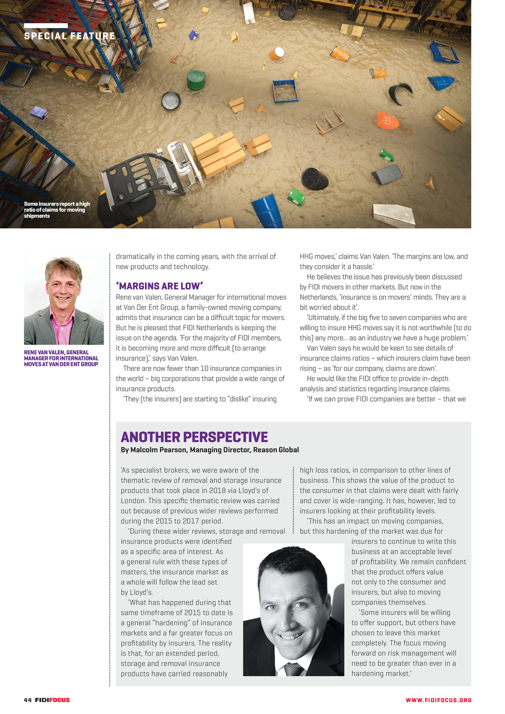 S P E C I A L F E ATURE Some insurers report a high ratio of claims for moving shipments dramatically in the coming years, with the arrival of new products and technology. MARGINS ARE LOW RENE VAN VALEN, GENERAL MANAGER FOR INTERNATIONAL MOVES AT VAN DER ENT GROUP Rene van Valen, General Manager for international moves at Van Der Ent Group, a family-owned moving company, admits that insurance can be a dicult topic for movers. But he is pleased that FIDI Netherlands is keeping the issue on the agenda. For the majority of FIDI members, it is becoming more and more dicult (to arrange insurance), says Van Valen. There are now fewer than 10 insurance companies in the world big corporations that provide a wide range of insurance products. They (the insurers) are starting to dislike insuring HHG moves, claims Van Valen. The margins are low, and they consider it a hassle. He believes the issue has previously been discussed by FIDI movers in other markets. But now in the Netherlands, insurance is on movers minds. They are a bit worried about it. Ultimately, if the big five to seven companies who are willing to insure HHG moves say it is not worthwhile (to do this) any more... as an industry we have a huge problem. Van Valen says he would be keen to see details of insurance claims ratios which insurers claim have been rising as for our company, claims are down. He would like the FIDI oce to provide in-depth analysis and statistics regarding insurance claims. If we can prove FIDI companies are better that we ANOTHER PERSPECTIVE By Malcolm Pearson, Managing Director, Reason Global As specialist brokers, we were aware of the thematic review of removal and storage insurance products that took place in 2018 via Lloyds of London. This specific thematic review was carried out because of previous wider reviews performed during the 2015 to 2017 period. During these wider reviews, storage and removal insurance products were identified as a specific area of interest. As a general rule with these types of matters, the insurance market as a whole will follow the lead set by Lloyds. What has happened during that same timeframe of 2015 to date is a general hardening of insurance markets and a far greater focus on profitability by insurers. The reality is that, for an extended period, storage and removal insurance products have carried reasonably 44 FF300 DecJan21 pp42-45 Feature.indd 44 high loss ratios, in comparison to other lines of business. This shows the value of the product to the consumer in that claims were dealt with fairly and cover is wide-ranging. It has, however, led to insurers looking at their profitability levels. This has an impact on moving companies, but this hardening of the market was due for insurers to continue to write this business at an acceptable level of profitability. We remain confident that the product oers value not only to the consumer and insurers, but also to moving companies themselves. Some insurers will be willing to oer support, but others have chosen to leave this market completely. The focus moving forward on risk management will need to be greater than ever in a hardening market. WW W. F I D I FOC U S . OR G 24/11/2020 11:22