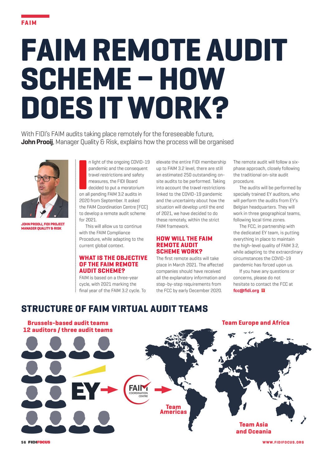 FA IM FAIM REMOTE AUDIT SCHEME HOW DOES IT WORK? With FIDIs FAIM audits taking place remotely for the foreseeable future, John Prooij, Manager Quality & Risk, explains how the process will be organised I JOHN PROOIJ, FIDI PROJECT MANAGER QUALITY & RISK n light of the ongoing COVID-19 pandemic and the consequent travel restrictions and safety measures, the FIDI Board decided to put a moratorium on all pending FAIM 3.2 audits in 2020 from September. It asked the FAIM Coordination Centre (FCC) to develop a remote audit scheme for 2021. This will allow us to continue with the FAIM Compliance Procedure, while adapting to the current global context. WHAT IS THE OBJECTIVE OF THE FAIM REMOTE AUDIT SCHEME? FAIM is based on a three-year cycle, with 2021 marking the final year of the FAIM 3.2 cycle. To elevate the entire FIDI membership up to FAIM 3.2 level, there are still an estimated 250 outstanding onsite audits to be performed. Taking into account the travel restrictions linked to the COVID-19 pandemic and the uncertainty about how the situation will develop until the end of 2021, we have decided to do these remotely, within the strict FAIM framework. HOW WILL THE FAIM REMOTE AUDIT SCHEME WORK? The first remote audits will take place in March 2021. The aected companies should have received all the explanatory information and step-by-step requirements from the FCC by early December 2020. The remote audit will follow a sixphase approach, closely following the traditional on-site audit procedure. The audits will be performed by specially trained EY auditors, who will perform the audits from EYs Belgian headquarters. They will work in three geographical teams, following local time zones. The FCC, in partnership with the dedicated EY team, is putting everything in place to maintain the high-level quality of FAIM 3.2, while adapting to the extraordinary circumstances the COVID-19 pandemic has forced upon us. If you have any questions or concerns, please do not hesitate to contact the FCC at fcc@fidi.org STRUCTURE OF FAIM VIRTUAL AUDIT TEAMS Team Europe and Africa Brussels-based audit teams 12 auditors / three audit teams Team Americas Team Asia and Oceania 56 FF300 DecJan21 pp56-57 FAIM.indd 56 WWW. F I D I FOC U S . OR G 24/11/2020 15:34
