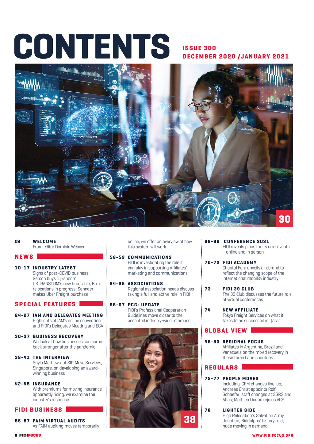 CONTENTS IS S UE 3 0 0 DEC EMBER 2 0 2 0 /JA NUARY 2 0 2 1 30 09 W ELC O ME From editor Dominic Weaver NE W S 10-1 7 I ND U ST RY L AT E ST Signs of post-COVID business; Gerson buys Dijkshoorn; USTRANSCOM s new timetable; Brexit relocations in progress; Sennder makes Uber Freight purchase S P E C I A L FE ATUR ES 24- 2 7 IAM AND DELEGATES MEETING Highlights of IAMs online convention and FIDIs Delegates Meeting and EGA online, we oer an overview of how this system will work 58- 59 C OM M UN IC ATION S FIDI is investigating the role it can play in supporting Aliates marketing and communications 64- 65 ASSOC IATION S Regional association heads discuss taking a full and active role in FIDI 66- 67 PC G S UPDATE FIDI s Professional Cooperation Guidelines move closer to the accepted industry-wide reference 68-69 C ON F E R E N C E 2021 FIDI reveals plans for its next events online and in person 70-72 FIDI ACADEMY Chantal Fera unveils a rebrand to reflect the changing scope of the international mobility industry 73 F IDI 39 C L UB The 39 Club discusses the future role of virtual conferences 74 N E W A F F IL IATE Tokyo Freight Services on what it takes to be successful in Qatar G LOBA L V IEW 30- 3 7 B U S I N E S S R E C OV E RY We look at how businesses can come back stronger after the pandemic 46-53 REGIONAL FOCUS Aliates in Argentina, Brazil and Venezuela on the mixed recovery in these three Latin countries 38- 4 1 T HE I NT ERV I E W Shyla Mathews, of SIR Move Services, Singapore, on developing an awardwinning business REGULA RS 42-4 5 I NS U R A NCE With premiums for moving insurance apparently rising, we examine the industrys response 75-77 PE OPL E M OV E S Including: CFM changes line-up; Andreas Christ appoints Rolf Schaefer; sta changes at SGRS and Atlas; Mathieu Dunod rejoins AGS F IDI B U S I N E SS 78 56- 5 7 FAI M VI RTUA L AUDI TS As FAIM auditing moves temporarily 6 FF300 DecJan21 pp06-07 Contents.indd 6 38 L IGH TE R SIDE High Relocation s Salvation Army donation; Biddulphs history told; nude moving in demand WW W. F I D I FOC U S . OR G 24/11/2020 10:41