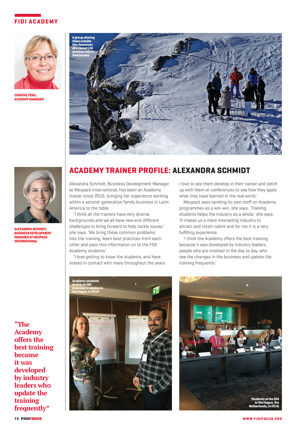 F ID I AC A D E M Y A group sharing ideas outside the classroom at a recent LiM seminar held in Switzerland CHANTAL FERA, ACADEMY MANAGER ACADEMY TRAINER PROFILE: ALEXANDRA SCHMIDT ALEXANDRA SCHMIDT, BUSINESS DEVELOPMENT MANAGER AT MEXPACK INTERNATIONAL Alexandra Schmidt, Business Development Manager at Mexpack International, has been an Academy trainer since 2016, bringing her experience working within a second-generation family business in Latin America to the table. I think all the trainers have very diverse backgrounds and we all have new and dierent challenges to bring forward to help tackle issues, she says. We bring these common problems into the training, learn best practices from each other and pass this information on to the FIDI Academy students. I love getting to know the students, and have stayed in contact with many throughout the years. I love to see them develop in their career and catch up with them at conferences to see how they apply what they have learned in the real world. Mexpack sees sending its own sta on Academy programmes as a win-win, she says. Training students helps the industry as a whole, she says. It makes us a more interesting industry to attract and retain talent and for me it is a very fulfilling experience. I think the Academy oers the best training because it was developed by industry leaders, people who are involved in the day to day, who see the changes in the business and update the training frequently. Academy students during an EiM brainstorm session in the Hague, in 2016 The Academy offers the best training because it was developed by industry leaders who update the training frequently 72 FF300 DecJan21 pp70-72 FIDI Academy.indd 72 Students at the EiM in the Hague, the Netherlands, in 2016 WW W. F I D I FOC U S . OR G 24/11/2020 15:34