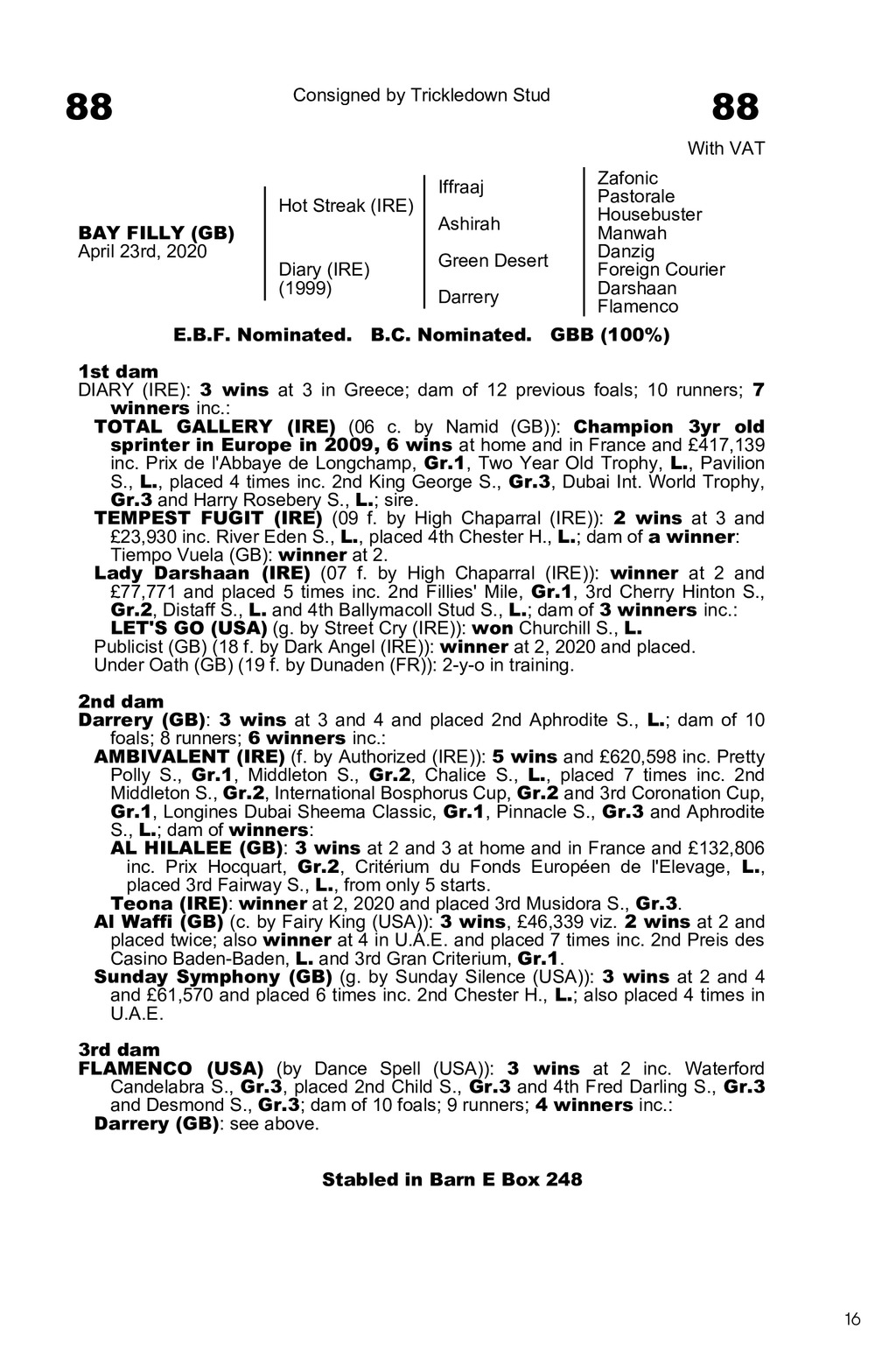 0335W62.GUI 00Diary (IRE)|2020|F|A|2750221 88 88 Consigned by Trickledown Stud With VAT Hot Streak (IRE) BAY FILLY (GB) April 23rd, 2020 Diary (IRE) (1999) Iffraaj Ashirah Green Desert Darrery Zafonic Pastorale Housebuster Manwah Danzig Foreign Courier Darshaan Flamenco E.B.F. Nominated. B.C. Nominated. GBB (100%) 1st dam DIARY (IRE): 3 wins at 3 in Greece; dam of 12 previous foals; 10 runners; 7 winners inc.: TOTAL GALLERY (IRE) (06 c. by Namid (GB)): Champion 3yr old sprinter in Europe in 2009, 6 wins at home and in France and 417,139 inc. Prix de l Abbaye de Longchamp, Gr.1, Two Year Old Trophy, L., Pavilion S., L., placed 4 times inc. 2nd King George S., Gr.3, Dubai Int. World Trophy, Gr.3 and Harry Rosebery S., L.; sire. TEMPEST FUGIT (IRE) (09 f. by High Chaparral (IRE)): 2 wins at 3 and 23,930 inc. River Eden S., L., placed 4th Chester H., L.; dam of a winner: Tiempo Vuela (GB): winner at 2. Lady Darshaan (IRE) (07 f. by High Chaparral (IRE)): winner at 2 and 77,771 and placed 5 times inc. 2nd Fillies Mile, Gr.1, 3rd Cherry Hinton S., Gr.2, Distaff S., L. and 4th Ballymacoll Stud S., L.; dam of 3 winners inc.: LET S GO (USA) (g. by Street Cry (IRE)): won Churchill S., L. Publicist (GB) (18 f. by Dark Angel (IRE)): winner at 2, 2020 and placed. Under Oath (GB) (19 f. by Dunaden (FR)): 2-y-o in training. 2nd dam Darrery (GB): 3 wins at 3 and 4 and placed 2nd Aphrodite S., L.; dam of 10 foals; 8 runners; 6 winners inc.: AMBIVALENT (IRE) (f. by Authorized (IRE)): 5 wins and 620,598 inc. Pretty Polly S., Gr.1, Middleton S., Gr.2, Chalice S., L., placed 7 times inc. 2nd Middleton S., Gr.2, International Bosphorus Cup, Gr.2 and 3rd Coronation Cup, Gr.1, Longines Dubai Sheema Classic, Gr.1, Pinnacle S., Gr.3 and Aphrodite S., L.; dam of winners: AL HILALEE (GB): 3 wins at 2 and 3 at home and in France and 132,806 inc. Prix Hocquart, Gr.2, Critrium du Fonds Europen de l Elevage, L., placed 3rd Fairway S., L., from only 5 starts. Teona (IRE): winner at 2, 2020 and placed 3rd Musidora S., Gr.3. Al Waffi (GB) (c. by Fairy King (USA)): 3 wins, 46,339 viz. 2 wins at 2 and placed twice; also winner at 4 in U.A.E. and placed 7 times inc. 2nd Preis des Casino Baden-Baden, L. and 3rd Gran Criterium, Gr.1. Sunday Symphony (GB) (g. by Sunday Silence (USA)): 3 wins at 2 and 4 and 61,570 and placed 6 times inc. 2nd Chester H., L.; also placed 4 times in U.A.E. 3rd dam FLAMENCO (USA) (by Dance Spell (USA)): 3 wins at 2 inc. Waterford Candelabra S., Gr.3, placed 2nd Child S., Gr.3 and 4th Fred Darling S., Gr.3 and Desmond S., Gr.3; dam of 10 foals; 9 runners; 4 winners inc.: Darrery (GB): see above. Stabled in Barn Box Stabled in Barn E Box 248 16