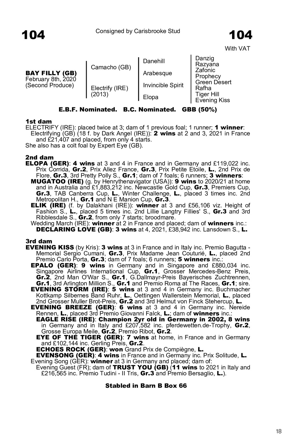 0030Z70.GUI 00Electrify (IRE)|2020|F|A|2741423 104 104 Consigned by Carisbrooke Stud With VAT BAY FILLY (GB) February 8th, 2020 (Second Produce) Camacho (GB) Electrify (IRE) (2013) Danehill Arabesque Invincible Spirit Elopa Danzig Razyana Zafonic Prophecy Green Desert Rafha Tiger Hill Evening Kiss E.B.F. Nominated. B.C. Nominated. GBB (50%) 1st dam ELECTRIFY (IRE): placed twice at 3; dam of 1 previous foal; 1 runner; 1 winner: Electrifying (GB) (18 f. by Dark Angel (IRE)): 2 wins at 2 and 3, 2021 in France and 21,407 and placed, from only 4 starts. She also has a colt foal by Expert Eye (GB). 2nd dam ELOPA (GER): 4 wins at 3 and 4 in France and in Germany and 119,022 inc. Prix Corrida, Gr.2, Prix Allez France, Gr.3, Prix Petite Etoile, L., 2nd Prix de Flore, Gr.3, 3rd Pretty Polly S., Gr.1; dam of 7 foals; 6 runners; 3 winners: MUGATOO (IRE) (g. by Henrythenavigator (USA)): 9 wins to 2020/21 at home and in Australia and 1,883,212 inc. Newcastle Gold Cup, Gr.3, Premiers Cup, Gr.3, TAB Canberra Cup, L., Winter Challenge, L., placed 3 times inc. 2nd Metropolitan H., Gr.1 and N E Manion Cup, Gr.3. ELIK (IRE) (f. by Dalakhani (IRE)): winner at 3 and 56,106 viz. Height of Fashion S., L., placed 5 times inc. 2nd Lillie Langtry Fillies S., Gr.3 and 3rd Ribblesdale S., Gr.2, from only 7 starts; broodmare. Wedding March (IRE): winner at 2 in France and placed; dam of winners inc.: DECLARING LOVE (GB): 3 wins at 4, 2021, 38,942 inc. Lansdown S., L. 3rd dam EVENING KISS (by Kris): 3 wins at 3 in France and in Italy inc. Premio Bagutta Memorial Sergio Cumani, Gr.3, Prix Madame Jean Couturi, L., placed 2nd Premio Carlo Porta, Gr.3; dam of 7 foals; 6 runners; 5 winners inc.: EPALO (GER): 9 wins in Germany and in Singapore and 880,034 inc. Singapore Airlines International Cup, Gr.1, Grosser Mercedes-Benz Preis, Gr.2, 2nd Man O War S., Gr.1, G.Dallmayr-Preis Bayerisches Zuchtrennen, Gr.1, 3rd Arlington Million S., Gr.1 and Premio Roma at The Races, Gr.1; sire. EVENING STORM (IRE): 5 wins at 3 and 4 in Germany inc. Buchmacher Kottkamp Silbernes Band Ruhr, L., Oettingen Wallerstein Memorial, L., placed 2nd Grosser Muller Brot-Preis, Gr.2 and 3rd Helmut von Finck Stehercup, L. EVENING BREEZE (GER): 6 wins at 3 and 4 in Germany inc. Nereide Rennen, L., placed 3rd Premio Giovanni Falck, L.; dam of winners inc.: EAGLE RISE (IRE): Champion 2yr old in Germany in 2002, 8 wins in Germany and in Italy and 207,582 inc. pferdewetten.de-Trophy, Gr.2, Grosse Europa Meile, Gr.2, Premio Ribot, Gr.2. EYE OF THE TIGER (GER): 7 wins at home, in France and in Germany and 102,144 inc. Gerling Preis, Gr.2. ECHOES ROCK (GER): won Grand Prix de Compigne, L. EVENSONG (GER): 4 wins in France and in Germany inc. Prix Solitude, L. Evening Song (GER): winner at 3 in Germany and placed; dam of: Evening Guest (FR); dam of TRUST YOU (GB) (11 wins to 2021 in Italy and 216,565 inc. Premio Tudini - II Tris, Gr.3 and Premio Bersaglio, L.). Stabled in Barn Box Stabled in Barn B Box 66 18