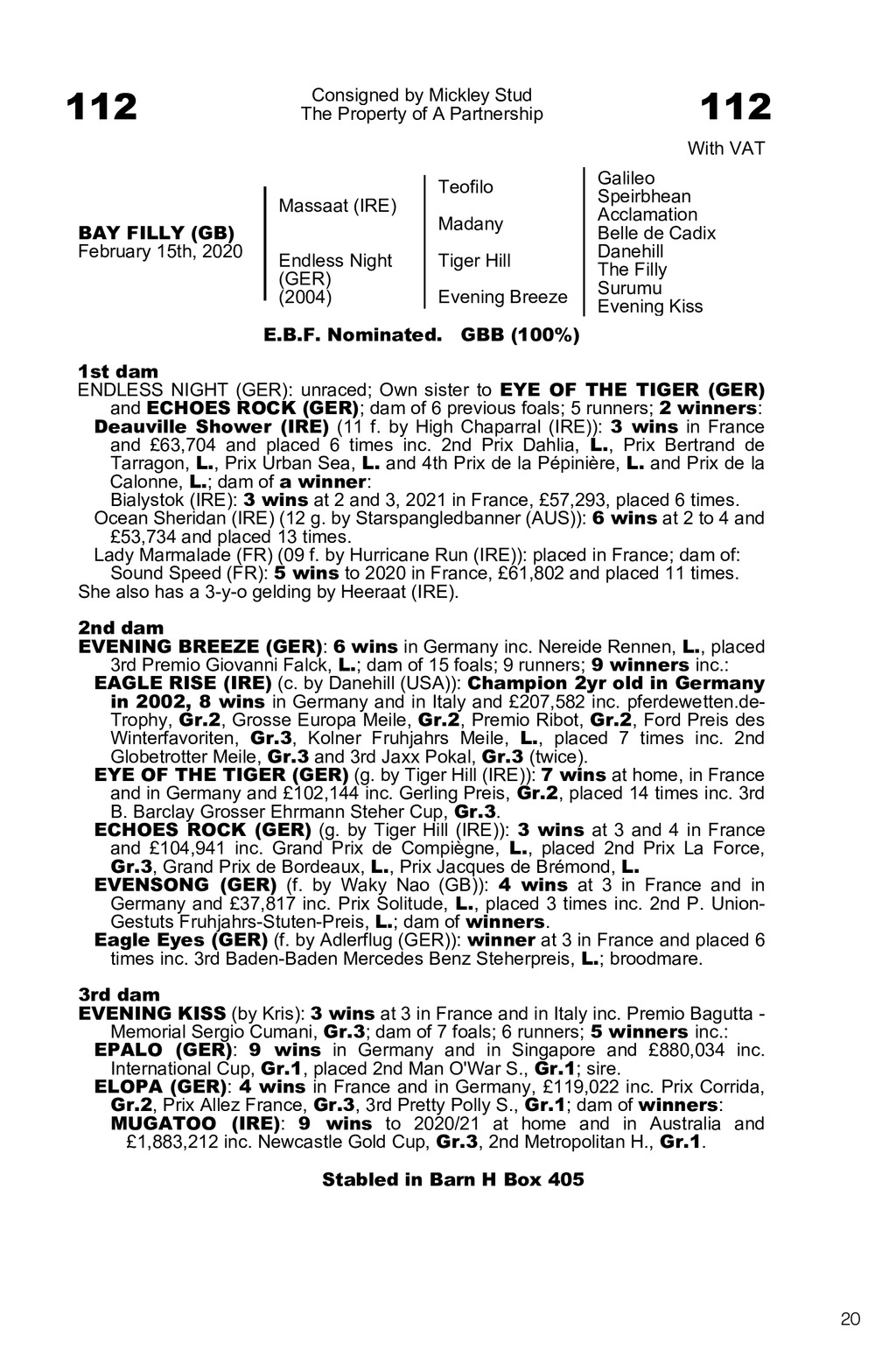 0067Z33.GUI 00Endless Night (GER)|2020|F|A|2742019 112 Consigned by Mickley Stud The Property of A Partnership 112 With VAT Massaat (IRE) BAY FILLY (GB) February 15th, 2020 Endless Night (GER) (2004) Teofilo Madany Tiger Hill Evening Breeze Galileo Speirbhean Acclamation Belle de Cadix Danehill The Filly Surumu Evening Kiss E.B.F. Nominated. GBB (100%) 1st dam ENDLESS NIGHT (GER): unraced; Own sister to EYE OF THE TIGER (GER) and ECHOES ROCK (GER); dam of 6 previous foals; 5 runners; 2 winners: Deauville Shower (IRE) (11 f. by High Chaparral (IRE)): 3 wins in France and 63,704 and placed 6 times inc. 2nd Prix Dahlia, L., Prix Bertrand de Tarragon, L., Prix Urban Sea, L. and 4th Prix de la Ppinire, L. and Prix de la Calonne, L.; dam of a winner: Bialystok (IRE): 3 wins at 2 and 3, 2021 in France, 57,293, placed 6 times. Ocean Sheridan (IRE) (12 g. by Starspangledbanner (AUS)): 6 wins at 2 to 4 and 53,734 and placed 13 times. Lady Marmalade (FR) (09 f. by Hurricane Run (IRE)): placed in France; dam of: Sound Speed (FR): 5 wins to 2020 in France, 61,802 and placed 11 times. She also has a 3-y-o gelding by Heeraat (IRE). 2nd dam EVENING BREEZE (GER): 6 wins in Germany inc. Nereide Rennen, L., placed 3rd Premio Giovanni Falck, L.; dam of 15 foals; 9 runners; 9 winners inc.: EAGLE RISE (IRE) (c. by Danehill (USA)): Champion 2yr old in Germany in 2002, 8 wins in Germany and in Italy and 207,582 inc. pferdewetten.deTrophy, Gr.2, Grosse Europa Meile, Gr.2, Premio Ribot, Gr.2, Ford Preis des Winterfavoriten, Gr.3, Kolner Fruhjahrs Meile, L., placed 7 times inc. 2nd Globetrotter Meile, Gr.3 and 3rd Jaxx Pokal, Gr.3 (twice). EYE OF THE TIGER (GER) (g. by Tiger Hill (IRE)): 7 wins at home, in France and in Germany and 102,144 inc. Gerling Preis, Gr.2, placed 14 times inc. 3rd B. Barclay Grosser Ehrmann Steher Cup, Gr.3. ECHOES ROCK (GER) (g. by Tiger Hill (IRE)): 3 wins at 3 and 4 in France and 104,941 inc. Grand Prix de Compigne, L., placed 2nd Prix La Force, Gr.3, Grand Prix de Bordeaux, L., Prix Jacques de Brmond, L. EVENSONG (GER) (f. by Waky Nao (GB)): 4 wins at 3 in France and in Germany and 37,817 inc. Prix Solitude, L., placed 3 times inc. 2nd P. UnionGestuts Fruhjahrs-Stuten-Preis, L.; dam of winners. Eagle Eyes (GER) (f. by Adlerflug (GER)): winner at 3 in France and placed 6 times inc. 3rd Baden-Baden Mercedes Benz Steherpreis, L.; broodmare. 3rd dam EVENING KISS (by Kris): 3 wins at 3 in France and in Italy inc. Premio Bagutta Memorial Sergio Cumani, Gr.3; dam of 7 foals; 6 runners; 5 winners inc.: EPALO (GER): 9 wins in Germany and in Singapore and 880,034 inc. International Cup, Gr.1, placed 2nd Man O War S., Gr.1; sire. ELOPA (GER): 4 wins in France and in Germany, 119,022 inc. Prix Corrida, Gr.2, Prix Allez France, Gr.3, 3rd Pretty Polly S., Gr.1; dam of winners: MUGATOO (IRE): 9 wins to 2020/21 at home and in Australia and 1,883,212 inc. Newcastle Gold Cup, Gr.3, 2nd Metropolitan H., Gr.1. Stabled in Barn Box Stabled in Barn H Box 405 20