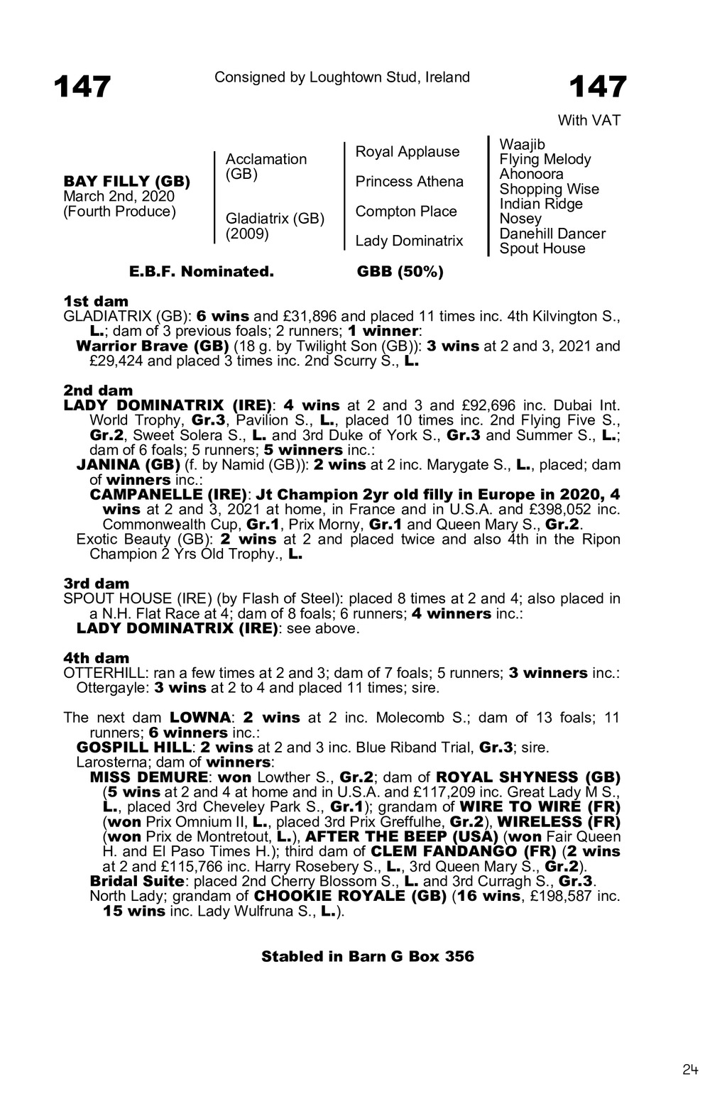 0002Z98.GUI 00Gladiatrix (GB)|2020|F|A|2745443 147 Consigned by Loughtown Stud, Ireland 147 With VAT BAY FILLY (GB) March 2nd, 2020 (Fourth Produce) Acclamation (GB) Royal Applause Gladiatrix (GB) (2009) Compton Place E.B.F. Nominated. Princess Athena Lady Dominatrix Waajib Flying Melody Ahonoora Shopping Wise Indian Ridge Nosey Danehill Dancer Spout House GBB (50%) 1st dam GLADIATRIX (GB): 6 wins and 31,896 and placed 11 times inc. 4th Kilvington S., L.; dam of 3 previous foals; 2 runners; 1 winner: Warrior Brave (GB) (18 g. by Twilight Son (GB)): 3 wins at 2 and 3, 2021 and 29,424 and placed 3 times inc. 2nd Scurry S., L. 2nd dam LADY DOMINATRIX (IRE): 4 wins at 2 and 3 and 92,696 inc. Dubai Int. World Trophy, Gr.3, Pavilion S., L., placed 10 times inc. 2nd Flying Five S., Gr.2, Sweet Solera S., L. and 3rd Duke of York S., Gr.3 and Summer S., L.; dam of 6 foals; 5 runners; 5 winners inc.: JANINA (GB) (f. by Namid (GB)): 2 wins at 2 inc. Marygate S., L., placed; dam of winners inc.: CAMPANELLE (IRE): Jt Champion 2yr old filly in Europe in 2020, 4 wins at 2 and 3, 2021 at home, in France and in U.S.A. and 398,052 inc. Commonwealth Cup, Gr.1, Prix Morny, Gr.1 and Queen Mary S., Gr.2. Exotic Beauty (GB): 2 wins at 2 and placed twice and also 4th in the Ripon Champion 2 Yrs Old Trophy., L. 3rd dam SPOUT HOUSE (IRE) (by Flash of Steel): placed 8 times at 2 and 4; also placed in a N.H. Flat Race at 4; dam of 8 foals; 6 runners; 4 winners inc.: LADY DOMINATRIX (IRE): see above. 4th dam OTTERHILL: ran a few times at 2 and 3; dam of 7 foals; 5 runners; 3 winners inc.: Ottergayle: 3 wins at 2 to 4 and placed 11 times; sire. The next dam LOWNA: 2 wins at 2 inc. Molecomb S.; dam of 13 foals; 11 runners; 6 winners inc.: GOSPILL HILL: 2 wins at 2 and 3 inc. Blue Riband Trial, Gr.3; sire. Larosterna; dam of winners: MISS DEMURE: won Lowther S., Gr.2; dam of ROYAL SHYNESS (GB) (5 wins at 2 and 4 at home and in U.S.A. and 117,209 inc. Great Lady M S., L., placed 3rd Cheveley Park S., Gr.1); grandam of WIRE TO WIRE (FR) (won Prix Omnium II, L., placed 3rd Prix Greffulhe, Gr.2), WIRELESS (FR) (won Prix de Montretout, L.), AFTER THE BEEP (USA) (won Fair Queen H. and El Paso Times H.); third dam of CLEM FANDANGO (FR) (2 wins at 2 and 115,766 inc. Harry Rosebery S., L., 3rd Queen Mary S., Gr.2). Bridal Suite: placed 2nd Cherry Blossom S., L. and 3rd Curragh S., Gr.3. North Lady; grandam of CHOOKIE ROYALE (GB) (16 wins, 198,587 inc. 15 wins inc. Lady Wulfruna S., L.). Stabled in Barn Box Stabled in Barn G Box 356 24