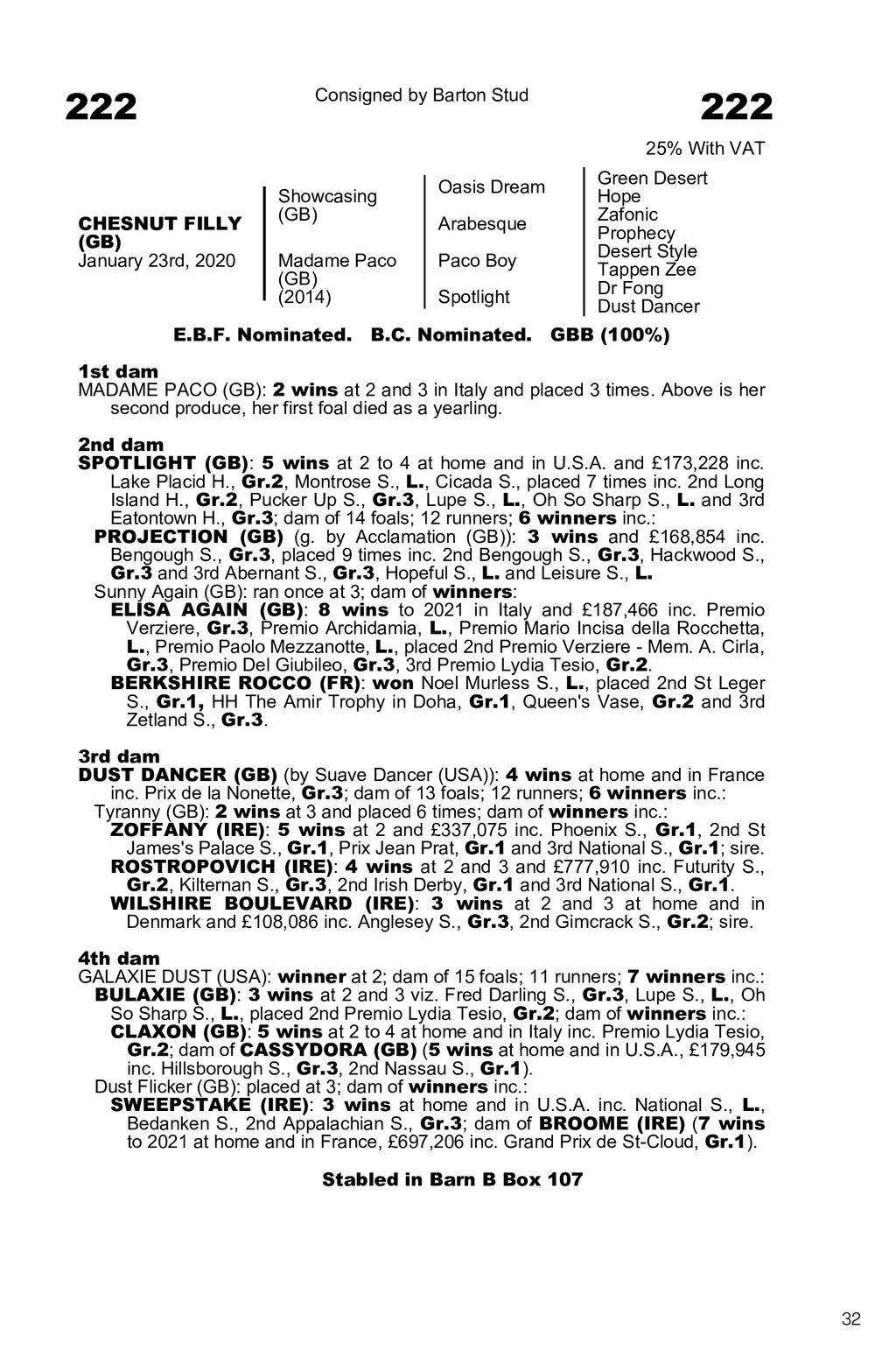 0274X24.GUI 00Madame Paco (GB)|2020|F|A|2740594 222 222 Consigned by Barton Stud 25% With VAT CHESNUT FILLY (GB) January 23rd, 2020 Showcasing (GB) Oasis Dream Madame Paco (GB) (2014) Paco Boy Arabesque Spotlight Green Desert Hope Zafonic Prophecy Desert Style Tappen Zee Dr Fong Dust Dancer E.B.F. Nominated. B.C. Nominated. GBB (100%) 1st dam MADAME PACO (GB): 2 wins at 2 and 3 in Italy and placed 3 times. Above is her second produce, her first foal died as a yearling. 2nd dam SPOTLIGHT (GB): 5 wins at 2 to 4 at home and in U.S.A. and 173,228 inc. Lake Placid H., Gr.2, Montrose S., L., Cicada S., placed 7 times inc. 2nd Long Island H., Gr.2, Pucker Up S., Gr.3, Lupe S., L., Oh So Sharp S., L. and 3rd Eatontown H., Gr.3; dam of 14 foals; 12 runners; 6 winners inc.: PROJECTION (GB) (g. by Acclamation (GB)): 3 wins and 168,854 inc. Bengough S., Gr.3, placed 9 times inc. 2nd Bengough S., Gr.3, Hackwood S., Gr.3 and 3rd Abernant S., Gr.3, Hopeful S., L. and Leisure S., L. Sunny Again (GB): ran once at 3; dam of winners: ELISA AGAIN (GB): 8 wins to 2021 in Italy and 187,466 inc. Premio Verziere, Gr.3, Premio Archidamia, L., Premio Mario Incisa della Rocchetta, L., Premio Paolo Mezzanotte, L., placed 2nd Premio Verziere - Mem. A. Cirla, Gr.3, Premio Del Giubileo, Gr.3, 3rd Premio Lydia Tesio, Gr.2. BERKSHIRE ROCCO (FR): won Noel Murless S., L., placed 2nd St Leger S., Gr.1, HH The Amir Trophy in Doha, Gr.1, Queen s Vase, Gr.2 and 3rd Zetland S., Gr.3. 3rd dam DUST DANCER (GB) (by Suave Dancer (USA)): 4 wins at home and in France inc. Prix de la Nonette, Gr.3; dam of 13 foals; 12 runners; 6 winners inc.: Tyranny (GB): 2 wins at 3 and placed 6 times; dam of winners inc.: ZOFFANY (IRE): 5 wins at 2 and 337,075 inc. Phoenix S., Gr.1, 2nd St James s Palace S., Gr.1, Prix Jean Prat, Gr.1 and 3rd National S., Gr.1; sire. ROSTROPOVICH (IRE): 4 wins at 2 and 3 and 777,910 inc. Futurity S., Gr.2, Kilternan S., Gr.3, 2nd Irish Derby, Gr.1 and 3rd National S., Gr.1. WILSHIRE BOULEVARD (IRE): 3 wins at 2 and 3 at home and in Denmark and 108,086 inc. Anglesey S., Gr.3, 2nd Gimcrack S., Gr.2; sire. 4th dam GALAXIE DUST (USA): winner at 2; dam of 15 foals; 11 runners; 7 winners inc.: BULAXIE (GB): 3 wins at 2 and 3 viz. Fred Darling S., Gr.3, Lupe S., L., Oh So Sharp S., L., placed 2nd Premio Lydia Tesio, Gr.2; dam of winners inc.: CLAXON (GB): 5 wins at 2 to 4 at home and in Italy inc. Premio Lydia Tesio, Gr.2; dam of CASSYDORA (GB) (5 wins at home and in U.S.A., 179,945 inc. Hillsborough S., Gr.3, 2nd Nassau S., Gr.1). Dust Flicker (GB): placed at 3; dam of winners inc.: SWEEPSTAKE (IRE): 3 wins at home and in U.S.A. inc. National S., L., Bedanken S., 2nd Appalachian S., Gr.3; dam of BROOME (IRE) (7 wins to 2021 at home and in France, 697,206 inc. Grand Prix de St-Cloud, Gr.1). Stabled in Barn Box Stabled in Barn B Box 107 32