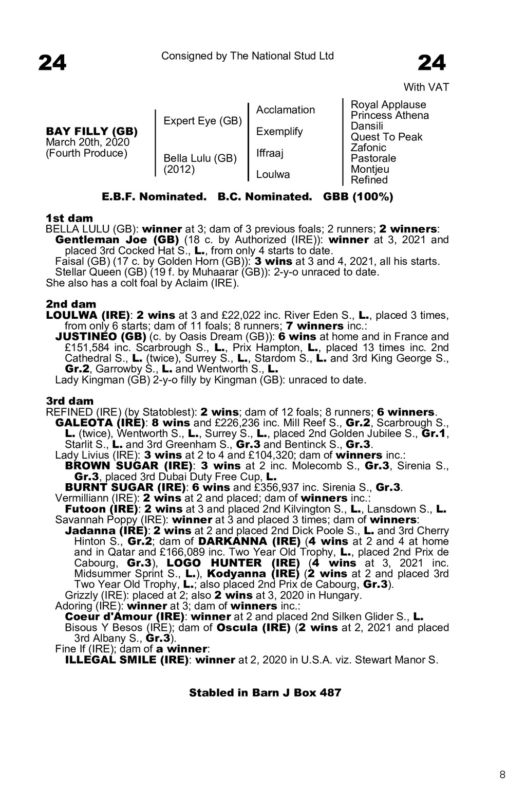 0210X88.GUI 00Bella Lulu (GB)|2020|F|A|2746433 24 24 Consigned by The National Stud Ltd With VAT BAY FILLY (GB) March 20th, 2020 (Fourth Produce) Expert Eye (GB) Bella Lulu (GB) (2012) Acclamation Exemplify Iffraaj Loulwa Royal Applause Princess Athena Dansili Quest To Peak Zafonic Pastorale Montjeu Refined E.B.F. Nominated. B.C. Nominated. GBB (100%) 1st dam BELLA LULU (GB): winner at 3; dam of 3 previous foals; 2 runners; 2 winners: Gentleman Joe (GB) (18 c. by Authorized (IRE)): winner at 3, 2021 and placed 3rd Cocked Hat S., L., from only 4 starts to date. Faisal (GB) (17 c. by Golden Horn (GB)): 3 wins at 3 and 4, 2021, all his starts. Stellar Queen (GB) (19 f. by Muhaarar (GB)): 2-y-o unraced to date. She also has a colt foal by Aclaim (IRE). 2nd dam LOULWA (IRE): 2 wins at 3 and 22,022 inc. River Eden S., L., placed 3 times, from only 6 starts; dam of 11 foals; 8 runners; 7 winners inc.: JUSTINEO (GB) (c. by Oasis Dream (GB)): 6 wins at home and in France and 151,584 inc. Scarbrough S., L., Prix Hampton, L., placed 13 times inc. 2nd Cathedral S., L. (twice), Surrey S., L., Stardom S., L. and 3rd King George S., Gr.2, Garrowby S., L. and Wentworth S., L. Lady Kingman (GB) 2-y-o filly by Kingman (GB): unraced to date. 3rd dam REFINED (IRE) (by Statoblest): 2 wins; dam of 12 foals; 8 runners; 6 winners. GALEOTA (IRE): 8 wins and 226,236 inc. Mill Reef S., Gr.2, Scarbrough S., L. (twice), Wentworth S., L., Surrey S., L., placed 2nd Golden Jubilee S., Gr.1, Starlit S., L. and 3rd Greenham S., Gr.3 and Bentinck S., Gr.3. Lady Livius (IRE): 3 wins at 2 to 4 and 104,320; dam of winners inc.: BROWN SUGAR (IRE): 3 wins at 2 inc. Molecomb S., Gr.3, Sirenia S., Gr.3, placed 3rd Dubai Duty Free Cup, L. BURNT SUGAR (IRE): 6 wins and 356,937 inc. Sirenia S., Gr.3. Vermilliann (IRE): 2 wins at 2 and placed; dam of winners inc.: Futoon (IRE): 2 wins at 3 and placed 2nd Kilvington S., L., Lansdown S., L. Savannah Poppy (IRE): winner at 3 and placed 3 times; dam of winners: Jadanna (IRE): 2 wins at 2 and placed 2nd Dick Poole S., L. and 3rd Cherry Hinton S., Gr.2; dam of DARKANNA (IRE) (4 wins at 2 and 4 at home and in Qatar and 166,089 inc. Two Year Old Trophy, L., placed 2nd Prix de Cabourg, Gr.3), LOGO HUNTER (IRE) (4 wins at 3, 2021 inc. Midsummer Sprint S., L.), Kodyanna (IRE) (2 wins at 2 and placed 3rd Two Year Old Trophy, L.; also placed 2nd Prix de Cabourg, Gr.3). Grizzly (IRE): placed at 2; also 2 wins at 3, 2020 in Hungary. Adoring (IRE): winner at 3; dam of winners inc.: Coeur d Amour (IRE): winner at 2 and placed 2nd Silken Glider S., L. Bisous Y Besos (IRE); dam of Oscula (IRE) (2 wins at 2, 2021 and placed 3rd Albany S., Gr.3). Fine If (IRE); dam of a winner: ILLEGAL SMILE (IRE): winner at 2, 2020 in U.S.A. viz. Stewart Manor S. Stabled in Barn Box Stabled in Barn J Box 487 8