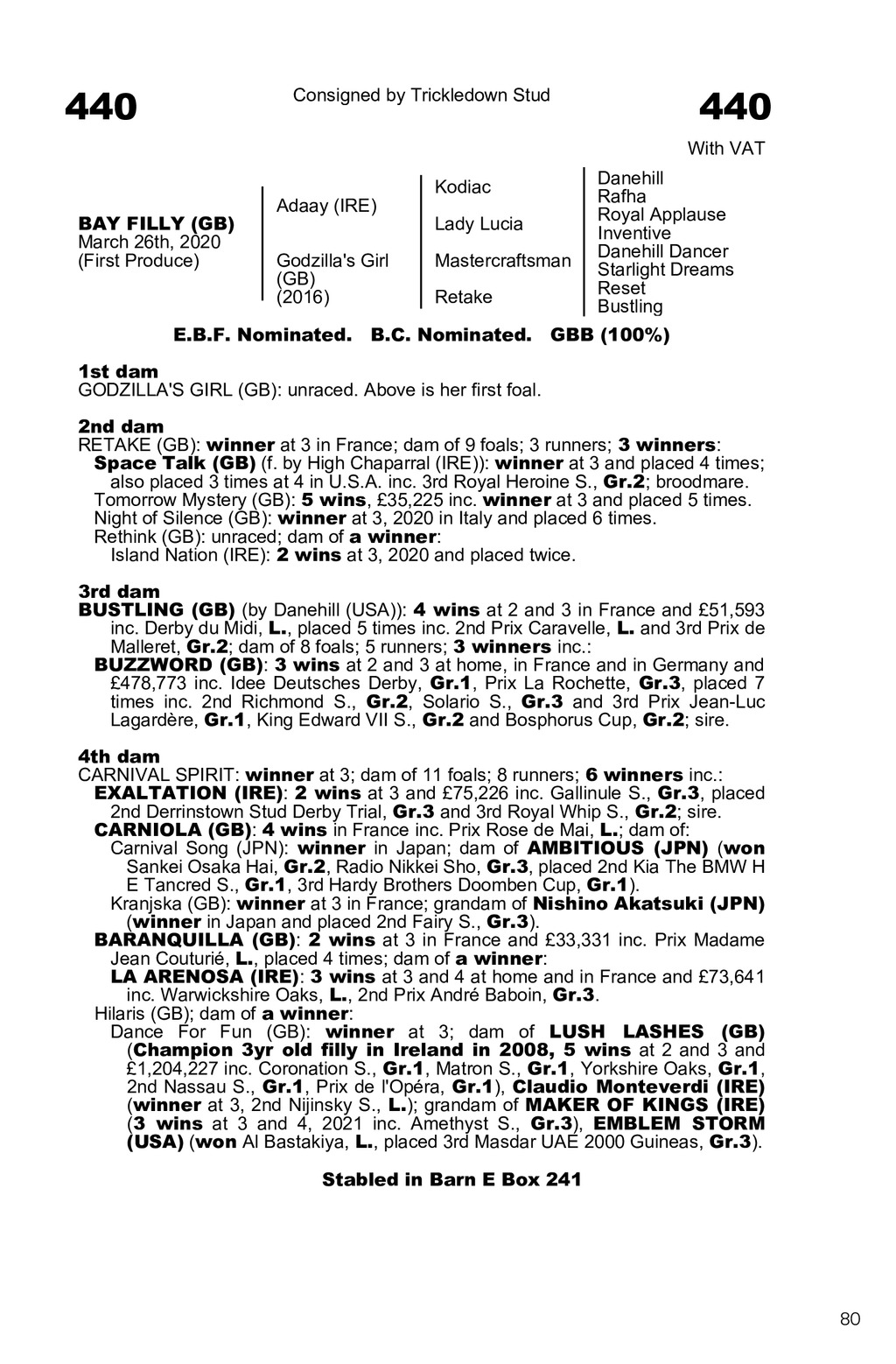 0046Z54.GUJ 00Godzilla s Girl (GB)|2020|F|A|2747670 440 440 Consigned by Trickledown Stud With VAT BAY FILLY (GB) March 26th, 2020 (First Produce) Adaay (IRE) Godzilla s Girl (GB) (2016) Kodiac Lady Lucia Mastercraftsman Retake Danehill Rafha Royal Applause Inventive Danehill Dancer Starlight Dreams Reset Bustling E.B.F. Nominated. B.C. Nominated. GBB (100%) 1st dam GODZILLA S GIRL (GB): unraced. Above is her first foal. 2nd dam RETAKE (GB): winner at 3 in France; dam of 9 foals; 3 runners; 3 winners: Space Talk (GB) (f. by High Chaparral (IRE)): winner at 3 and placed 4 times; also placed 3 times at 4 in U.S.A. inc. 3rd Royal Heroine S., Gr.2; broodmare. Tomorrow Mystery (GB): 5 wins, 35,225 inc. winner at 3 and placed 5 times. Night of Silence (GB): winner at 3, 2020 in Italy and placed 6 times. Rethink (GB): unraced; dam of a winner: Island Nation (IRE): 2 wins at 3, 2020 and placed twice. 3rd dam BUSTLING (GB) (by Danehill (USA)): 4 wins at 2 and 3 in France and 51,593 inc. Derby du Midi, L., placed 5 times inc. 2nd Prix Caravelle, L. and 3rd Prix de Malleret, Gr.2; dam of 8 foals; 5 runners; 3 winners inc.: BUZZWORD (GB): 3 wins at 2 and 3 at home, in France and in Germany and 478,773 inc. Idee Deutsches Derby, Gr.1, Prix La Rochette, Gr.3, placed 7 times inc. 2nd Richmond S., Gr.2, Solario S., Gr.3 and 3rd Prix Jean-Luc Lagardre, Gr.1, King Edward VII S., Gr.2 and Bosphorus Cup, Gr.2; sire. 4th dam CARNIVAL SPIRIT: winner at 3; dam of 11 foals; 8 runners; 6 winners inc.: EXALTATION (IRE): 2 wins at 3 and 75,226 inc. Gallinule S., Gr.3, placed 2nd Derrinstown Stud Derby Trial, Gr.3 and 3rd Royal Whip S., Gr.2; sire. CARNIOLA (GB): 4 wins in France inc. Prix Rose de Mai, L.; dam of: Carnival Song (JPN): winner in Japan; dam of AMBITIOUS (JPN) (won Sankei Osaka Hai, Gr.2, Radio Nikkei Sho, Gr.3, placed 2nd Kia The BMW H E Tancred S., Gr.1, 3rd Hardy Brothers Doomben Cup, Gr.1). Kranjska (GB): winner at 3 in France; grandam of Nishino Akatsuki (JPN) (winner in Japan and placed 2nd Fairy S., Gr.3). BARANQUILLA (GB): 2 wins at 3 in France and 33,331 inc. Prix Madame Jean Couturi, L., placed 4 times; dam of a winner: LA ARENOSA (IRE): 3 wins at 3 and 4 at home and in France and 73,641 inc. Warwickshire Oaks, L., 2nd Prix Andr Baboin, Gr.3. Hilaris (GB); dam of a winner: Dance For Fun (GB): winner at 3; dam of LUSH LASHES (GB) (Champion 3yr old filly in Ireland in 2008, 5 wins at 2 and 3 and 1,204,227 inc. Coronation S., Gr.1, Matron S., Gr.1, Yorkshire Oaks, Gr.1, 2nd Nassau S., Gr.1, Prix de l Opra, Gr.1), Claudio Monteverdi (IRE) (winner at 3, 2nd Nijinsky S., L.); grandam of MAKER OF KINGS (IRE) (3 wins at 3 and 4, 2021 inc. Amethyst S., Gr.3), EMBLEM STORM (USA) (won Al Bastakiya, L., placed 3rd Masdar UAE 2000 Guineas, Gr.3). Stabled in Barn Box Stabled in Barn E Box 241 80