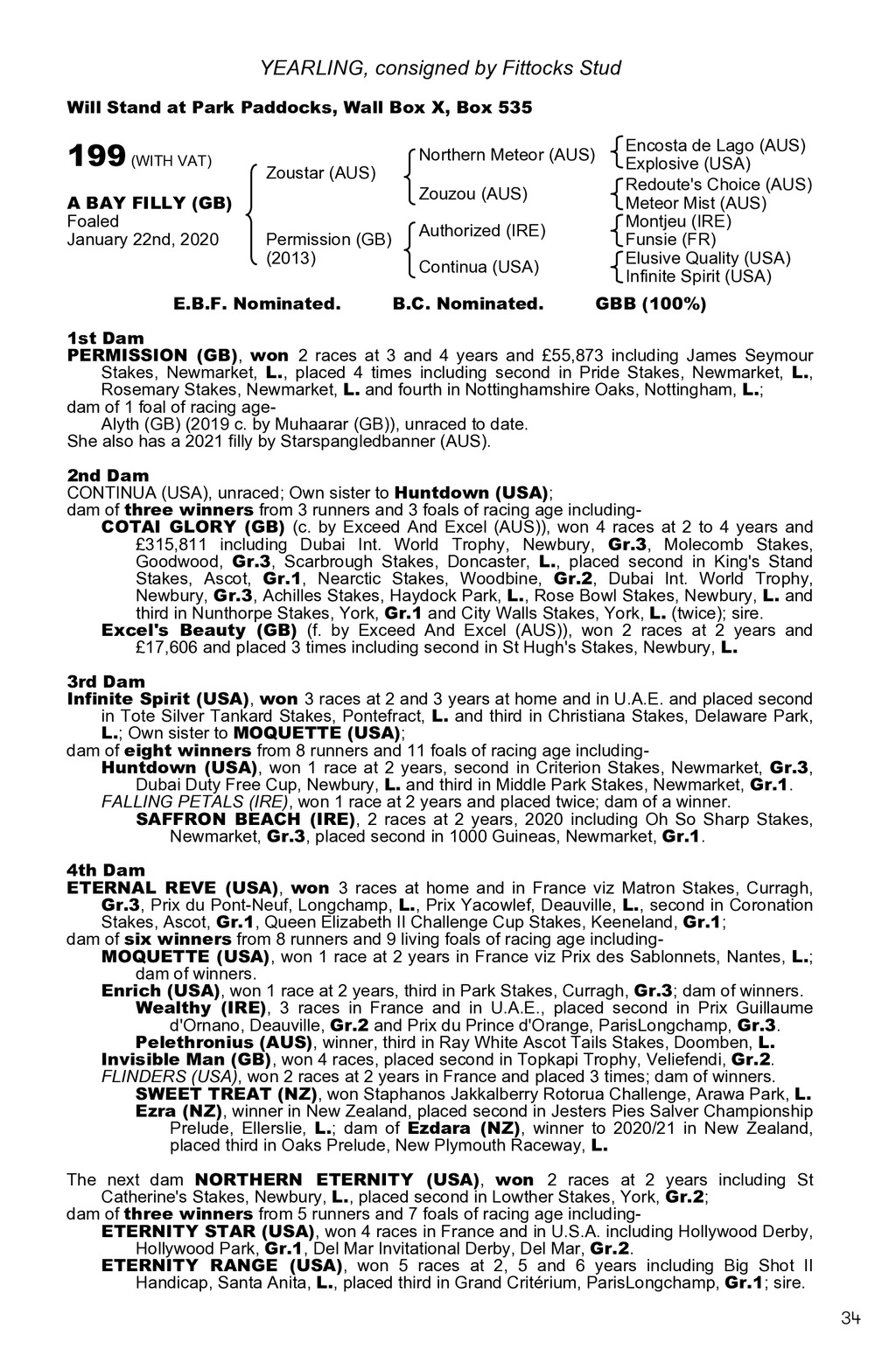 YEARLING, consigned by Fittocks Stud Will Stand at Park Paddocks, Wall Box X, Box 535 199 (WITH VAT) A BAY FILLY (GB) Foaled January 22nd, 2020 Zoustar (AUS) Permission (GB) (2013) E.B.F. Nominated. Northern Meteor (AUS) Zouzou (AUS) Authorized (IRE) Continua (USA) B.C. Nominated. Encosta de Lago (AUS) Explosive (USA) Redoute s Choice (AUS) Meteor Mist (AUS) Montjeu (IRE) Funsie (FR) Elusive Quality (USA) Infinite Spirit (USA) GBB (100%) 1st Dam PERMISSION (GB), won 2 races at 3 and 4 years and 55,873 including James Seymour Stakes, Newmarket, L., placed 4 times including second in Pride Stakes, Newmarket, L., Rosemary Stakes, Newmarket, L. and fourth in Nottinghamshire Oaks, Nottingham, L.; dam of 1 foal of racing ageAlyth (GB) (2019 c. by Muhaarar (GB)), unraced to date. She also has a 2021 filly by Starspangledbanner (AUS). 2nd Dam CONTINUA (USA), unraced; Own sister to Huntdown (USA); dam of three winners from 3 runners and 3 foals of racing age includingCOTAI GLORY (GB) (c. by Exceed And Excel (AUS)), won 4 races at 2 to 4 years and 315,811 including Dubai Int. World Trophy, Newbury, Gr.3, Molecomb Stakes, Goodwood, Gr.3, Scarbrough Stakes, Doncaster, L., placed second in King s Stand Stakes, Ascot, Gr.1, Nearctic Stakes, Woodbine, Gr.2, Dubai Int. World Trophy, Newbury, Gr.3, Achilles Stakes, Haydock Park, L., Rose Bowl Stakes, Newbury, L. and third in Nunthorpe Stakes, York, Gr.1 and City Walls Stakes, York, L. (twice); sire. Excel s Beauty (GB) (f. by Exceed And Excel (AUS)), won 2 races at 2 years and 17,606 and placed 3 times including second in St Hugh s Stakes, Newbury, L. 3rd Dam Infinite Spirit (USA), won 3 races at 2 and 3 years at home and in U.A.E. and placed second in Tote Silver Tankard Stakes, Pontefract, L. and third in Christiana Stakes, Delaware Park, L.; Own sister to MOQUETTE (USA); dam of eight winners from 8 runners and 11 foals of racing age includingHuntdown (USA), won 1 race at 2 years, second in Criterion Stakes, Newmarket, Gr.3, Dubai Duty Free Cup, Newbury, L. and third in Middle Park Stakes, Newmarket, Gr.1. FALLING PETALS (IRE), won 1 race at 2 years and placed twice; dam of a winner. SAFFRON BEACH (IRE), 2 races at 2 years, 2020 including Oh So Sharp Stakes, Newmarket, Gr.3, placed second in 1000 Guineas, Newmarket, Gr.1. 4th Dam ETERNAL REVE (USA), won 3 races at home and in France viz Matron Stakes, Curragh, Gr.3, Prix du Pont-Neuf, Longchamp, L., Prix Yacowlef, Deauville, L., second in Coronation Stakes, Ascot, Gr.1, Queen Elizabeth II Challenge Cup Stakes, Keeneland, Gr.1; dam of six winners from 8 runners and 9 living foals of racing age includingMOQUETTE (USA), won 1 race at 2 years in France viz Prix des Sablonnets, Nantes, L.; dam of winners. Enrich (USA), won 1 race at 2 years, third in Park Stakes, Curragh, Gr.3; dam of winners. Wealthy (IRE), 3 races in France and in U.A.E., placed second in Prix Guillaume d Ornano, Deauville, Gr.2 and Prix du Prince d Orange, ParisLongchamp, Gr.3. Pelethronius (AUS), winner, third in Ray White Ascot Tails Stakes, Doomben, L. Invisible Man (GB), won 4 races, placed second in Topkapi Trophy, Veliefendi, Gr.2. FLINDERS (USA), won 2 races at 2 years in France and placed 3 times; dam of winners. SWEET TREAT (NZ), won Staphanos Jakkalberry Rotorua Challenge, Arawa Park, L. Ezra (NZ), winner in New Zealand, placed second in Jesters Pies Salver Championship Prelude, Ellerslie, L.; dam of Ezdara (NZ), winner to 2020/21 in New Zealand, placed third in Oaks Prelude, New Plymouth Raceway, L. The next dam NORTHERN ETERNITY (USA), won 2 races at 2 years including St Catherine s Stakes, Newbury, L., placed second in Lowther Stakes, York, Gr.2; dam of three winners from 5 runners and 7 foals of racing age includingETERNITY STAR (USA), won 4 races in France and in U.S.A. including Hollywood Derby, Hollywood Park, Gr.1, Del Mar Invitational Derby, Del Mar, Gr.2. ETERNITY RANGE (USA), won 5 races at 2, 5 and 6 years including Big Shot II Handicap, Santa Anita, L., placed third in Grand Critrium, ParisLongchamp, Gr.1; sire. 34