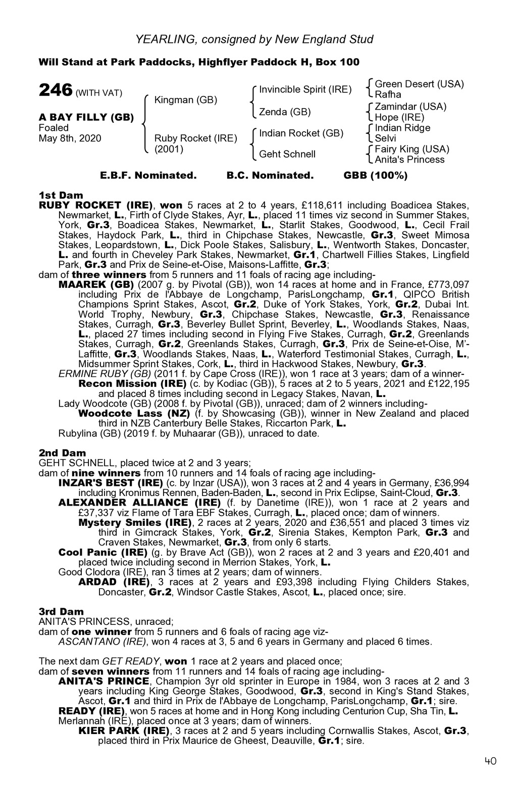 YEARLING, consigned by New England Stud Will Stand at Park Paddocks, Highflyer Paddock H, Box 100 246 (WITH VAT) A BAY FILLY (GB) Foaled May 8th, 2020 Invincible Spirit (IRE) Kingman (GB) Zenda (GB) Ruby Rocket (IRE) (2001) E.B.F. Nominated. Indian Rocket (GB) Geht Schnell B.C. Nominated. Green Desert (USA) Rafha Zamindar (USA) Hope (IRE) Indian Ridge Selvi Fairy King (USA) Anita s Princess GBB (100%) 1st Dam RUBY ROCKET (IRE), won 5 races at 2 to 4 years, 118,611 including Boadicea Stakes, Newmarket, L., Firth of Clyde Stakes, Ayr, L., placed 11 times viz second in Summer Stakes, York, Gr.3, Boadicea Stakes, Newmarket, L., Starlit Stakes, Goodwood, L., Cecil Frail Stakes, Haydock Park, L., third in Chipchase Stakes, Newcastle, Gr.3, Sweet Mimosa Stakes, Leopardstown, L., Dick Poole Stakes, Salisbury, L., Wentworth Stakes, Doncaster, L. and fourth in Cheveley Park Stakes, Newmarket, Gr.1, Chartwell Fillies Stakes, Lingfield Park, Gr.3 and Prix de Seine-et-Oise, Maisons-Laffitte, Gr.3; dam of three winners from 5 runners and 11 foals of racing age includingMAAREK (GB) (2007 g. by Pivotal (GB)), won 14 races at home and in France, 773,097 including Prix de l Abbaye de Longchamp, ParisLongchamp, Gr.1, QIPCO British Champions Sprint Stakes, Ascot, Gr.2, Duke of York Stakes, York, Gr.2, Dubai Int. World Trophy, Newbury, Gr.3, Chipchase Stakes, Newcastle, Gr.3, Renaissance Stakes, Curragh, Gr.3, Beverley Bullet Sprint, Beverley, L., Woodlands Stakes, Naas, L., placed 27 times including second in Flying Five Stakes, Curragh, Gr.2, Greenlands Stakes, Curragh, Gr.2, Greenlands Stakes, Curragh, Gr.3, Prix de Seine-et-Oise, MLaffitte, Gr.3, Woodlands Stakes, Naas, L., Waterford Testimonial Stakes, Curragh, L., Midsummer Sprint Stakes, Cork, L., third in Hackwood Stakes, Newbury, Gr.3. ERMINE RUBY (GB) (2011 f. by Cape Cross (IRE)), won 1 race at 3 years; dam of a winnerRecon Mission (IRE) (c. by Kodiac (GB)), 5 races at 2 to 5 years, 2021 and 122,195 and placed 8 times including second in Legacy Stakes, Navan, L. Lady Woodcote (GB) (2008 f. by Pivotal (GB)), unraced; dam of 2 winners includingWoodcote Lass (NZ) (f. by Showcasing (GB)), winner in New Zealand and placed third in NZB Canterbury Belle Stakes, Riccarton Park, L. Rubylina (GB) (2019 f. by Muhaarar (GB)), unraced to date. 2nd Dam GEHT SCHNELL, placed twice at 2 and 3 years; dam of nine winners from 10 runners and 14 foals of racing age includingINZAR S BEST (IRE) (c. by Inzar (USA)), won 3 races at 2 and 4 years in Germany, 36,994 including Kronimus Rennen, Baden-Baden, L., second in Prix Eclipse, Saint-Cloud, Gr.3. ALEXANDER ALLIANCE (IRE) (f. by Danetime (IRE)), won 1 race at 2 years and 37,337 viz Flame of Tara EBF Stakes, Curragh, L., placed once; dam of winners. Mystery Smiles (IRE), 2 races at 2 years, 2020 and 36,551 and placed 3 times viz third in Gimcrack Stakes, York, Gr.2, Sirenia Stakes, Kempton Park, Gr.3 and Craven Stakes, Newmarket, Gr.3, from only 6 starts. Cool Panic (IRE) (g. by Brave Act (GB)), won 2 races at 2 and 3 years and 20,401 and placed twice including second in Merrion Stakes, York, L. Good Clodora (IRE), ran 3 times at 2 years; dam of winners. ARDAD (IRE), 3 races at 2 years and 93,398 including Flying Childers Stakes, Doncaster, Gr.2, Windsor Castle Stakes, Ascot, L., placed once; sire. 3rd Dam ANITA S PRINCESS, unraced; dam of one winner from 5 runners and 6 foals of racing age vizASCANTANO (IRE), won 4 races at 3, 5 and 6 years in Germany and placed 6 times. The next dam GET READY, won 1 race at 2 years and placed once; dam of seven winners from 11 runners and 14 foals of racing age includingANITA S PRINCE, Champion 3yr old sprinter in Europe in 1984, won 3 races at 2 and 3 years including King George Stakes, Goodwood, Gr.3, second in King s Stand Stakes, Ascot, Gr.1 and third in Prix de l Abbaye de Longchamp, ParisLongchamp, Gr.1; sire. READY (IRE), won 5 races at home and in Hong Kong including Centurion Cup, Sha Tin, L. Merlannah (IRE), placed once at 3 years; dam of winners. KIER PARK (IRE), 3 races at 2 and 5 years including Cornwallis Stakes, Ascot, Gr.3, placed third in Prix Maurice de Gheest, Deauville, Gr.1; sire. 40