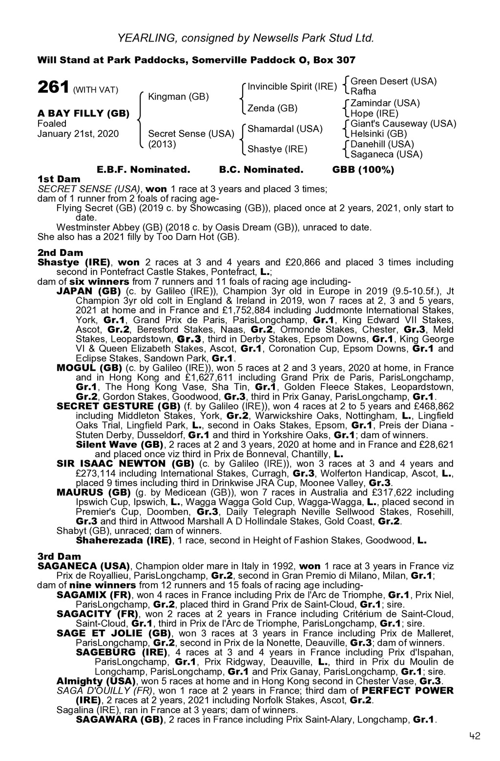 YEARLING, consigned by Newsells Park Stud Ltd. Will Stand at Park Paddocks, Somerville Paddock O, Box 307 261 (WITH VAT) A BAY FILLY (GB) Foaled January 21st, 2020 Kingman (GB) Secret Sense (USA) (2013) Invincible Spirit (IRE) Zenda (GB) Shamardal (USA) Shastye (IRE) Green Desert (USA) Rafha Zamindar (USA) Hope (IRE) Giant s Causeway (USA) Helsinki (GB) Danehill (USA) Saganeca (USA) E.B.F. Nominated. B.C. Nominated. GBB (100%) 1st Dam SECRET SENSE (USA), won 1 race at 3 years and placed 3 times; dam of 1 runner from 2 foals of racing ageFlying Secret (GB) (2019 c. by Showcasing (GB)), placed once at 2 years, 2021, only start to date. Westminster Abbey (GB) (2018 c. by Oasis Dream (GB)), unraced to date. She also has a 2021 filly by Too Darn Hot (GB). 2nd Dam Shastye (IRE), won 2 races at 3 and 4 years and 20,866 and placed 3 times including second in Pontefract Castle Stakes, Pontefract, L.; dam of six winners from 7 runners and 11 foals of racing age includingJAPAN (GB) (c. by Galileo (IRE)), Champion 3yr old in Europe in 2019 (9.5-10.5f.), Jt Champion 3yr old colt in England & Ireland in 2019, won 7 races at 2, 3 and 5 years, 2021 at home and in France and 1,752,884 including Juddmonte International Stakes, York, Gr.1, Grand Prix de Paris, ParisLongchamp, Gr.1, King Edward VII Stakes, Ascot, Gr.2, Beresford Stakes, Naas, Gr.2, Ormonde Stakes, Chester, Gr.3, Meld Stakes, Leopardstown, G r . 3 , third in Derby Stakes, Epsom Downs, Gr.1, King George VI & Queen Elizabeth Stakes, Ascot, Gr.1, Coronation Cup, Epsom Downs, Gr.1 and Eclipse Stakes, Sandown Park, Gr.1. MOGUL (GB) (c. by Galileo (IRE)), won 5 races at 2 and 3 years, 2020 at home, in France and in Hong Kong and 1,627,611 including Grand Prix de Paris, ParisLongchamp, Gr.1, The Hong Kong Vase, Sha Tin, Gr.1, Golden Fleece Stakes, Leopardstown, Gr.2, Gordon Stakes, Goodwood, Gr.3, third in Prix Ganay, ParisLongchamp, Gr.1. SECRET GESTURE (GB) (f. by Galileo (IRE)), won 4 races at 2 to 5 years and 468,862 including Middleton Stakes, York, Gr.2, Warwickshire Oaks, Nottingham, L., Lingfield Oaks Trial, Lingfield Park, L., second in Oaks Stakes, Epsom, Gr.1, Preis der Diana Stuten Derby, Dusseldorf, Gr.1 and third in Yorkshire Oaks, Gr.1; dam of winners. Silent Wave (GB), 2 races at 2 and 3 years, 2020 at home and in France and 28,621 and placed once viz third in Prix de Bonneval, Chantilly, L. SIR ISAAC NEWTON (GB) (c. by Galileo (IRE)), won 3 races at 3 and 4 years and 273,114 including International Stakes, Curragh, Gr.3, Wolferton Handicap, Ascot, L., placed 9 times including third in Drinkwise JRA Cup, Moonee Valley, Gr.3. MAURUS (GB) (g. by Medicean (GB)), won 7 races in Australia and 317,622 including Ipswich Cup, Ipswich, L., Wagga Wagga Gold Cup, Wagga-Wagga, L., placed second in Premier s Cup, Doomben, Gr.3, Daily Telegraph Neville Sellwood Stakes, Rosehill, Gr.3 and third in Attwood Marshall A D Hollindale Stakes, Gold Coast, Gr.2. Shabyt (GB), unraced; dam of winners. Shaherezada (IRE), 1 race, second in Height of Fashion Stakes, Goodwood, L. 3rd Dam SAGANECA (USA), Champion older mare in Italy in 1992, won 1 race at 3 years in France viz Prix de Royallieu, ParisLongchamp, Gr.2, second in Gran Premio di Milano, Milan, Gr.1; dam of nine winners from 12 runners and 15 foals of racing age includingSAGAMIX (FR), won 4 races in France including Prix de l Arc de Triomphe, Gr.1, Prix Niel, ParisLongchamp, Gr.2, placed third in Grand Prix de Saint-Cloud, Gr.1; sire. SAGACITY (FR), won 2 races at 2 years in France including Critrium de Saint-Cloud, Saint-Cloud, Gr.1, third in Prix de l Arc de Triomphe, ParisLongchamp, Gr.1; sire. SAGE ET JOLIE (GB), won 3 races at 3 years in France including Prix de Malleret, ParisLongchamp, Gr.2, second in Prix de la Nonette, Deauville, Gr.3; dam of winners. SAGEBURG (IRE), 4 races at 3 and 4 years in France including Prix d Ispahan, ParisLongchamp, Gr.1, Prix Ridgway, Deauville, L., third in Prix du Moulin de Longchamp, ParisLongchamp, Gr.1 and Prix Ganay, ParisLongchamp, Gr.1; sire. Almighty (USA), won 5 races at home and in Hong Kong second in Chester Vase, Gr.3. SAGA D OUILLY (FR), won 1 race at 2 years in France; third dam of PERFECT POWER (IRE), 2 races at 2 years, 2021 including Norfolk Stakes, Ascot, Gr.2. Sagalina (IRE), ran in France at 3 years; dam of winners. SAGAWARA (GB), 2 races in France including Prix Saint-Alary, Longchamp, Gr.1. 42