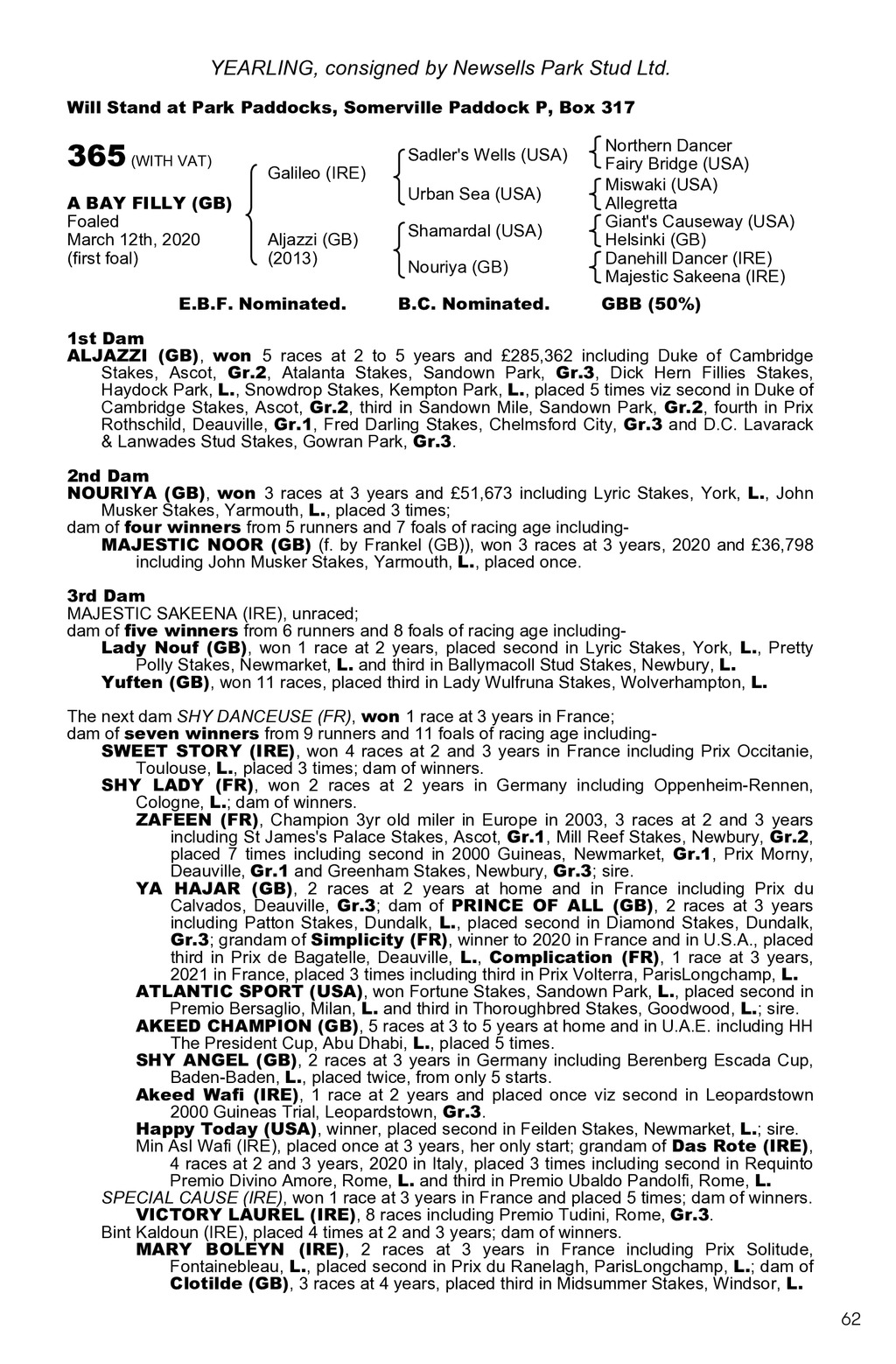 YEARLING, consigned by Newsells Park Stud Ltd. Will Stand at Park Paddocks, Somerville Paddock P, Box 317 365 (WITH VAT) A BAY FILLY (GB) Foaled March 12th, 2020 (first foal) Galileo (IRE) Aljazzi (GB) (2013) E.B.F. Nominated. Sadler s Wells (USA) Urban Sea (USA) Shamardal (USA) Nouriya (GB) B.C. Nominated. Northern Dancer Fairy Bridge (USA) Miswaki (USA) Allegretta Giant s Causeway (USA) Helsinki (GB) Danehill Dancer (IRE) Majestic Sakeena (IRE) GBB (50%) 1st Dam ALJAZZI (GB), won 5 races at 2 to 5 years and 285,362 including Duke of Cambridge Stakes, Ascot, Gr.2, Atalanta Stakes, Sandown Park, Gr.3, Dick Hern Fillies Stakes, Haydock Park, L., Snowdrop Stakes, Kempton Park, L., placed 5 times viz second in Duke of Cambridge Stakes, Ascot, Gr.2, third in Sandown Mile, Sandown Park, Gr.2, fourth in Prix Rothschild, Deauville, Gr.1, Fred Darling Stakes, Chelmsford City, Gr.3 and D.C. Lavarack & Lanwades Stud Stakes, Gowran Park, Gr.3. 2nd Dam NOURIYA (GB), won 3 races at 3 years and 51,673 including Lyric Stakes, York, L., John Musker Stakes, Yarmouth, L., placed 3 times; dam of four winners from 5 runners and 7 foals of racing age includingMAJESTIC NOOR (GB) (f. by Frankel (GB)), won 3 races at 3 years, 2020 and 36,798 including John Musker Stakes, Yarmouth, L., placed once. 3rd Dam MAJESTIC SAKEENA (IRE), unraced; dam of five winners from 6 runners and 8 foals of racing age includingLady Nouf (GB), won 1 race at 2 years, placed second in Lyric Stakes, York, L., Pretty Polly Stakes, Newmarket, L. and third in Ballymacoll Stud Stakes, Newbury, L. Yuften (GB), won 11 races, placed third in Lady Wulfruna Stakes, Wolverhampton, L. The next dam SHY DANCEUSE (FR), won 1 race at 3 years in France; dam of seven winners from 9 runners and 11 foals of racing age includingSWEET STORY (IRE), won 4 races at 2 and 3 years in France including Prix Occitanie, Toulouse, L., placed 3 times; dam of winners. SHY LADY (FR), won 2 races at 2 years in Germany including Oppenheim-Rennen, Cologne, L.; dam of winners. ZAFEEN (FR), Champion 3yr old miler in Europe in 2003, 3 races at 2 and 3 years including St James s Palace Stakes, Ascot, Gr.1, Mill Reef Stakes, Newbury, Gr.2, placed 7 times including second in 2000 Guineas, Newmarket, Gr.1, Prix Morny, Deauville, Gr.1 and Greenham Stakes, Newbury, Gr.3; sire. YA HAJAR (GB), 2 races at 2 years at home and in France including Prix du Calvados, Deauville, Gr.3; dam of PRINCE OF ALL (GB), 2 races at 3 years including Patton Stakes, Dundalk, L., placed second in Diamond Stakes, Dundalk, Gr.3; grandam of Simplicity (FR), winner to 2020 in France and in U.S.A., placed third in Prix de Bagatelle, Deauville, L., Complication (FR), 1 race at 3 years, 2021 in France, placed 3 times including third in Prix Volterra, ParisLongchamp, L. ATLANTIC SPORT (USA), won Fortune Stakes, Sandown Park, L., placed second in Premio Bersaglio, Milan, L. and third in Thoroughbred Stakes, Goodwood, L.; sire. AKEED CHAMPION (GB), 5 races at 3 to 5 years at home and in U.A.E. including HH The President Cup, Abu Dhabi, L., placed 5 times. SHY ANGEL (GB), 2 races at 3 years in Germany including Berenberg Escada Cup, Baden-Baden, L., placed twice, from only 5 starts. Akeed Wafi (IRE), 1 race at 2 years and placed once viz second in Leopardstown 2000 Guineas Trial, Leopardstown, Gr.3. Happy Today (USA), winner, placed second in Feilden Stakes, Newmarket, L.; sire. Min Asl Wafi (IRE), placed once at 3 years, her only start; grandam of Das Rote (IRE), 4 races at 2 and 3 years, 2020 in Italy, placed 3 times including second in Requinto Premio Divino Amore, Rome, L. and third in Premio Ubaldo Pandolfi, Rome, L. SPECIAL CAUSE (IRE), won 1 race at 3 years in France and placed 5 times; dam of winners. VICTORY LAUREL (IRE), 8 races including Premio Tudini, Rome, Gr.3. Bint Kaldoun (IRE), placed 4 times at 2 and 3 years; dam of winners. MARY BOLEYN (IRE), 2 races at 3 years in France including Prix Solitude, Fontainebleau, L., placed second in Prix du Ranelagh, ParisLongchamp, L.; dam of Clotilde (GB), 3 races at 4 years, placed third in Midsummer Stakes, Windsor, L. 62