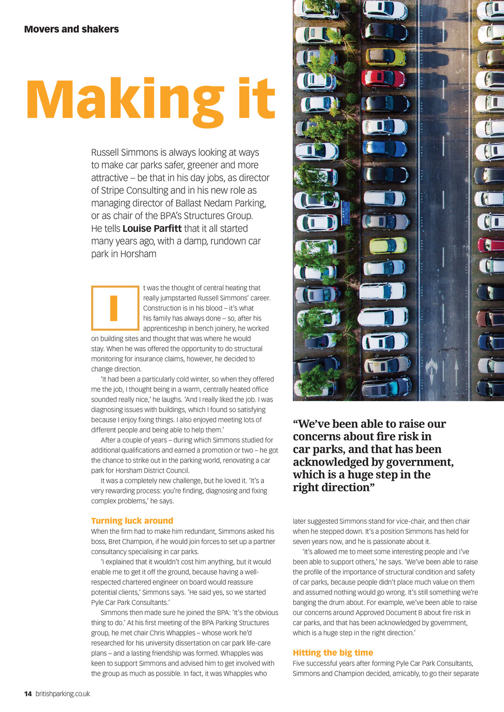 Movers and shakers Making it Russell Simmons is always looking at ways to make car parks safer, greener and more attractive be that in his day jobs, as director of Stripe Consulting and in his new role as managing director of Ballast Nedam Parking, or as chair of the BPAs Structures Group. He tells Louise Parfitt that it all started many years ago, with a damp, rundown car park in Horsham t was the thought of central heating that really jumpstarted Russell Simmons career. Construction is in his blood its what his family has always done so, after his apprenticeship in bench joinery, he worked on building sites and thought that was where he would stay. When he was offered the opportunity to do structural monitoring for insurance claims, however, he decided to change direction. It had been a particularly cold winter, so when they offered me the job, I thought being in a warm, centrally heated office sounded really nice, he laughs. And I really liked the job. I was diagnosing issues with buildings, which I found so satisfying because I enjoy fixing things. I also enjoyed meeting lots of different people and being able to help them. After a couple of years during which Simmons studied for additional qualifications and earned a promotion or two he got the chance to strike out in the parking world, renovating a car park for Horsham District Council. It was a completely new challenge, but he loved it. Its a very rewarding process: youre finding, diagnosing and fixing complex problems, he says. I Turning luck around When the firm had to make him redundant, Simmons asked his boss, Bret Champion, if he would join forces to set up a partner consultancy specialising in car parks. I explained that it wouldnt cost him anything, but it would enable me to get it off the ground, because having a wellrespected chartered engineer on board would reassure potential clients, Simmons says. He said yes, so we started Pyle Car Park Consultants. Simmons then made sure he joined the BPA: Its the obvious thing to do. At his first meeting of the BPA Parking Structures group, he met chair Chris Whapples whose work hed researched for his university dissertation on car park life-care plans and a lasting friendship was formed. Whapples was keen to support Simmons and advised him to get involved with the group as much as possible. In fact, it was Whapples who Weve been able to raise our concerns about fire risk in car parks, and that has been acknowledged by government, which is a huge step in the right direction later suggested Simmons stand for vice-chair, and then chair when he stepped down. Its a position Simmons has held for seven years now, and he is passionate about it. Its allowed me to meet some interesting people and Ive been able to support others, he says. Weve been able to raise the profile of the importance of structural condition and safety of car parks, because people didnt place much value on them and assumed nothing would go wrong. Its still something were banging the drum about. For example, weve been able to raise our concerns around Approved Document B about fire risk in car parks, and that has been acknowledged by government, which is a huge step in the right direction. Hitting the big time Five successful years after forming Pyle Car Park Consultants, Simmons and Champion decided, amicably, to go their separate 14 britishparking.co.uk PN Nov19 pp14-15 Movers and shakers.indd 14 24/10/2019 15:16