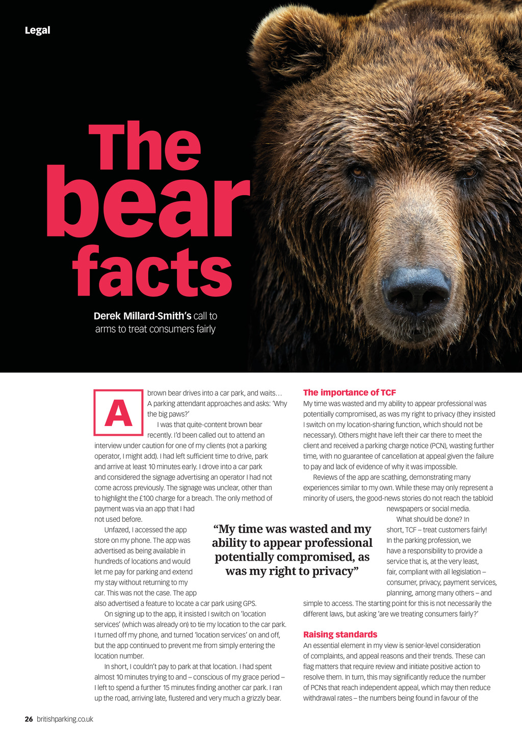 Legal The bear facts Derek Millard-Smiths call to arms to treat consumers fairly brown bear drives into a car park, and waits A parking attendant approaches and asks: Why the big paws? I was that quite-content brown bear recently. Id been called out to attend an interview under caution for one of my clients (not a parking operator, I might add). I had left sufficient time to drive, park and arrive at least 10 minutes early. I drove into a car park and considered the signage advertising an operator I had not come across previously. The signage was unclear, other than to highlight the 100 charge for a breach. The only method of payment was via an app that I had not used before. Unfazed, I accessed the app store on my phone. The app was advertised as being available in hundreds of locations and would let me pay for parking and extend my stay without returning to my car. This was not the case. The app also advertised a feature to locate a car park using GPS. On signing up to the app, it insisted I switch on location services (which was already on) to tie my location to the car park. I turned off my phone, and turned location services on and off, but the app continued to prevent me from simply entering the location number. In short, I couldnt pay to park at that location. I had spent almost 10 minutes trying to and conscious of my grace period I left to spend a further 15 minutes finding another car park. I ran up the road, arriving late, flustered and very much a grizzly bear. A The importance of TCF My time was wasted and my ability to appear professional was potentially compromised, as was my right to privacy (they insisted I switch on my location-sharing function, which should not be necessary). Others might have left their car there to meet the client and received a parking charge notice (PCN), wasting further time, with no guarantee of cancellation at appeal given the failure to pay and lack of evidence of why it was impossible. Reviews of the app are scathing, demonstrating many experiences similar to my own. While these may only represent a minority of users, the good-news stories do not reach the tabloid newspapers or social media. What should be done? In short, TCF treat customers fairly! In the parking profession, we have a responsibility to provide a service that is, at the very least, fair, compliant with all legislation consumer, privacy, payment services, planning, among many others and simple to access. The starting point for this is not necessarily the different laws, but asking are we treating consumers fairly? My time was wasted and my ability to appear professional potentially compromised, as was my right to privacy Raising standards An essential element in my view is senior-level consideration of complaints, and appeal reasons and their trends. These can flag matters that require review and initiate positive action to resolve them. In turn, this may significantly reduce the number of PCNs that reach independent appeal, which may then reduce withdrawal rates the numbers being found in favour of the 26 britishparking.co.uk PN Nov19 pp26-27 Legal.indd 28 24/10/2019 12:22