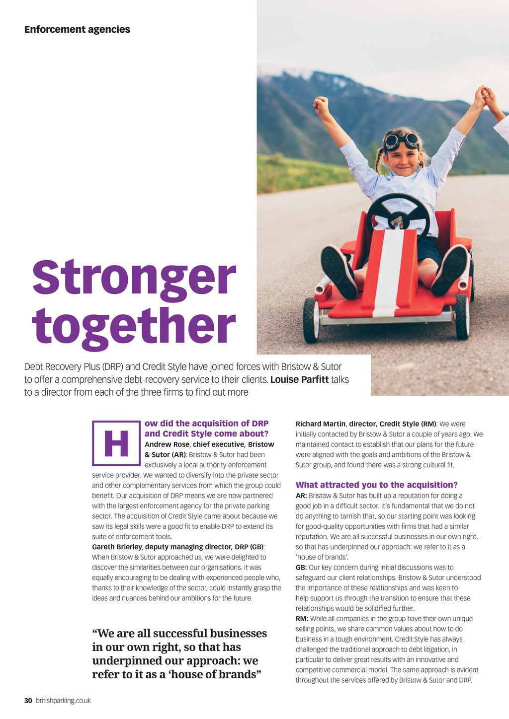Enforcement agencies Stronger together Debt Recovery Plus (DRP) and Credit Style have joined forces with Bristow & Sutor to offer a comprehensive debt-recovery service to their clients. Louise Parfitt talks to a director from each of the three firms to find out more H ow did the acquisition of DRP and Credit Style come about? Andrew Rose, chief executive, Bristow & Sutor (AR): Bristow & Sutor had been exclusively a local authority enforcement service provider. We wanted to diversify into the private sector and other complementary services from which the group could benefit. Our acquisition of DRP means we are now partnered with the largest enforcement agency for the private parking sector. The acquisition of Credit Style came about because we saw its legal skills were a good fit to enable DRP to extend its suite of enforcement tools. Gareth Brierley, deputy managing director, DRP (GB): When Bristow & Sutor approached us, we were delighted to discover the similarities between our organisations. It was equally encouraging to be dealing with experienced people who, thanks to their knowledge of the sector, could instantly grasp the ideas and nuances behind our ambitions for the future. We are all successful businesses in our own right, so that has underpinned our approach: we refer to it as a house of brands Richard Martin, director, Credit Style (RM): We were initially contacted by Bristow & Sutor a couple of years ago. We maintained contact to establish that our plans for the future were aligned with the goals and ambitions of the Bristow & Sutor group, and found there was a strong cultural fit. What attracted you to the acquisition? AR: Bristow & Sutor has built up a reputation for doing a good job in a difficult sector. Its fundamental that we do not do anything to tarnish that, so our starting point was looking for good-quality opportunities with firms that had a similar reputation. We are all successful businesses in our own right, so that has underpinned our approach: we refer to it as a house of brands. GB: Our key concern during initial discussions was to safeguard our client relationships. Bristow & Sutor understood the importance of these relationships and was keen to help support us through the transition to ensure that these relationships would be solidified further. RM: While all companies in the group have their own unique selling points, we share common values about how to do business in a tough environment. Credit Style has always challenged the traditional approach to debt litigation, in particular to deliver great results with an innovative and competitive commercial model. The same approach is evident throughout the services offered by Bristow & Sutor and DRP. 30 britishparking.co.uk PN Nov19 pp30-31 Bristow and Sutor.indd 30 24/10/2019 12:24