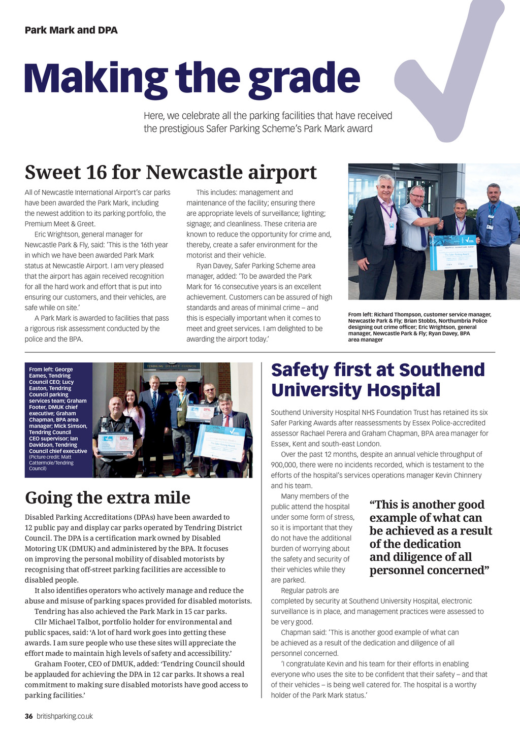 Park Mark and DPA Making the grade Here, we celebrate all the parking facilities that have received the prestigious Safer Parking Schemes Park Mark award Sweet 16 for Newcastle airport All of Newcastle International Airports car parks have been awarded the Park Mark, including the newest addition to its parking portfolio, the Premium Meet & Greet. Eric Wrightson, general manager for Newcastle Park & Fly, said: This is the 16th year in which we have been awarded Park Mark status at Newcastle Airport. I am very pleased that the airport has again received recognition for all the hard work and effort that is put into ensuring our customers, and their vehicles, are safe while on site. A Park Mark is awarded to facilities that pass a rigorous risk assessment conducted by the police and the BPA. This includes: management and maintenance of the facility; ensuring there are appropriate levels of surveillance; lighting; signage; and cleanliness. These criteria are known to reduce the opportunity for crime and, thereby, create a safer environment for the motorist and their vehicle. Ryan Davey, Safer Parking Scheme area manager, added: To be awarded the Park Mark for 16 consecutive years is an excellent achievement. Customers can be assured of high standards and areas of minimal crime and this is especially important when it comes to meet and greet services. I am delighted to be awarding the airport today. From left: George Eames, Tendring Council CEO; Lucy Easton, Tendring Council parking services team; Graham Footer, DMUK chief executive; Graham Chapman, BPA area manager; Mick Simson, Tendring Council CEO supervisor; Ian Davidson, Tendring Council chief executive (Picture credit: Matt Cattermole/Tendring Council) Going the extra mile Disabled Parking Accreditations (DPAs) have been awarded to 12 public pay and display car parks operated by Tendring District Council. The DPA is a certification mark owned by Disabled Motoring UK (DMUK) and administered by the BPA. It focuses on improving the personal mobility of disabled motorists by recognising that off-street parking facilities are accessible to disabled people. It also identifies operators who actively manage and reduce the abuse and misuse of parking spaces provided for disabled motorists. Tendring has also achieved the Park Mark in 15 car parks. Cllr Michael Talbot, portfolio holder for environmental and public spaces, said: A lot of hard work goes into getting these awards. I am sure people who use these sites will appreciate the effort made to maintain high levels of safety and accessibility. Graham Footer, CEO of DMUK, added: Tendring Council should be applauded for achieving the DPA in 12 car parks. It shows a real commitment to making sure disabled motorists have good access to parking facilities. From left: Richard Thompson, customer service manager, Newcastle Park & Fly; Brian Stobbs, Northumbria Police designing out crime officer; Eric Wrightson, general manager, Newcastle Park & Fly; Ryan Davey, BPA area manager Safety first at Southend University Hospital Southend University Hospital NHS Foundation Trust has retained its six Safer Parking Awards after reassessments by Essex Police-accredited assessor Rachael Perera and Graham Chapman, BPA area manager for Essex, Kent and south-east London. Over the past 12 months, despite an annual vehicle throughput of 900,000, there were no incidents recorded, which is testament to the efforts of the hospitals services operations manager Kevin Chinnery and his team. Many members of the public attend the hospital under some form of stress, so it is important that they do not have the additional burden of worrying about the safety and security of their vehicles while they are parked. Regular patrols are completed by security at Southend University Hospital, electronic surveillance is in place, and management practices were assessed to be very good. Chapman said: This is another good example of what can be achieved as a result of the dedication and diligence of all personnel concerned. I congratulate Kevin and his team for their efforts in enabling everyone who uses the site to be confident that their safety and that of their vehicles is being well catered for. The hospital is a worthy holder of the Park Mark status. This is another good example of what can be achieved as a result of the dedication and diligence of all personnel concerned 36 britishparking.co.uk PN Nov19 pp36-37 Park Mark.indd 36 24/10/2019 15:21