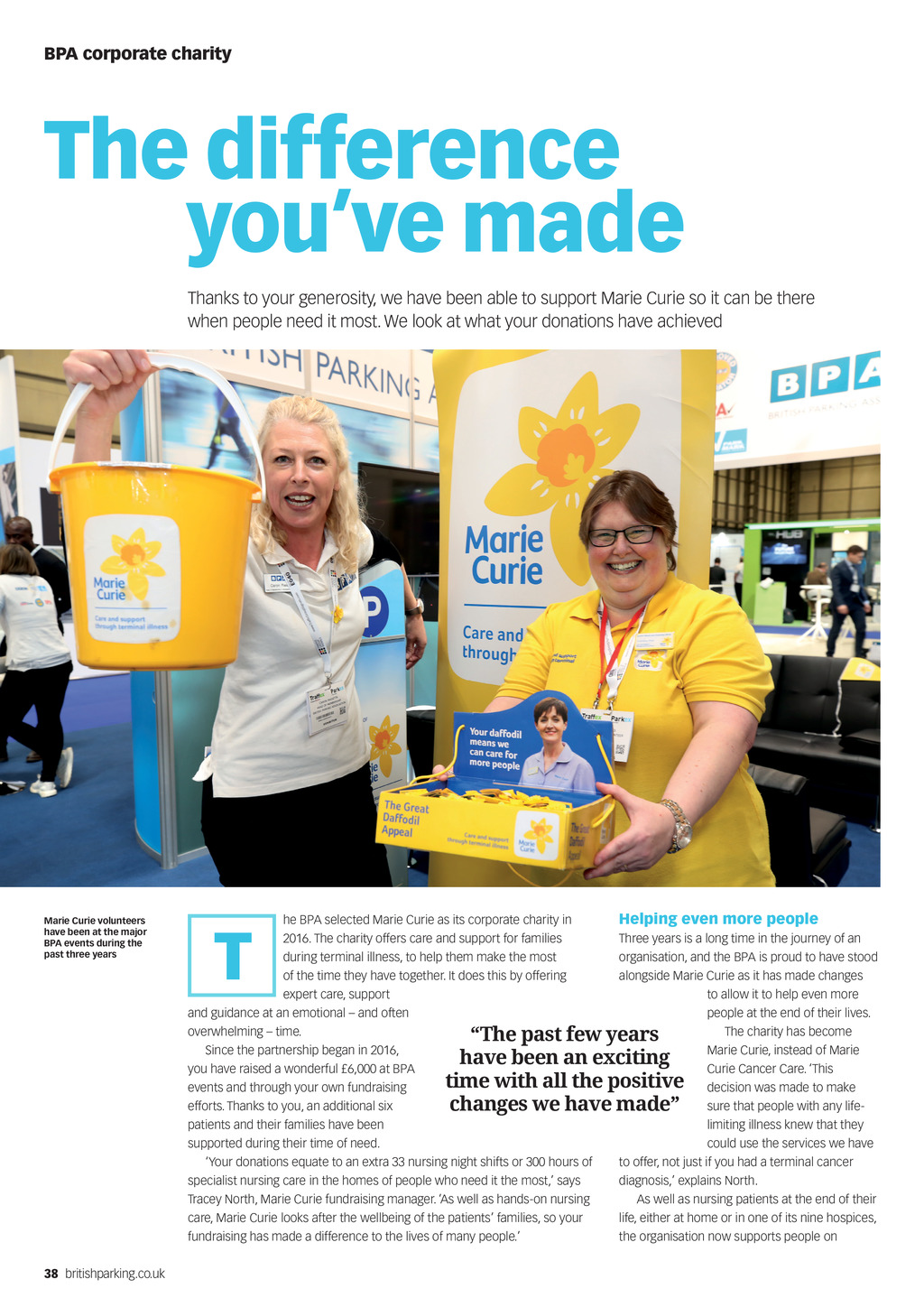 BPA corporate charity The difference youve made Thanks to your generosity, we have been able to support Marie Curie so it can be there when people need it most. We look at what your donations have achieved Marie Curie volunteers have been at the major BPA events during the past three years he BPA selected Marie Curie as its corporate charity in 2016. The charity offers care and support for families during terminal illness, to help them make the most of the time they have together. It does this by offering expert care, support and guidance at an emotional and often overwhelming time. Since the partnership began in 2016, you have raised a wonderful 6,000 at BPA events and through your own fundraising efforts. Thanks to you, an additional six patients and their families have been supported during their time of need. Your donations equate to an extra 33 nursing night shifts or 300 hours of specialist nursing care in the homes of people who need it the most, says Tracey North, Marie Curie fundraising manager. As well as hands-on nursing care, Marie Curie looks after the wellbeing of the patients families, so your fundraising has made a difference to the lives of many people. T Helping even more people Three years is a long time in the journey of an organisation, and the BPA is proud to have stood alongside Marie Curie as it has made changes to allow it to help even more people at the end of their lives. The charity has become Marie Curie, instead of Marie Curie Cancer Care. This decision was made to make sure that people with any lifelimiting illness knew that they could use the services we have to offer, not just if you had a terminal cancer diagnosis, explains North. As well as nursing patients at the end of their life, either at home or in one of its nine hospices, the organisation now supports people on The past few years have been an exciting time with all the positive changes we have made 38 britishparking.co.uk PN Nov19 pp38-39 Marie Curie.indd 38 24/10/2019 12:27