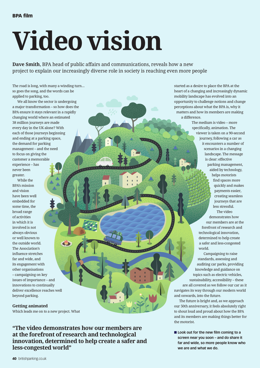 BPA film Video vision Dave Smith, BPA head of public affairs and communications, reveals how a new project to explain our increasingly diverse role in society is reaching even more people The road is long, with many a winding turn so goes the song, and the words can be applied to parking, too. We all know the sector is undergoing a major transformation so how does the BPA ensure it stays relevant in a rapidly changing world where an estimated 38 million journeys are made every day in the UK alone? With each of those journeys beginning and ending at a parking space, the demand for parking management and the need to focus on giving the customer a memorable experience has never been greater. While the BPAs mission and vision have been well embedded for some time, the broad range of activities in which it is involved is not always obvious or well known to the outside world. The Associations inuence stretches far and wide, and its engagement with other organisations campaigning on key issues of importance and innovations to continually deliver excellence reaches well beyond parking. Getting animated Which leads me on to a new project. What The video demonstrates how our members are at the forefront of research and technological innovation, determined to help create a safer and less-congested world started as a desire to place the BPA at the heart of a changing and increasingly dynamic mobility landscape has evolved into an opportunity to challenge notions and change perceptions about what the BPA is, why it matters and how its members are making a difference. The medium is video more specically, animation. The viewer is taken on a 90-second journey, following a car as it encounters a number of scenarios in a changing landscape. The message is clear: effective parking management, aided by technology, helps motorists nd spaces more quickly and makes payments easier, creating seamless journeys that are less stressful. The video demonstrates how our members are at the forefront of research and technological innovation, determined to help create a safer and less-congested world. Campaigning to raise standards, assessing and auditing car parks, providing knowledge and guidance on topics such as electric vehicles, sustainability, accessibility these are all covered as we follow our car as it navigates its way through our modern world and onwards, into the future. The future is bright and, as we approach our 50th anniversary, it feels absolutely right to shout loud and proud about how the BPA and its members are making things better for the motorist. Look out for the new film coming to a screen near you soon and do share it far and wide, so more people know who we are and what we do. 40 britishparking.co.uk PN Nov19 pp40-41 Political Perspective and Members.indd 40 24/10/2019 12:29