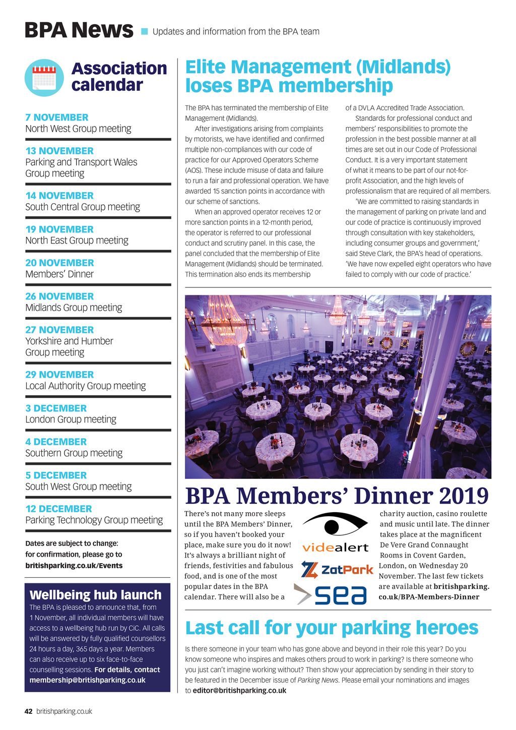 BPA News Updates and information from the BPA team Association calendar 7 NOVEMBER North West Group meeting 13 NOVEMBER Parking and Transport Wales Group meeting 14 NOVEMBER South Central Group meeting 19 NOVEMBER North East Group meeting 20 NOVEMBER Members Dinner Elite Management (Midlands) loses BPA membership The BPA has terminated the membership of Elite Management (Midlands). After investigations arising from complaints by motorists, we have identified and confirmed multiple non-compliances with our code of practice for our Approved Operators Scheme (AOS). These include misuse of data and failure to run a fair and professional operation. We have awarded 15 sanction points in accordance with our scheme of sanctions. When an approved operator receives 12 or more sanction points in a 12-month period, the operator is referred to our professional conduct and scrutiny panel. In this case, the panel concluded that the membership of Elite Management (Midlands) should be terminated. This termination also ends its membership of a DVLA Accredited Trade Association. Standards for professional conduct and members responsibilities to promote the profession in the best possible manner at all times are set out in our Code of Professional Conduct. It is a very important statement of what it means to be part of our not-forprofit Association, and the high levels of professionalism that are required of all members. We are committed to raising standards in the management of parking on private land and our code of practice is continuously improved through consultation with key stakeholders, including consumer groups and government, said Steve Clark, the BPAs head of operations. We have now expelled eight operators who have failed to comply with our code of practice. 26 NOVEMBER Midlands Group meeting 27 NOVEMBER Yorkshire and Humber Group meeting 29 NOVEMBER Local Authority Group meeting 3 DECEMBER London Group meeting 4 DECEMBER Southern Group meeting 5 DECEMBER South West Group meeting 12 DECEMBER Parking Technology Group meeting Dates are subject to change: for confirmation, please go to britishparking.co.uk/Events Wellbeing hub launch The BPA is pleased to announce that, from 1 November, all individual members will have access to a wellbeing hub run by CiC. All calls will be answered by fully qualified counsellors 24 hours a day, 365 days a year. Members can also receive up to six face-to-face counselling sessions. For details, contact membership@britishparking.co.uk BPA Members Dinner 2019 Theres not many more sleeps until the BPA Members Dinner, so if you havent booked your place, make sure you do it now! Its always a brilliant night of friends, festivities and fabulous food, and is one of the most popular dates in the BPA calendar. There will also be a charity auction, casino roulette and music until late. The dinner takes place at the magnificent De Vere Grand Connaught Rooms in Covent Garden, London, on Wednesday 20 November. The last few tickets are available at britishparking. co.uk/BPA-Members-Dinner Last call for your parking heroes Is there someone in your team who has gone above and beyond in their role this year? Do you know someone who inspires and makes others proud to work in parking? Is there someone who you just cant imagine working without? Then show your appreciation by sending in their story to be featured in the December issue of Parking News. Please email your nominations and images to editor@britishparking.co.uk 42 britishparking.co.uk PN Nov19 pp42-43 BPA News.indd 42 24/10/2019 12:31