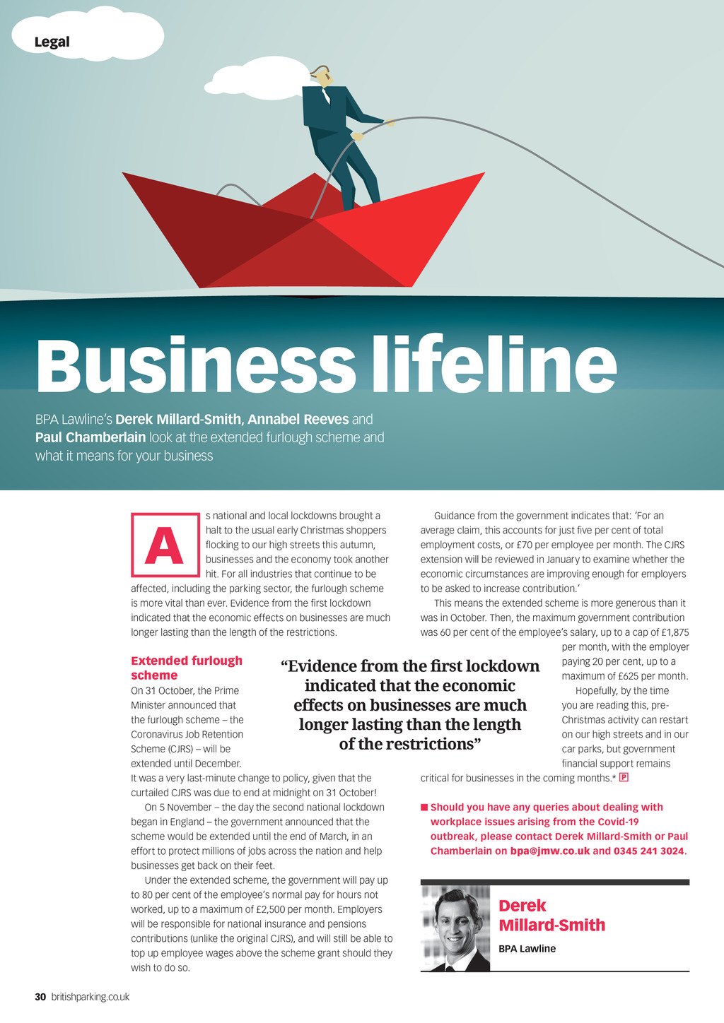Legal Business lifeline BPA Lawlines Derek Millard-Smith, Annabel Reeves and Paul Chamberlain look at the extended furlough scheme and what it means for your business s national and local lockdowns brought a halt to the usual early Christmas shoppers flocking to our high streets this autumn, businesses and the economy took another hit. For all industries that continue to be affected, including the parking sector, the furlough scheme is more vital than ever. Evidence from the first lockdown indicated that the economic effects on businesses are much longer lasting than the length of the restrictions. A Extended furlough scheme Guidance from the government indicates that: For an average claim, this accounts for just five per cent of total employment costs, or 70 per employee per month. The CJRS extension will be reviewed in January to examine whether the economic circumstances are improving enough for employers to be asked to increase contribution. This means the extended scheme is more generous than it was in October. Then, the maximum government contribution was 60 per cent of the employees salary, up to a cap of 1,875 per month, with the employer paying 20 per cent, up to a maximum of 625 per month. Hopefully, by the time you are reading this, preChristmas activity can restart on our high streets and in our car parks, but government financial support remains critical for businesses in the coming months.* Evidence from the rst lockdown indicated that the economic effects on businesses are much longer lasting than the length of the restrictions On 31 October, the Prime Minister announced that the furlough scheme the Coronavirus Job Retention Scheme (CJRS) will be extended until December. It was a very last-minute change to policy, given that the curtailed CJRS was due to end at midnight on 31 October! On 5 November the day the second national lockdown began in England the government announced that the scheme would be extended until the end of March, in an effort to protect millions of jobs across the nation and help businesses get back on their feet. Under the extended scheme, the government will pay up to 80 per cent of the employees normal pay for hours not worked, up to a maximum of 2,500 per month. Employers will be responsible for national insurance and pensions contributions (unlike the original CJRS), and will still be able to top up employee wages above the scheme grant should they wish to do so. Should you have any queries about dealing with workplace issues arising from the Covid-19 outbreak, please contact Derek Millard-Smith or Paul Chamberlain on bpa@jmw.co.uk and 0345 241 3024. Derek Millard-Smith BPA Lawline 30 britishparking.co.uk PN Dec 2020 pp30-31 legal feature pages.indd 30 23/11/2020 16:12