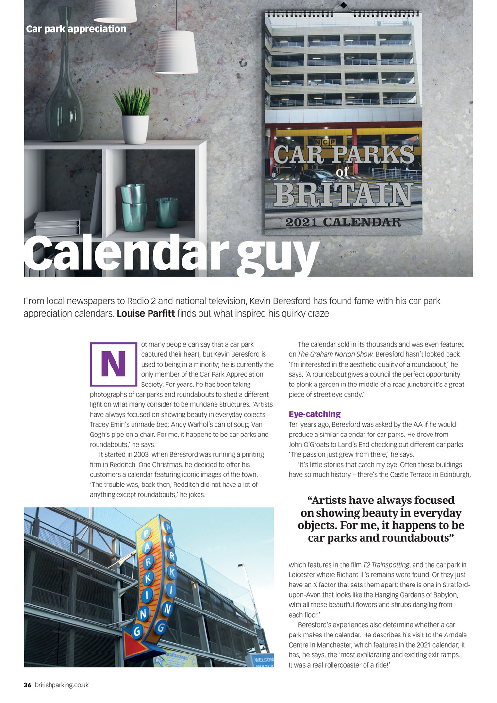 Car park appreciation Calendar guy From local newspapers to Radio 2 and national television, Kevin Beresford has found fame with his car park appreciation calendars. Louise Parfitt finds out what inspired his quirky craze ot many people can say that a car park captured their heart, but Kevin Beresford is used to being in a minority; he is currently the only member of the Car Park Appreciation Society. For years, he has been taking photographs of car parks and roundabouts to shed a different light on what many consider to be mundane structures. Artists have always focused on showing beauty in everyday objects Tracey Emins unmade bed; Andy Warhols can of soup; Van Goghs pipe on a chair. For me, it happens to be car parks and roundabouts, he says. It started in 2003, when Beresford was running a printing firm in Redditch. One Christmas, he decided to offer his customers a calendar featuring iconic images of the town. The trouble was, back then, Redditch did not have a lot of anything except roundabouts, he jokes. N The calendar sold in its thousands and was even featured on The Graham Norton Show. Beresford hasnt looked back. Im interested in the aesthetic quality of a roundabout, he says. A roundabout gives a council the perfect opportunity to plonk a garden in the middle of a road junction; its a great piece of street eye candy. Eye-catching Ten years ago, Beresford was asked by the AA if he would produce a similar calendar for car parks. He drove from John OGroats to Lands End checking out different car parks. The passion just grew from there, he says. Its little stories that catch my eye. Often these buildings have so much history theres the Castle Terrace in Edinburgh, Artists have always focused on showing beauty in everyday objects. For me, it happens to be car parks and roundabouts which features in the film T2 Trainspotting, and the car park in Leicester where Richard IIIs remains were found. Or they just have an X factor that sets them apart: there is one in Stratfordupon-Avon that looks like the Hanging Gardens of Babylon, with all these beautiful flowers and shrubs dangling from each floor. Beresfords experiences also determine whether a car park makes the calendar. He describes his visit to the Arndale Centre in Manchester, which features in the 2021 calendar; it has, he says, the most exhilarating and exciting exit ramps. It was a real rollercoaster of a ride! 36 britishparking.co.uk PN Dec 2020 pp36-37 Calendar Guy.indd 36 23/11/2020 13:18