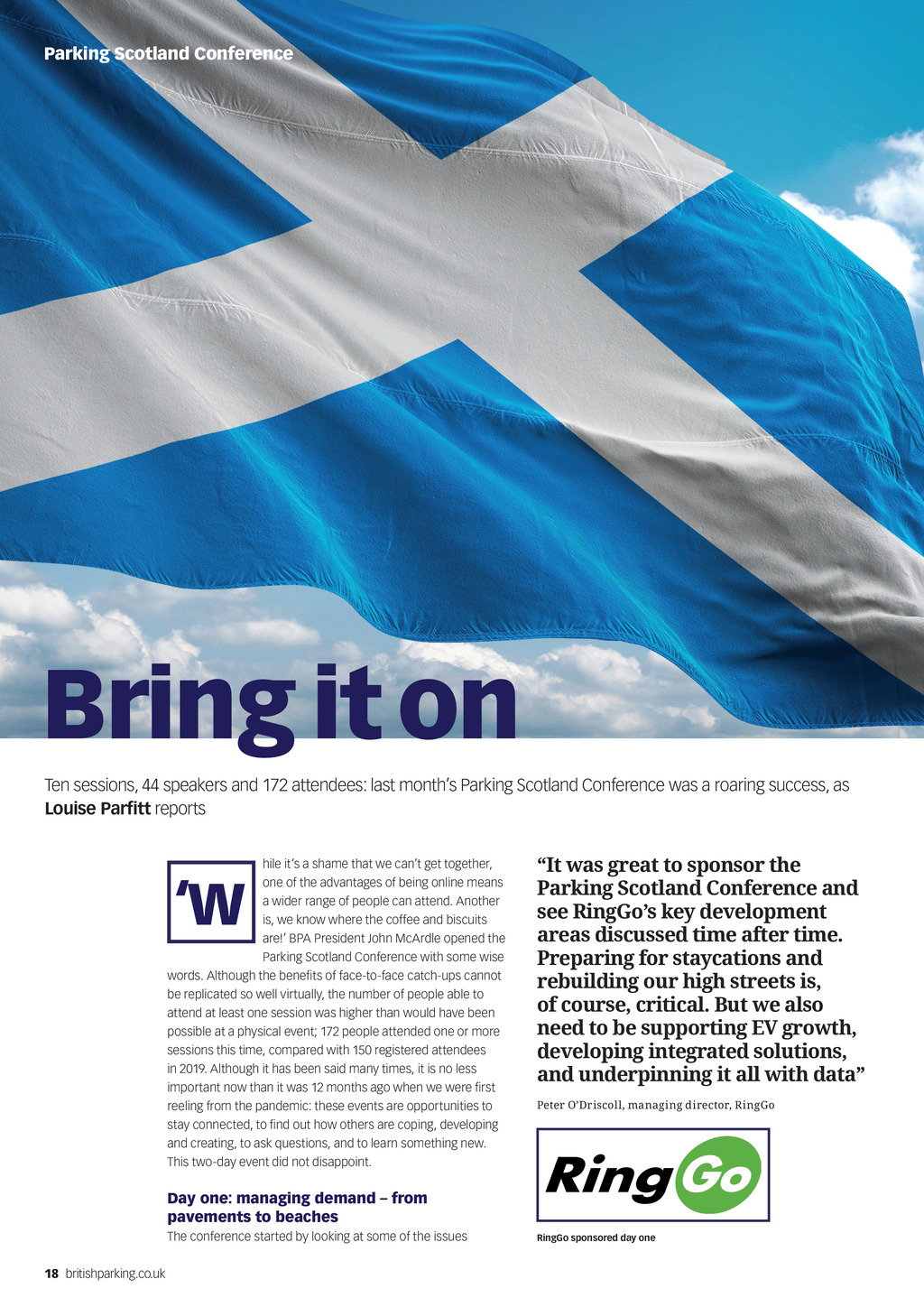 Parking Scotland Conference Bring it on Ten sessions, 44 speakers and 172 attendees: last months Parking Scotland Conference was a roaring success, as Louise Parfitt reports hile its a shame that we cant get together, one of the advantages of being online means a wider range of people can attend. Another is, we know where the coffee and biscuits are! BPA President John McArdle opened the Parking Scotland Conference with some wise words. Although the benefits of face-to-face catch-ups cannot be replicated so well virtually, the number of people able to attend at least one session was higher than would have been possible at a physical event; 172 people attended one or more sessions this time, compared with 150 registered attendees in 2019. Although it has been said many times, it is no less important now than it was 12 months ago when we were first reeling from the pandemic: these events are opportunities to stay connected, to find out how others are coping, developing and creating, to ask questions, and to learn something new. This two-day event did not disappoint. W It was great to sponsor the Parking Scotland Conference and see RingGos key development areas discussed time after time. Preparing for staycations and rebuilding our high streets is, of course, critical. But we also need to be supporting EV growth, developing integrated solutions, and underpinning it all with data Peter ODriscoll, managing director, RingGo Day one: managing demand from pavements to beaches The conference started by looking at some of the issues RingGo sponsored day one 18 britishparking.co.uk PN Apr 2021 pp18-21 Scotland Conference.indd 18 24/03/2021 13:03