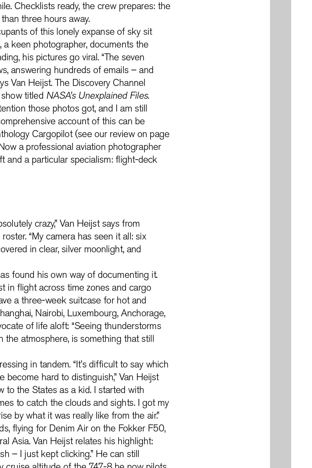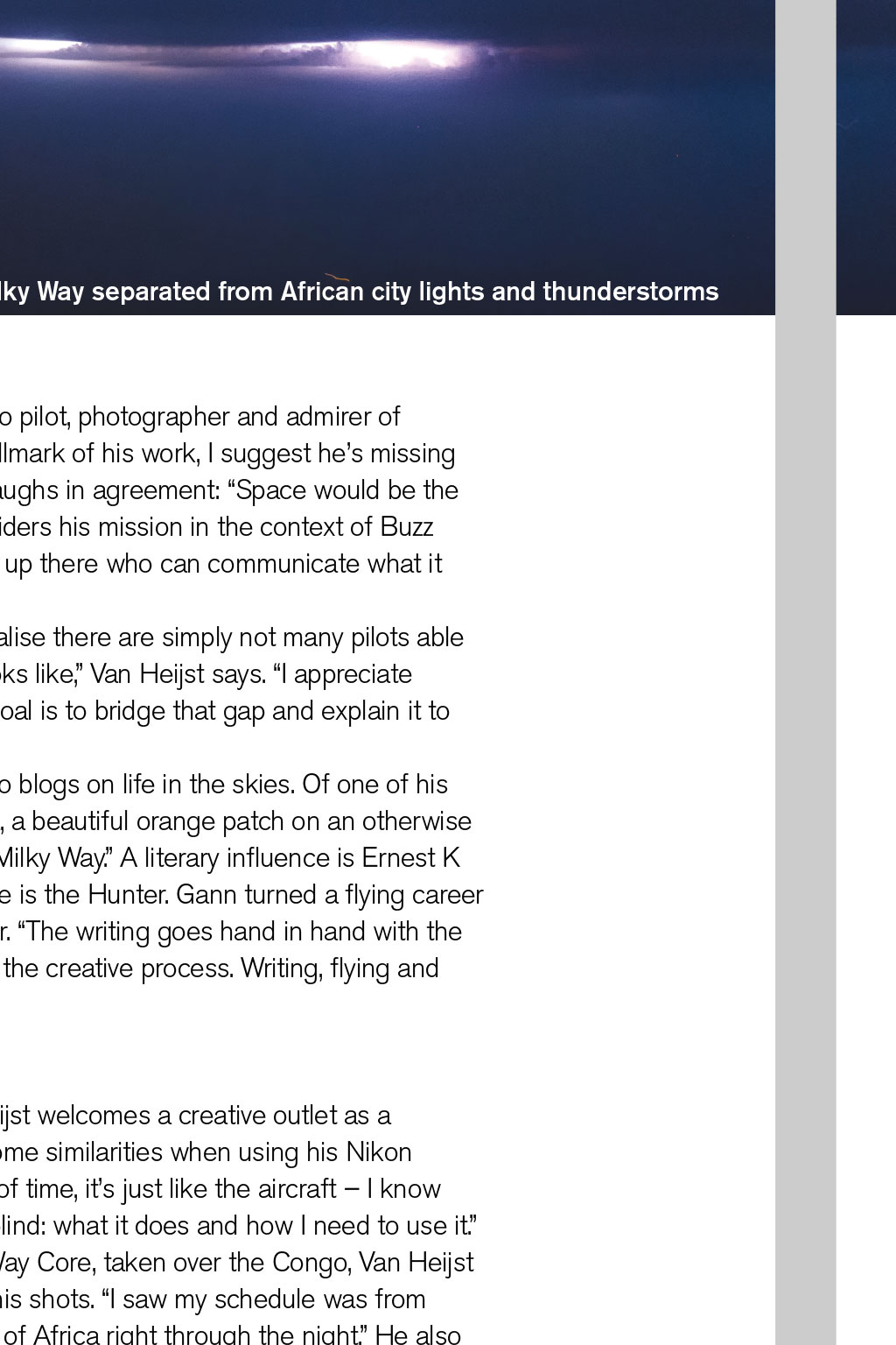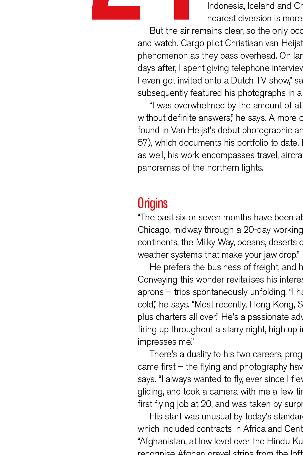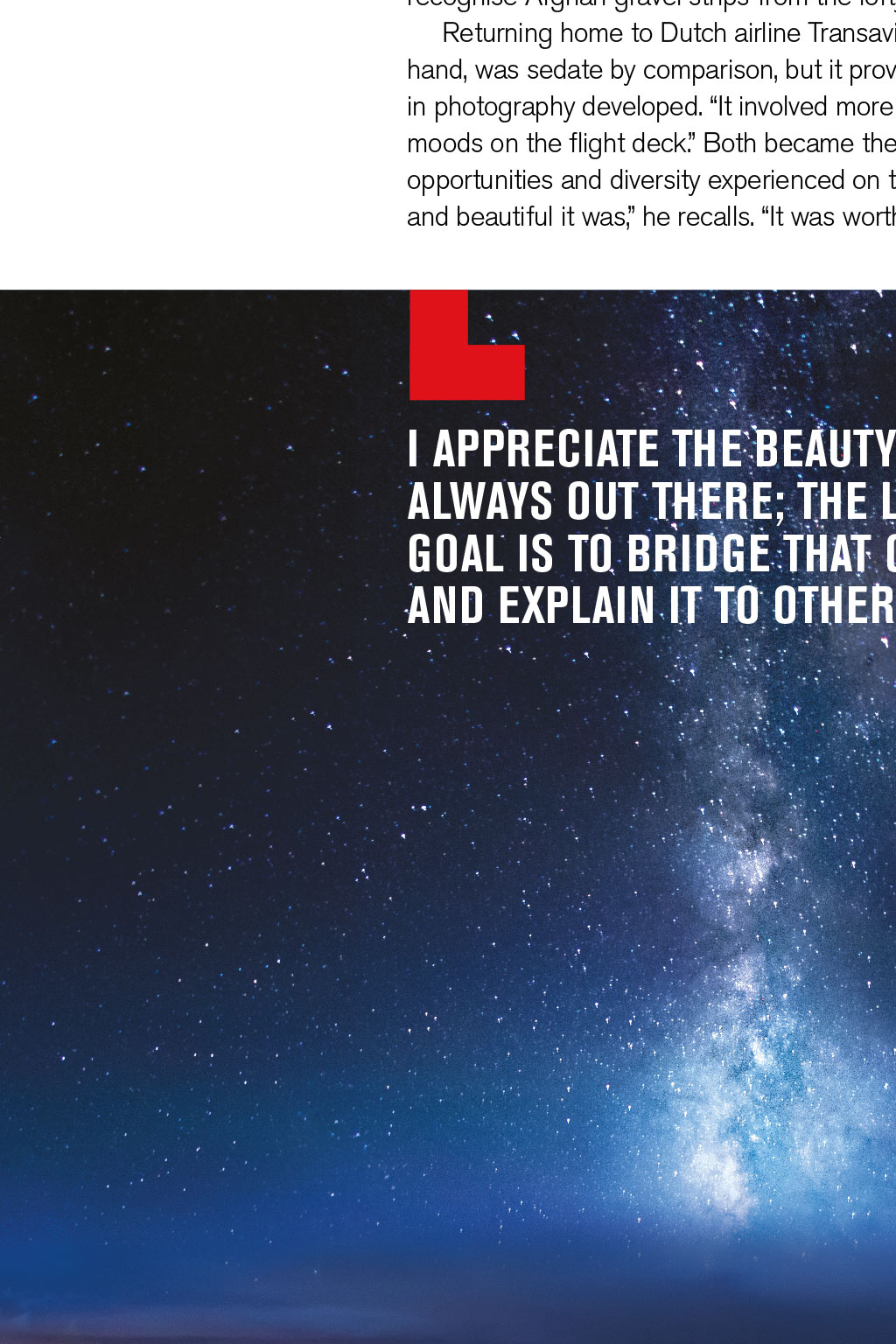 PHOTOGRAPHY Shooting Stars Christiaan van Heijst is a professional long-haul cargo pilot for Silkway West, but his passion for photography has also enabled him to communicate a breathtaking view of his world to a global audience through his remarkable aviation images By Robin Evans, Senior Log Contributor 24 August 2014, over the darkened Pacific. The frequency and flight deck are quiet but for the rush of Mach .84. The crew departed Hong Kong hours ago; behind them, microchips, medicines and other goods bound for Anchorage, Alaska. A distant flashing interrupts their calm. Heading towards PASRO, the dark ocean is aglow, huge patches radiating red, orange and green. There is some alarm; ops confirm tectonic activity in Japan, San Francisco, Indonesia, Iceland and Chile. Checklists ready, the crew prepares: the nearest diversion is more than three hours away. But the air remains clear, so the only occupants of this lonely expanse of sky sit and watch. Cargo pilot Christiaan van Heijst, a keen photographer, documents the phenomenon as they pass overhead. On landing, his pictures go viral. The seven days after, I spent giving telephone interviews, answering hundreds of emails and I even got invited onto a Dutch TV show, says Van Heijst. The Discovery Channel subsequently featured his photographs in a show titled NASAs Unexplained Files. I was overwhelmed by the amount of attention those photos got, and I am still without definite answers, he says. A more comprehensive account of this can be found in Van Heijsts debut photographic anthology Cargopilot (see our review on page 57), which documents his portfolio to date. Now a professional aviation photographer as well, his work encompasses travel, aircraft and a particular specialism: flight-deck panoramas of the northern lights. Origins The past six or seven months have been absolutely crazy, Van Heijst says from Chicago, midway through a 20-day working roster. My camera has seen it all: six continents, the Milky Way, oceans, deserts covered in clear, silver moonlight, and weather systems that make your jaw drop. He prefers the business of freight, and has found his own way of documenting it. Conveying this wonder revitalises his interest in flight across time zones and cargo aprons trips spontaneously unfolding. I have a three-week suitcase for hot and cold, he says. Most recently, Hong Kong, Shanghai, Nairobi, Luxembourg, Anchorage, plus charters all over. Hes a passionate advocate of life aloft: Seeing thunderstorms firing up throughout a starry night, high up in the atmosphere, is something that still impresses me. Theres a duality to his two careers, progressing in tandem. Its difficult to say which came first the flying and photography have become hard to distinguish, Van Heijst says. I always wanted to fly, ever since I flew to the States as a kid. I started with gliding, and took a camera with me a few times to catch the clouds and sights. I got my first flying job at 20, and was taken by surprise by what it was really like from the air. His start was unusual by todays standards, flying for Denim Air on the Fokker F50, which included contracts in Africa and Central Asia. Van Heijst relates his highlight: Afghanistan, at low level over the Hindu Kush I just kept clicking. He can still recognise Afghan gravel strips from the lofty cruise altitude of the 747-8 he now pilots. Returning home to Dutch airline Transavia on a 737, with an upgraded camera in hand, was sedate by comparison, but it proved invaluable, as his burgeoning interest in photography developed. It involved more night flights, capturing the stars and moods on the flight deck. Both became the bridge to his ultimate goal: the routes, opportunities and diversity experienced on the 747. It was evident to me how unique and beautiful it was, he recalls. It was worth sharing with others. I APPRECIATE THE BEAUTY THATS ALWAYS OUT THERE; THE LIFE GOAL IS TO BRIDGE THAT GAP AND EXPLAIN IT TO OTHERS READ MORE Theres one final question: How do Boeing and Nikon compare? Thats a good pilots question, Van Heijst says. Aviation has its big two leading the way and its the same with cameras. They all really know their products and markets. He highlights the reliability and durability of his preferred machines. Acknowledging advances in both, he chuckles: I stick to my Nikon and Boeing. Im a typical Boeing guy very conservative. See more at www.jpcvanheijst.com @JPCvanHeijst The Milky Way separated from African city lights and thunderstorms READ MORE Theres one final question Airborne inspirations Van Heijst describes himself as a 747 cargo pilot, photographer and admirer of natural light. With references to space a hallmark of his work, I suggest hes missing frustrated astronaut and astronomer. He laughs in agreement: Space would be the ultimate platform for photography. He considers his mission in the context of Buzz Aldrins belief that we need to have people up there who can communicate what it feels like not just pilots and engineers. Feedback from colleagues made me realise there are simply not many pilots able to articulate what our environment really looks like, Van Heijst says. I appreciate the beauty thats always out there; the life goal is to bridge that gap and explain it to others. To put his work in context, Van Heijst also blogs on life in the skies. Of one of his pictures he observes: The Egyptian Sahara, a beautiful orange patch on an otherwise mostly blue marble in a quiet corner of the Milky Way. A literary influence is Ernest K Gann, author of seminal aviation classic Fate is the Hunter. Gann turned a flying career into a creative one, becoming a screenwriter. The writing goes hand in hand with the photography; its the same satisfaction with the creative process. Writing, flying and photography enhance each other. Creativity Entirely self-taught behind the lens, Van Heijst welcomes a creative outlet as a counterpoint to the flight deck. There are some similarities when usi
