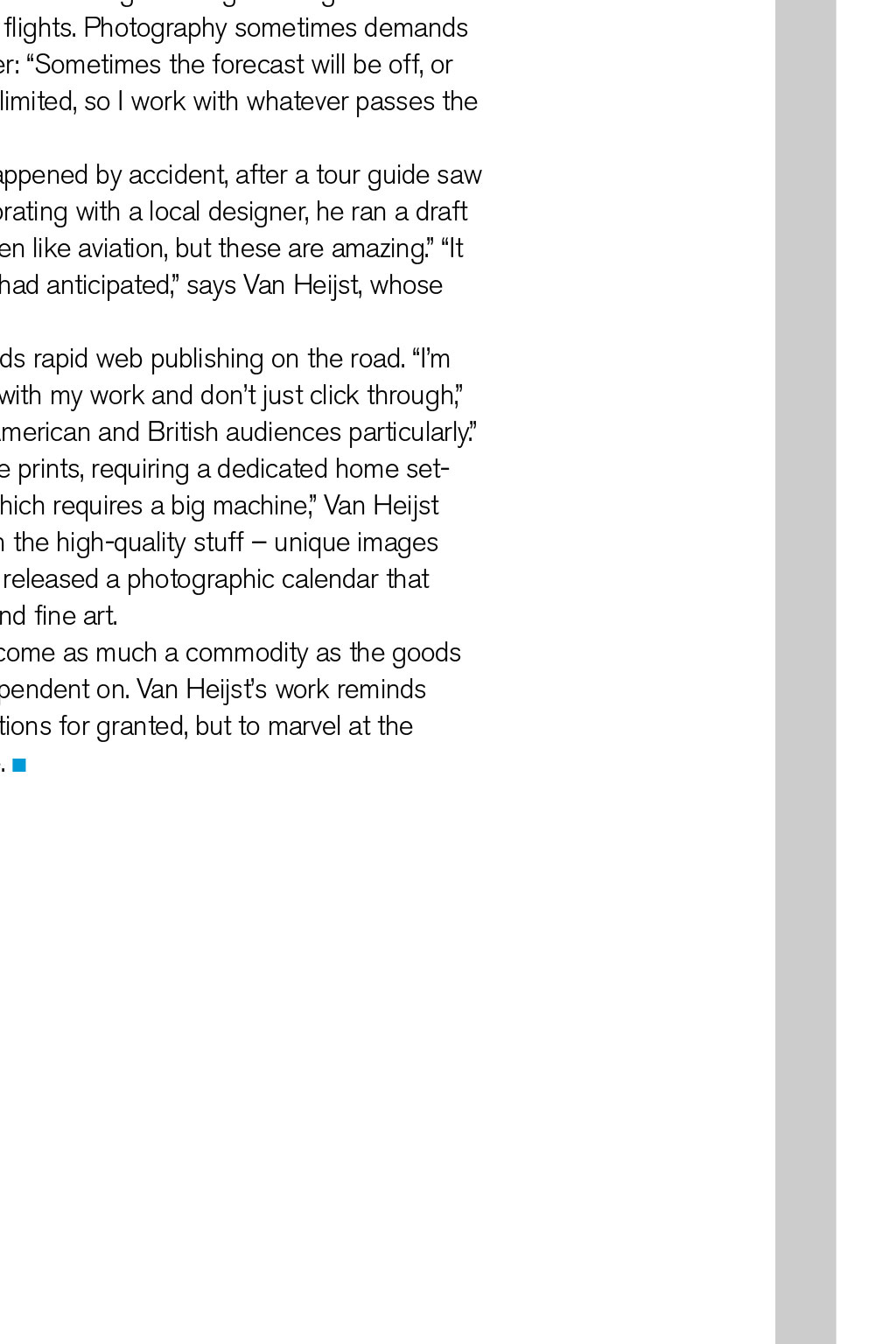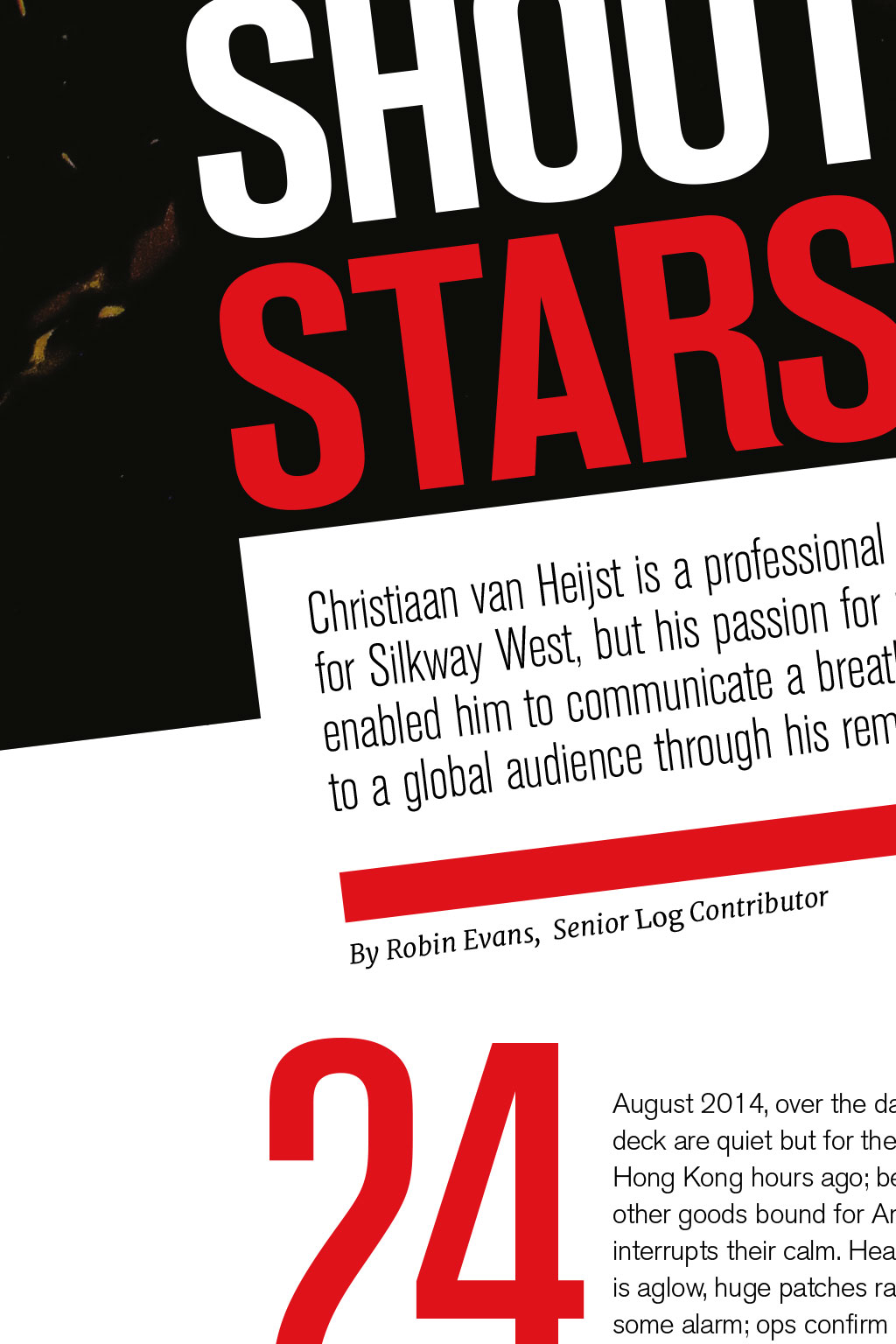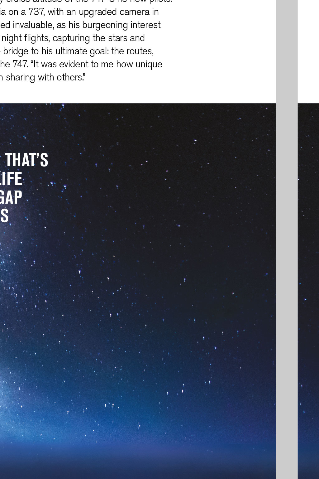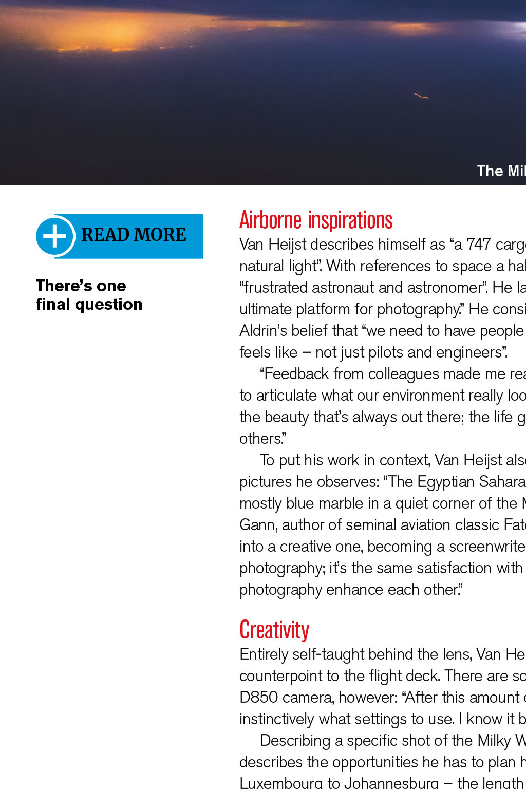 PHOTOGRAPHY Shooting Stars Christiaan van Heijst is a professional long-haul cargo pilot for Silkway West, but his passion for photography has also enabled him to communicate a breathtaking view of his world to a global audience through his remarkable aviation images By Robin Evans, Senior Log Contributor 24 August 2014, over the darkened Pacific. The frequency and flight deck are quiet but for the rush of Mach .84. The crew departed Hong Kong hours ago; behind them, microchips, medicines and other goods bound for Anchorage, Alaska. A distant flashing interrupts their calm. Heading towards PASRO, the dark ocean is aglow, huge patches radiating red, orange and green. There is some alarm; ops confirm tectonic activity in Japan, San Francisco, Indonesia, Iceland and Chile. Checklists ready, the crew prepares: the nearest diversion is more than three hours away. But the air remains clear, so the only occupants of this lonely expanse of sky sit and watch. Cargo pilot Christiaan van Heijst, a keen photographer, documents the phenomenon as they pass overhead. On landing, his pictures go viral. The seven days after, I spent giving telephone interviews, answering hundreds of emails and I even got invited onto a Dutch TV show, says Van Heijst. The Discovery Channel subsequently featured his photographs in a show titled NASAs Unexplained Files. I was overwhelmed by the amount of attention those photos got, and I am still without definite answers, he says. A more comprehensive account of this can be found in Van Heijsts debut photographic anthology Cargopilot (see our review on page 57), which documents his portfolio to date. Now a professional aviation photographer as well, his work encompasses travel, aircraft and a particular specialism: flight-deck panoramas of the northern lights. Origins The past six or seven months have been absolutely crazy, Van Heijst says from Chicago, midway through a 20-day working roster. My camera has seen it all: six continents, the Milky Way, oceans, deserts covered in clear, silver moonlight, and weather systems that make your jaw drop. He prefers the business of freight, and has found his own way of documenting it. Conveying this wonder revitalises his interest in flight across time zones and cargo aprons trips spontaneously unfolding. I have a three-week suitcase for hot and cold, he says. Most recently, Hong Kong, Shanghai, Nairobi, Luxembourg, Anchorage, plus charters all over. Hes a passionate advocate of life aloft: Seeing thunderstorms firing up throughout a starry night, high up in the atmosphere, is something that still impresses me. Theres a duality to his two careers, progressing in tandem. Its difficult to say which came first the flying and photography have become hard to distinguish, Van Heijst says. I always wanted to fly, ever since I flew to the States as a kid. I started with gliding, and took a camera with me a few times to catch the clouds and sights. I got my first flying job at 20, and was taken by surprise by what it was really like from the air. His start was unusual by todays standards, flying for Denim Air on the Fokker F50, which included contracts in Africa and Central Asia. Van Heijst relates his highlight: Afghanistan, at low level over the Hindu Kush I just kept clicking. He can still recognise Afghan gravel strips from the lofty cruise altitude of the 747-8 he now pilots. Returning home to Dutch airline Transavia on a 737, with an upgraded camera in hand, was sedate by comparison, but it proved invaluable, as his burgeoning interest in photography developed. It involved more night flights, capturing the stars and moods on the flight deck. Both became the bridge to his ultimate goal: the routes, opportunities and diversity experienced on the 747. It was evident to me how unique and beautiful it was, he recalls. It was worth sharing with others. I APPRECIATE THE BEAUTY THATS ALWAYS OUT THERE; THE LIFE GOAL IS TO BRIDGE THAT GAP AND EXPLAIN IT TO OTHERS READ MORE Theres one final question: How do Boeing and Nikon compare? Thats a good pilots question, Van Heijst says. Aviation has its big two leading the way and its the same with cameras. They all really know their products and markets. He highlights the reliability and durability of his preferred machines. Acknowledging advances in both, he chuckles: I stick to my Nikon and Boeing. Im a typical Boeing guy very conservative. See more at www.jpcvanheijst.com @JPCvanHeijst The Milky Way separated from African city lights and thunderstorms READ MORE Theres one final question Airborne inspirations Van Heijst describes himself as a 747 cargo pilot, photographer and admirer of natural light. With references to space a hallmark of his work, I suggest hes missing frustrated astronaut and astronomer. He laughs in agreement: Space would be the ultimate platform for photography. He considers his mission in the context of Buzz Aldrins belief that we need to have people up there who can communicate what it feels like not just pilots and engineers. Feedback from colleagues made me realise there are simply not many pilots able to articulate what our environment really looks like, Van Heijst says. I appreciate the beauty thats always out there; the life goal is to bridge that gap and explain it to others. To put his work in context, Van Heijst also blogs on life in the skies. Of one of his pictures he observes: The Egyptian Sahara, a beautiful orange patch on an otherwise mostly blue marble in a quiet corner of the Milky Way. A literary influence is Ernest K Gann, author of seminal aviation classic Fate is the Hunter. Gann turned a flying career into a creative one, becoming a screenwriter. The writing goes hand in hand with the photography; its the same satisfaction with the creative process. Writing, flying and photography enhance each other. Creativity Entirely self-taught behind the lens, Van Heijst welcomes a creative outlet as a counterpoint to the flight deck. There are some similarities when usi
