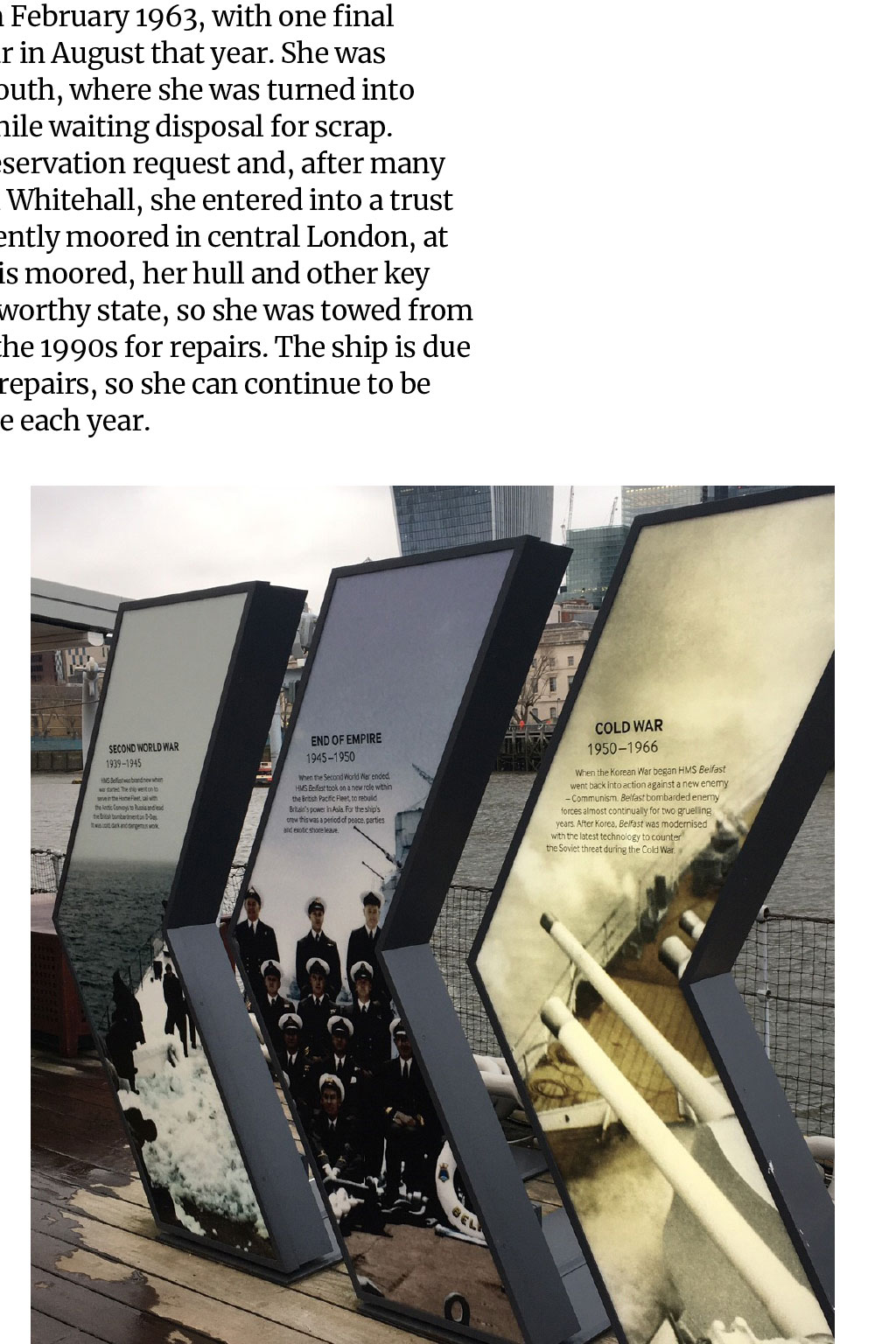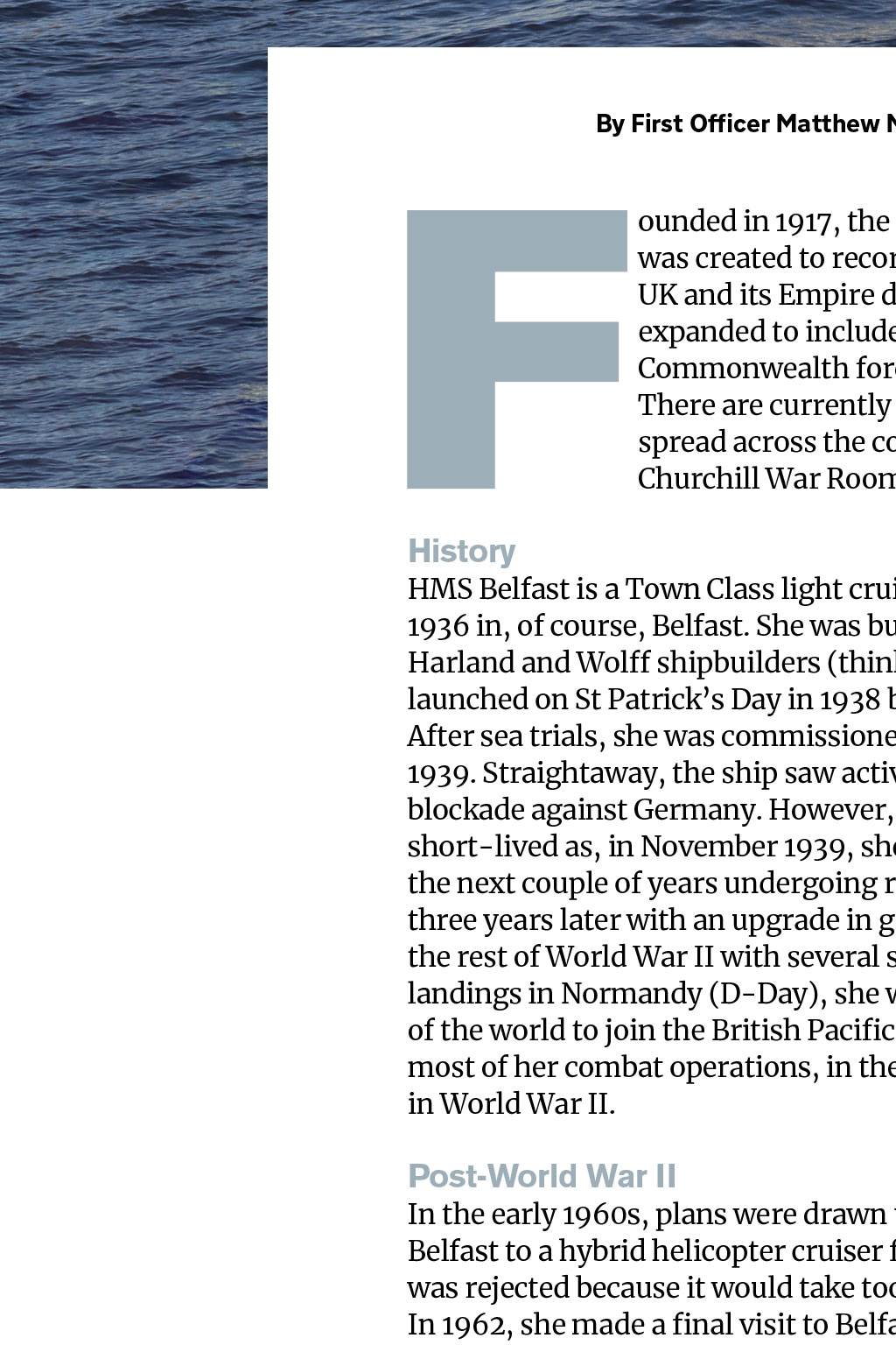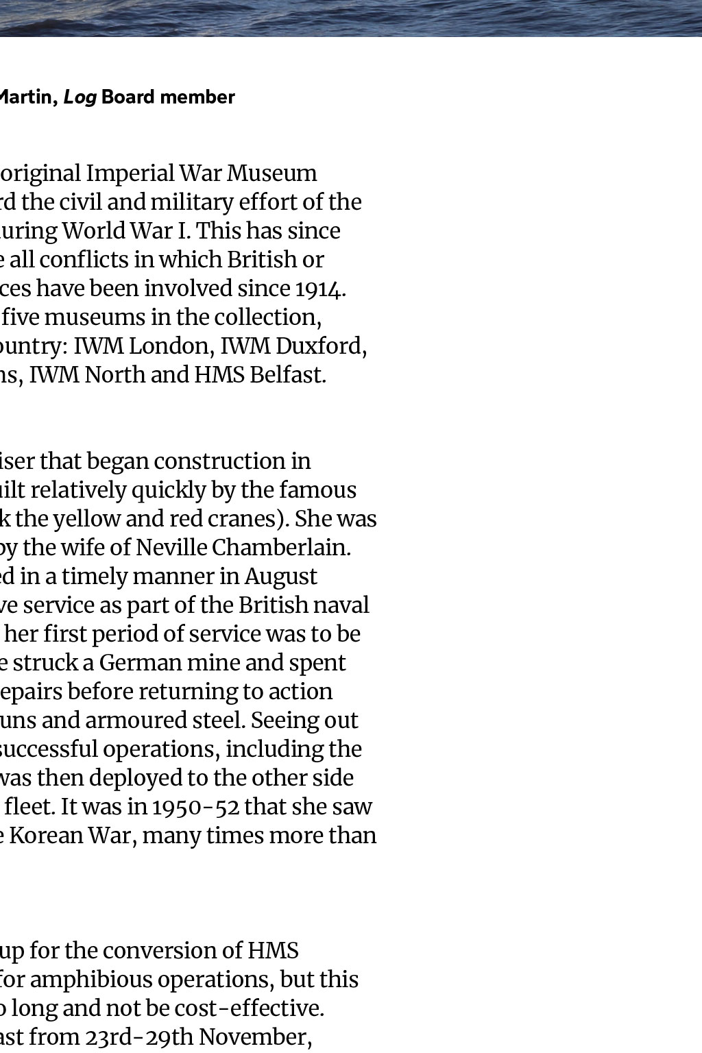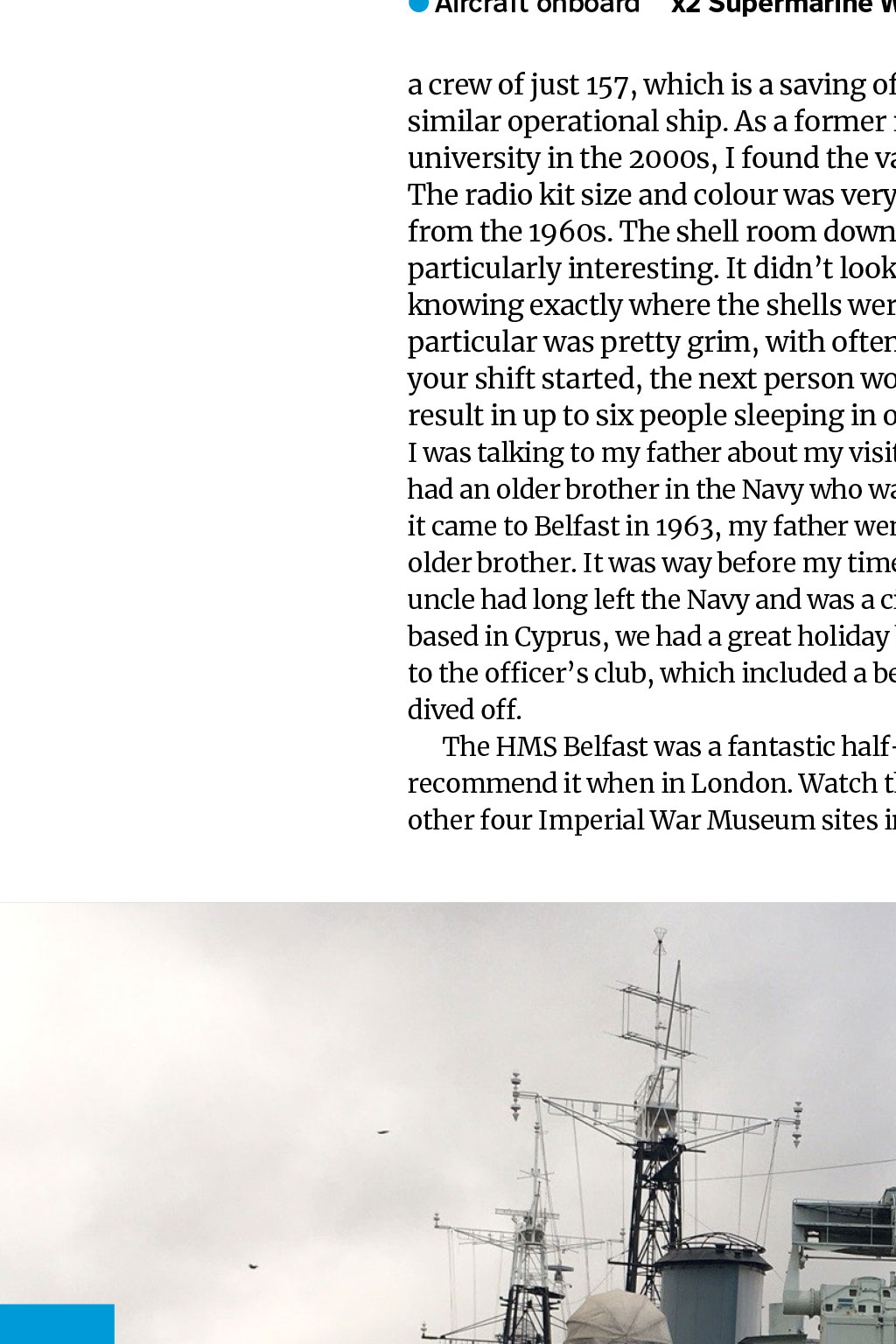 HMS BELFAST Ship shape By First Officer Matthew Martin, Log Board member Founded in 1917, the original Imperial War Museum was created to record the civil and military effort of the UK and its Empire during World War I. This has since expanded to include all conflicts in which British or Commonwealth forces have been involved since 1914. There are currently five museums in the collection, spread across the country: IWM London, IWM Duxford, Churchill War Rooms, IWM North and HMS Belfast. History HMS Belfast is a Town Class light cruiser that began construction in 1936 in, of course, Belfast. She was built relatively quickly by the famous Harland and Wolff shipbuilders (think the yellow and red cranes). She was launched on St Patricks Day in 1938 by the wife of Neville Chamberlain. After sea trials, she was commissioned in a timely manner in August 1939. Straightaway, the ship saw active service as part of the British naval blockade against Germany. However, her first period of service was to be short-lived as, in November 1939, she struck a German mine and spent the next couple of years undergoing repairs before returning to action three years later with an upgrade in guns and armoured steel. Seeing out the rest of World War II with several successful operations, including the landings in Normandy (D-Day), she was then deployed to the other side of the world to join the British Pacific fleet. It was in 1950-52 that she saw most of her combat operations, in the Korean War, many times more than in World War II. Post-World War II In the early 1960s, plans were drawn up for the conversion of HMS Belfast to a hybrid helicopter cruiser for amphibious operations, but this was rejected because it would take too long and not be cost-effective. In 1962, she made a final visit to Belfast from 23rd-29th November, before paying off into reserve on 25th February 1963, with one final military training exercise off Gibraltar in August that year. She was then moored permanently in Portsmouth, where she was turned into an accommodation ship until 1970 while waiting disposal for scrap. The British government refused a preservation request and, after many negotiations from retired admirals in Whitehall, she entered into a trust within the IWS and has been permanently moored in central London, at The Queens Walk, since 1971. As she is moored, her hull and other key parts have to be maintained to a sea-worthy state, so she was towed from London to Portsmouth dockyards in the 1990s for repairs. The ship is due to be towed again in 2025 for further repairs, so she can continue to be visited by a staggering 350,000 people each year. The engine room felt more like Willy Wonkas chocolate factory, with the number of dials, buttons, and levers around Onboard A visit to the ship is fascinating, with most areas open for viewing. It is also available for hire for private parties and meeting events. The number of decks and rooms is staggering, with three decks below the waterline, which were the engine rooms, and you can see what a dangerous working environment it was down there. Imagine being out in the middle of sea during a war at full speed. The risk of having the engine room doors closed if there is damage from a Uboat doesnt bear thinking about. The engine room felt more like Willy Wonkas chocolate factory, with the number of dials, buttons and levers around. I am sure the type rating for these engines was no walk in the park! When compared to an airliner, the weight of the ship and the amount of fuel needed to power it and get it moving was impressive. What with the heavy machinery in the kitchen even the floor, tiled with 0.5cm-thick tiles it seems weight was no issue during construction. I would doubt they would be so extravagant today, with weight tolerances and efficiency levels demanded. The new HMS Belfast, due to be delivered in the next few years, has HMS Belfast technical stats Weight Length Crew Propulsion Speed Aircraft onboard 11,500 tonnes 187 metres 761 60,000 KW x4 Parsons single reduction geared steam turbines 32 knots x2 Supermarine Walrus a crew of just 157, which is a saving of more than 600 people to run a similar operational ship. As a former reservist in the Royal Signals at university in the 2000s, I found the various radio rooms very interesting. The radio kit size and colour was very similar to the radio equipment from the 1960s. The shell room down below the waterline was also particularly interesting. It didnt look to be the most secure of rooms, knowing exactly where the shells were stored. The accommodation in particular was pretty grim, with often hotbunking in place. As soon as your shift started, the next person would jump in your bed, and this could result in up to six people sleeping in one bed in any 24-hour period! I was talking to my father about my visit to HMS Belfast. It turns out that he had an older brother in the Navy who was stationed on HMS Belfast. When it came to Belfast in 1963, my father went on board for a tour and to visit his older brother. It was way before my time, but I do recall in 1990, when my uncle had long left the Navy and was a civilian attached to the Royal Signals based in Cyprus, we had a great holiday based at an army base. We had access to the officers club, which included a beach and a raft we swam out to and dived off. The HMS Belfast was a fantastic half-day out, and I would thoroughly recommend it when in London. Watch this space for visits and reports to the other four Imperial War Museum sites in future editions of The Log. HMS Belfast, in central London A peek inside the captains cabin Dental facilities were provided on board Cables weave their way along the engine room Down in the dark depths of the engine room All mod cons in the ships kitchen HMS Belfasts switch-filled radio room A store of shells A fully-equipped workshop