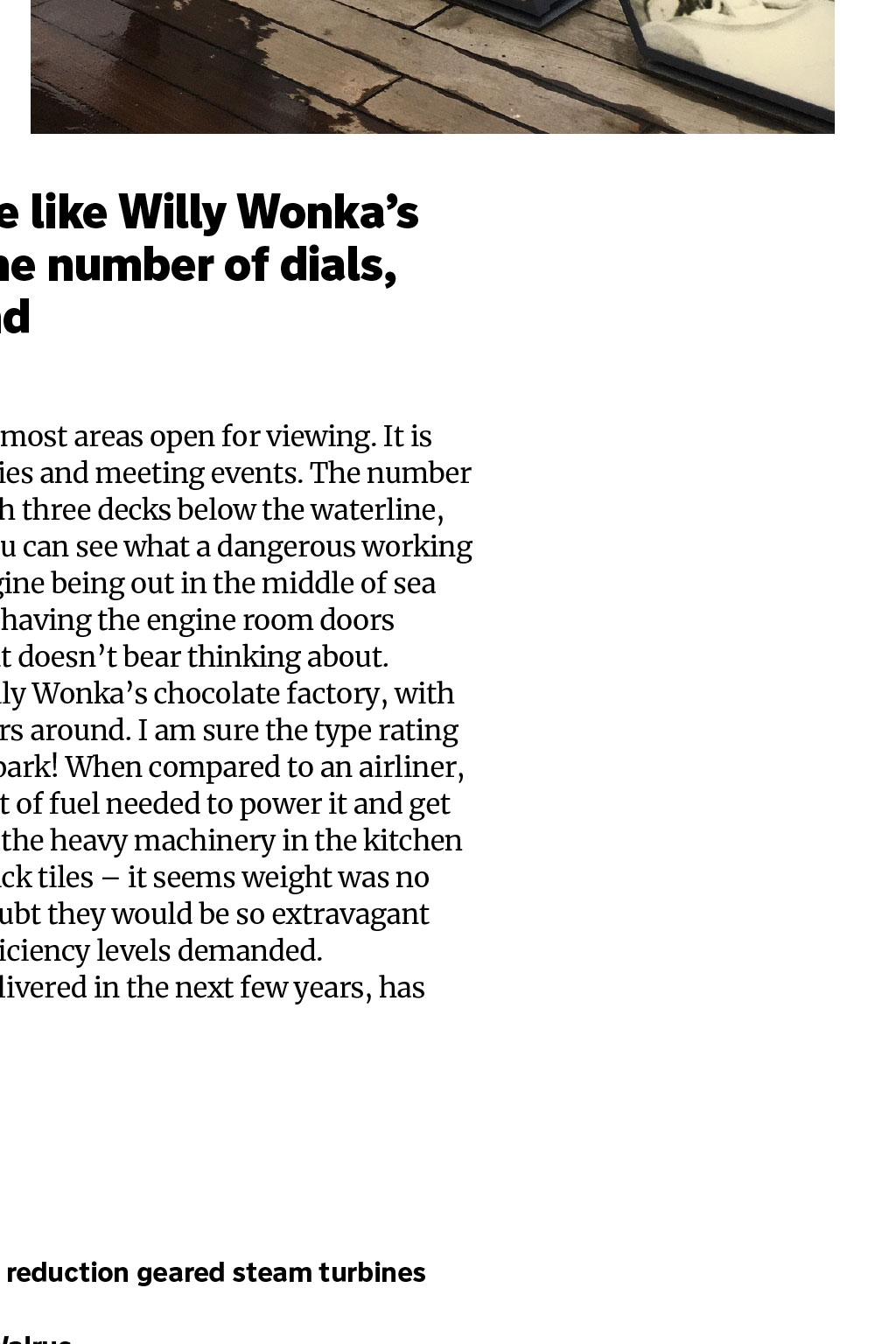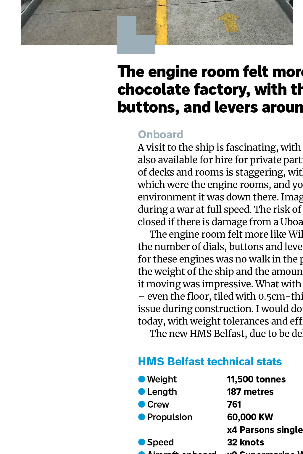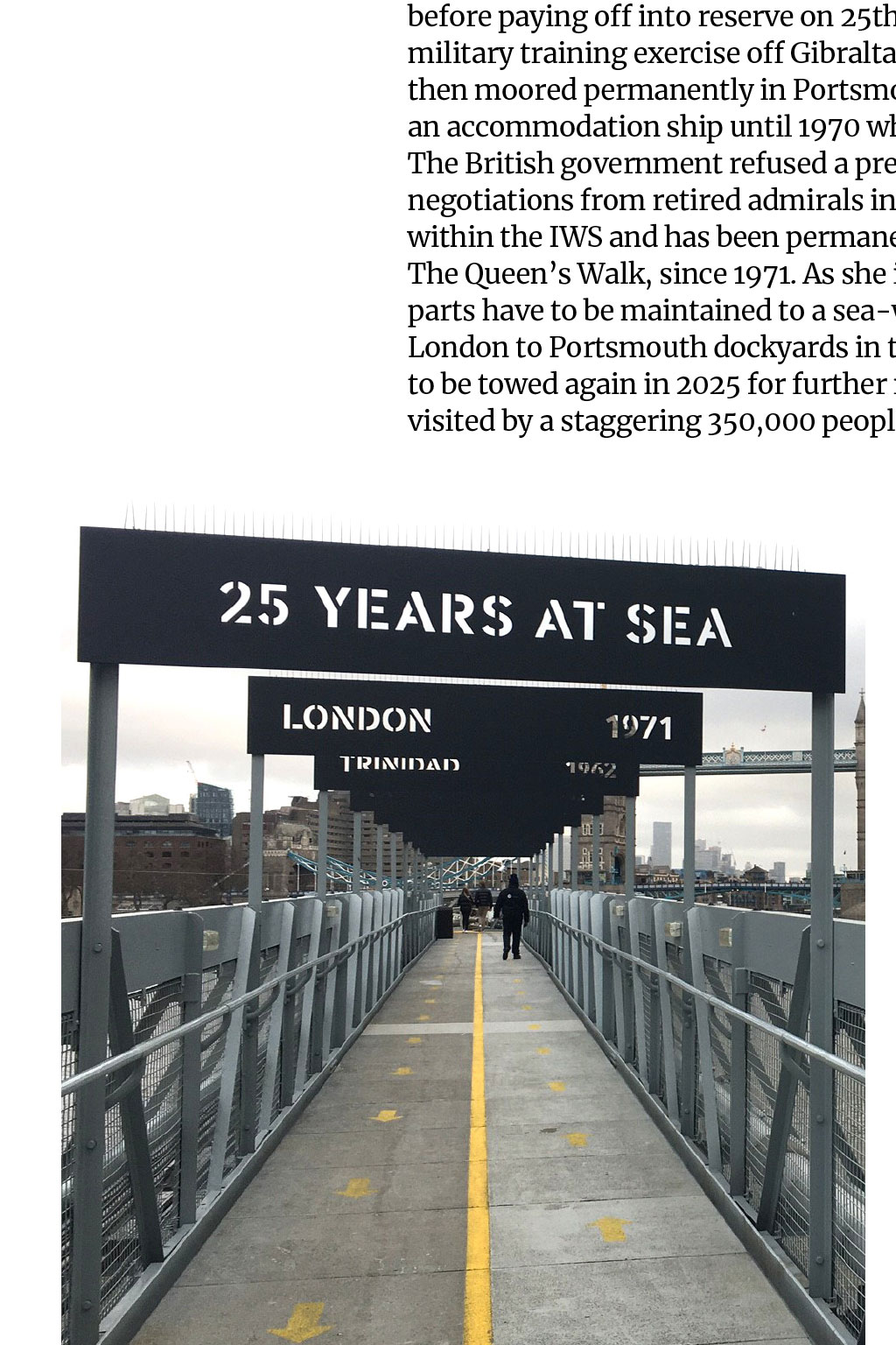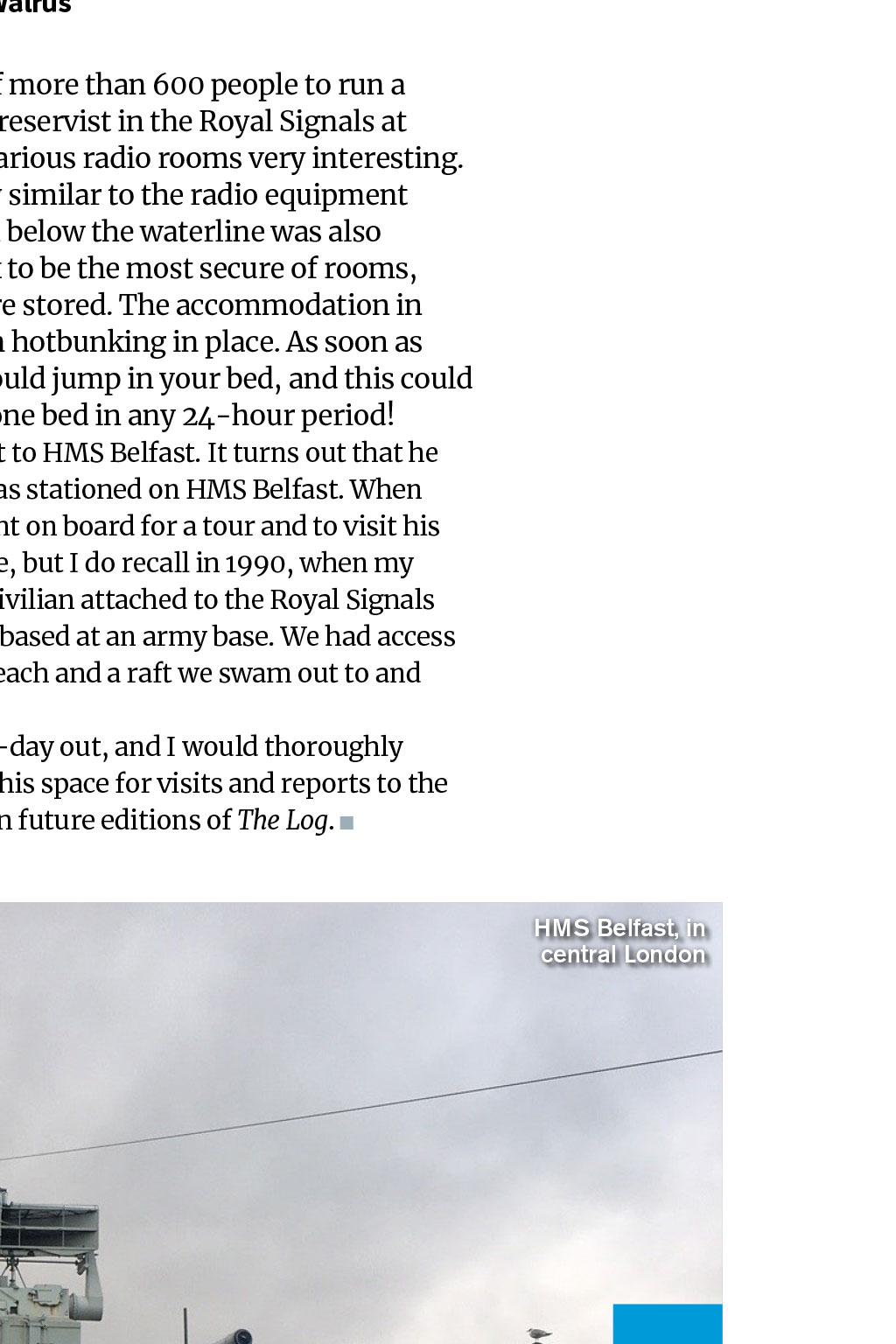 HMS BELFAST Ship shape By First Officer Matthew Martin, Log Board member Founded in 1917, the original Imperial War Museum was created to record the civil and military effort of the UK and its Empire during World War I. This has since expanded to include all conflicts in which British or Commonwealth forces have been involved since 1914. There are currently five museums in the collection, spread across the country: IWM London, IWM Duxford, Churchill War Rooms, IWM North and HMS Belfast. History HMS Belfast is a Town Class light cruiser that began construction in 1936 in, of course, Belfast. She was built relatively quickly by the famous Harland and Wolff shipbuilders (think the yellow and red cranes). She was launched on St Patricks Day in 1938 by the wife of Neville Chamberlain. After sea trials, she was commissioned in a timely manner in August 1939. Straightaway, the ship saw active service as part of the British naval blockade against Germany. However, her first period of service was to be short-lived as, in November 1939, she struck a German mine and spent the next couple of years undergoing repairs before returning to action three years later with an upgrade in guns and armoured steel. Seeing out the rest of World War II with several successful operations, including the landings in Normandy (D-Day), she was then deployed to the other side of the world to join the British Pacific fleet. It was in 1950-52 that she saw most of her combat operations, in the Korean War, many times more than in World War II. Post-World War II In the early 1960s, plans were drawn up for the conversion of HMS Belfast to a hybrid helicopter cruiser for amphibious operations, but this was rejected because it would take too long and not be cost-effective. In 1962, she made a final visit to Belfast from 23rd-29th November, before paying off into reserve on 25th February 1963, with one final military training exercise off Gibraltar in August that year. She was then moored permanently in Portsmouth, where she was turned into an accommodation ship until 1970 while waiting disposal for scrap. The British government refused a preservation request and, after many negotiations from retired admirals in Whitehall, she entered into a trust within the IWS and has been permanently moored in central London, at The Queens Walk, since 1971. As she is moored, her hull and other key parts have to be maintained to a sea-worthy state, so she was towed from London to Portsmouth dockyards in the 1990s for repairs. The ship is due to be towed again in 2025 for further repairs, so she can continue to be visited by a staggering 350,000 people each year. The engine room felt more like Willy Wonkas chocolate factory, with the number of dials, buttons, and levers around Onboard A visit to the ship is fascinating, with most areas open for viewing. It is also available for hire for private parties and meeting events. The number of decks and rooms is staggering, with three decks below the waterline, which were the engine rooms, and you can see what a dangerous working environment it was down there. Imagine being out in the middle of sea during a war at full speed. The risk of having the engine room doors closed if there is damage from a Uboat doesnt bear thinking about. The engine room felt more like Willy Wonkas chocolate factory, with the number of dials, buttons and levers around. I am sure the type rating for these engines was no walk in the park! When compared to an airliner, the weight of the ship and the amount of fuel needed to power it and get it moving was impressive. What with the heavy machinery in the kitchen even the floor, tiled with 0.5cm-thick tiles it seems weight was no issue during construction. I would doubt they would be so extravagant today, with weight tolerances and efficiency levels demanded. The new HMS Belfast, due to be delivered in the next few years, has HMS Belfast technical stats Weight Length Crew Propulsion Speed Aircraft onboard 11,500 tonnes 187 metres 761 60,000 KW x4 Parsons single reduction geared steam turbines 32 knots x2 Supermarine Walrus a crew of just 157, which is a saving of more than 600 people to run a similar operational ship. As a former reservist in the Royal Signals at university in the 2000s, I found the various radio rooms very interesting. The radio kit size and colour was very similar to the radio equipment from the 1960s. The shell room down below the waterline was also particularly interesting. It didnt look to be the most secure of rooms, knowing exactly where the shells were stored. The accommodation in particular was pretty grim, with often hotbunking in place. As soon as your shift started, the next person would jump in your bed, and this could result in up to six people sleeping in one bed in any 24-hour period! I was talking to my father about my visit to HMS Belfast. It turns out that he had an older brother in the Navy who was stationed on HMS Belfast. When it came to Belfast in 1963, my father went on board for a tour and to visit his older brother. It was way before my time, but I do recall in 1990, when my uncle had long left the Navy and was a civilian attached to the Royal Signals based in Cyprus, we had a great holiday based at an army base. We had access to the officers club, which included a beach and a raft we swam out to and dived off. The HMS Belfast was a fantastic half-day out, and I would thoroughly recommend it when in London. Watch this space for visits and reports to the other four Imperial War Museum sites in future editions of The Log. HMS Belfast, in central London A peek inside the captains cabin Dental facilities were provided on board Cables weave their way along the engine room Down in the dark depths of the engine room All mod cons in the ships kitchen HMS Belfasts switch-filled radio room A store of shells A fully-equipped workshop