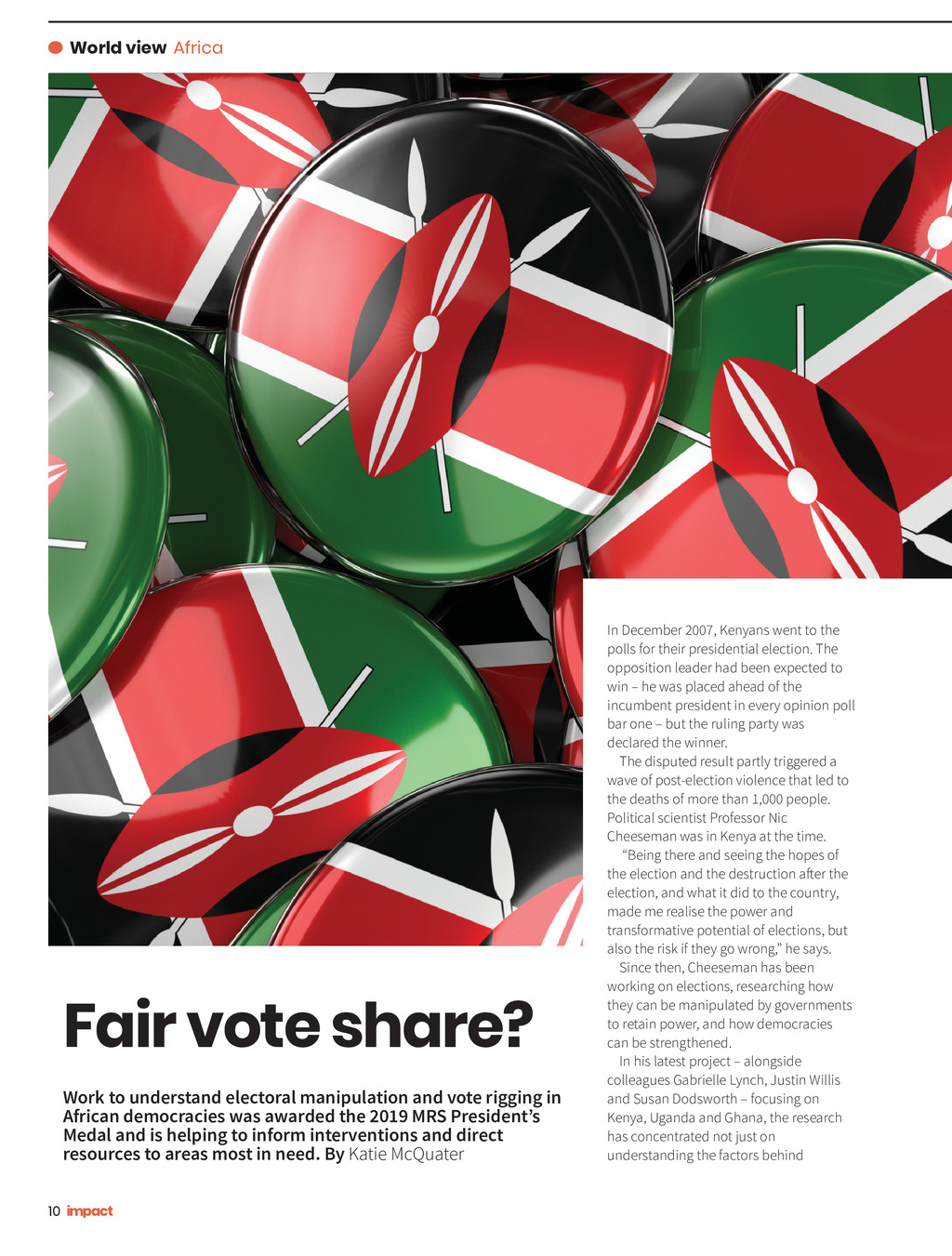 World view Africa Fair vote share? Work to understand electoral manipulation and vote rigging in African democracies was awarded the 2019 MRS Presidents Medal and is helping to inform interventions and direct resources to areas most in need. By Katie McQuater 10 In December 2007, Kenyans went to the polls for their presidential election. The opposition leader had been expected to win he was placed ahead of the incumbent president in every opinion poll bar one but the ruling party was declared the winner. The disputed result partly triggered a wave of post-election violence that led to the deaths of more than 1,000 people. Political scientist Professor Nic Cheeseman was in Kenya at the time. Being there and seeing the hopes of the election and the destruction after the election, and what it did to the country, made me realise the power and transformative potential of elections, but also the risk if they go wrong, he says. Since then, Cheeseman has been working on elections, researching how they can be manipulated by governments to retain power, and how democracies can be strengthened. In his latest project alongside colleagues Gabrielle Lynch, Justin Willis and Susan Dodsworth focusing on Kenya, Uganda and Ghana, the research has concentrated not just on understanding the factors behind