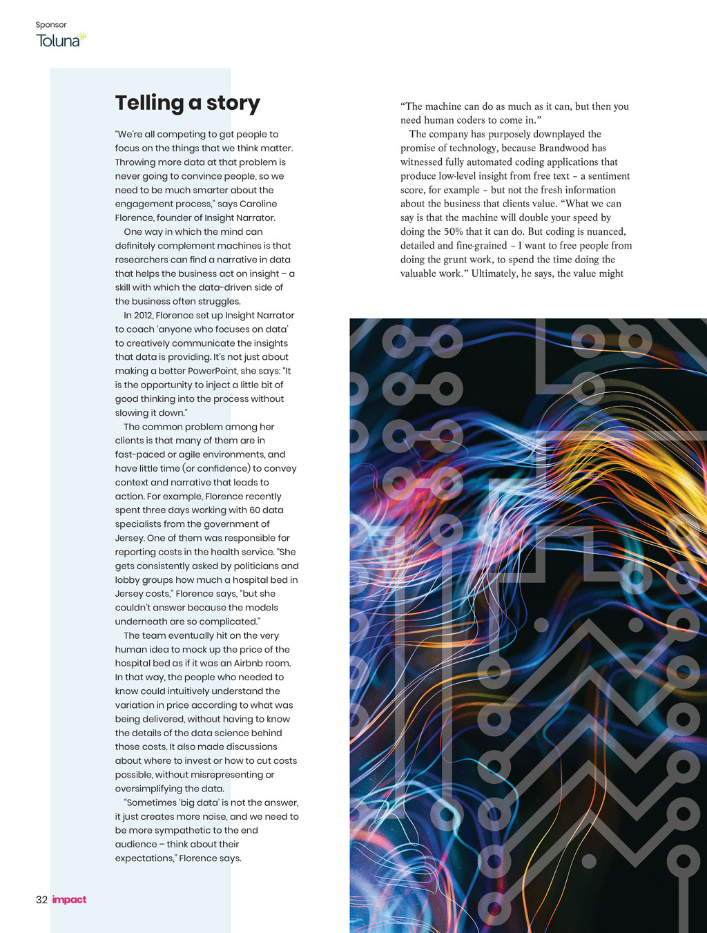 Sponsor Telling a story Were all competing to get people to focus on the things that we think matter. Throwing more data at that problem is never going to convince people, so we need to be much smarter about the engagement process, says Caroline Florence, founder of Insight Narrator. One way in which the mind can definitely complement machines is that researchers can find a narrative in data that helps the business act on insight a skill with which the data-driven side of the business often struggles. In 2012, Florence set up Insight Narrator to coach anyone who focuses on data to creatively communicate the insights that data is providing. Its not just about making a better PowerPoint, she says: It is the opportunity to inject a little bit of good thinking into the process without slowing it down. The common problem among her clients is that many of them are in fast-paced or agile environments, and have little time (or confidence) to convey context and narrative that leads to action. For example, Florence recently spent three days working with 60 data specialists from the government of Jersey. One of them was responsible for reporting costs in the health service. She gets consistently asked by politicians and lobby groups how much a hospital bed in Jersey costs, Florence says, but she couldnt answer because the models underneath are so complicated. The team eventually hit on the very human idea to mock up the price of the hospital bed as if it was an Airbnb room. In that way, the people who needed to know could intuitively understand the variation in price according to what was being delivered, without having to know the details of the data science behind those costs. It also made discussions about where to invest or how to cut costs possible, without misrepresenting or oversimplifying the data. Sometimes big data is not the answer, it just creates more noise, and we need to be more sympathetic to the end audience think about their expectations, Florence says. 32 The machine can do as much as it can, but then you need human coders to come in. The company has purposely downplayed the promise of technology, because Brandwood has witnessed fully automated coding applications that produce low-level insight from free text a sentiment score, for example but not the fresh information about the business that clients value. What we can say is that the machine will double your speed by doing the 50% that it can do. But coding is nuanced, detailed and fine-grained I want to free people from doing the grunt work, to spend the time doing the valuable work. Ultimately, he says, the value might