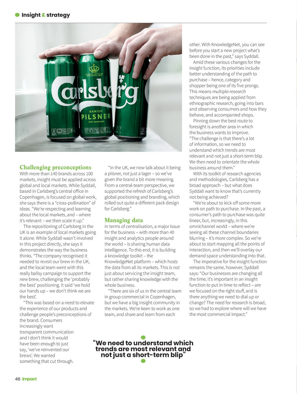 Insight & strategy Challenging preconceptions other. With KnowledgeNet, you can see before you start a new project whats been done in the past, says Syddall. Amid these various changes for the insight function, its priorities include better understanding of the path to purchase hence, category and shopper being one of its five prongs. This means multiple research techniques are being applied from ethnographic research, going into bars and observing consumers and how they behave, and accompanied shops. Pinning down the best route to foresight is another area in which the business wants to improve. The challenge is that theres a lot of information, so we need to understand which trends are most relevant and not just a short-term blip. We then need to orientate the whole business around them. With its toolkit of research agencies and methodologies, Carlsberg has a broad approach but what does Syddall want to know thats currently not being achieved? Were about to kick off some more work on path to purchase. In the past, a consumers path to purchase was quite linear, but, increasingly, in this omnichannel world where were seeing all these channel boundaries blurring its more complex. So were about to start mapping all the points of interaction, and then well overlay our demand space understanding into that. The imperative for the insight function remains the same, however, Syddall says: Our businesses are changing all the time; its important in an insight function to put in time to reflect are we focused on the right stuff, and is there anything we need to dial up or change? The need for research is broad, so we had to explore where will we have the most commercial impact. In the UK, we now talk about it being a pilsner, not just a lager so weve With more than 140 brands across 100 given the brand a bit more meaning. markets, insight must be applied across From a central-team perspective, we global and local markets. While Syddall, supported the refresh of Carlsbergs based in Carlsbergs central office in global positioning and branding, which Copenhagen, is focused on global work, rolled out quite a different pack design she says there is a cross-pollination of for Carlsberg. ideas. Were respecting and learning about the local markets, and where its relevant we then scale it up. Managing data The repositioning of Carlsberg in the In terms of centralisation, a major issue UK is an example of local markets going for the business with more than 40 it alone. While Syddall wasnt involved insight and analytics people around in this project directly, she says it the world is sharing human data demonstrates the way the business intelligence. To this end, it is building thinks. The company recognised it a knowledge toolkit the needed to revisit our brew in the UK, KnowledgeNet platform which hosts and the local team went with this the data from all its markets. This is not really ballsy campaign to support the just about servicing the insight team, new brew, challenging the probably but rather sharing knowledge with the the best positioning. It said we hold whole business. our hands up we dont think we are There are six of us in the central team the best. in group commercial in Copenhagen, This was based on a need to elevate but we have a big insight community in the experience of our products and the markets. Were keen to work as one challenge peoples preconceptions of team, and share and learn from each the brand. Consumers increasingly want transparent communication and I dont think it would have been enough to just We need to understand which say, weve reinvented our trends are most relevant and brews. We wanted not just a short-term blip something that cut through. 46