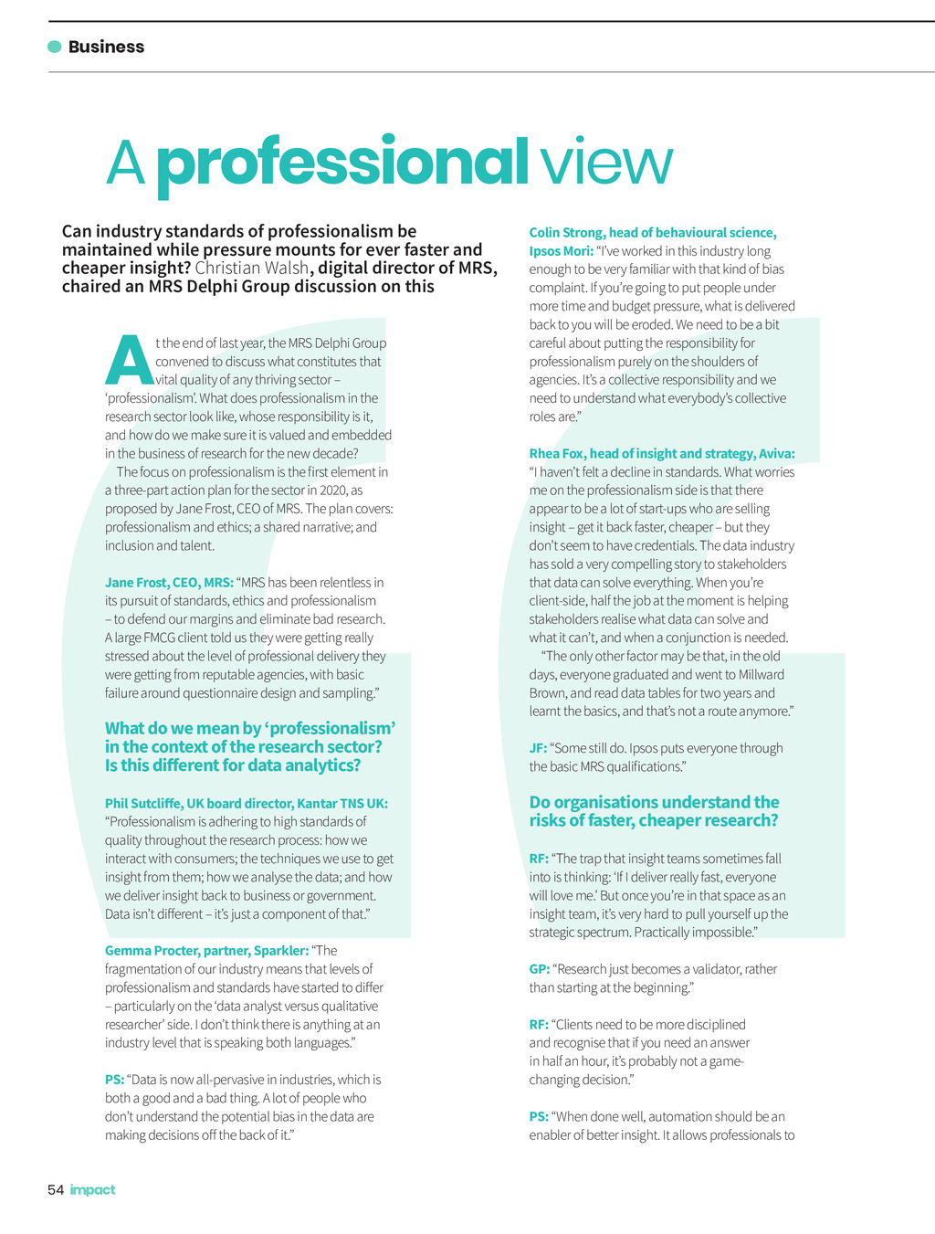 Business A professional view Can industry standards of professionalism be maintained while pressure mounts for ever faster and cheaper insight? Christian Walsh, digital director of MRS, chaired an MRS Delphi Group discussion on this A t the end of last year, the MRS Delphi Group convened to discuss what constitutes that vital quality of any thriving sector professionalism. What does professionalism in the research sector look like, whose responsibility is it, and how do we make sure it is valued and embedded in the business of research for the new decade? The focus on professionalism is the first element in a three-part action plan for the sector in 2020, as proposed by Jane Frost, CEO of MRS. The plan covers: professionalism and ethics; a shared narrative; and inclusion and talent. Jane Frost, CEO, MRS: MRS has been relentless in its pursuit of standards, ethics and professionalism to defend our margins and eliminate bad research. A large FMCG client told us they were getting really stressed about the level of professional delivery they were getting from reputable agencies, with basic failure around questionnaire design and sampling. What do we mean by professionalism in the context of the research sector? Is this different for data analytics? Phil Sutcliffe, UK board director, Kantar TNS UK: Professionalism is adhering to high standards of quality throughout the research process: how we interact with consumers; the techniques we use to get insight from them; how we analyse the data; and how we deliver insight back to business or government. Data isnt different its just a component of that. Gemma Procter, partner, Sparkler: The fragmentation of our industry means that levels of professionalism and standards have started to differ particularly on the data analyst versus qualitative researcher side. I dont think there is anything at an industry level that is speaking both languages. PS: Data is now all-pervasive in industries, which is both a good and a bad thing. A lot of people who dont understand the potential bias in the data are making decisions off the back of it. 54 Colin Strong, head of behavioural science, Ipsos Mori: Ive worked in this industry long enough to be very familiar with that kind of bias complaint. If youre going to put people under more time and budget pressure, what is delivered back to you will be eroded. We need to be a bit careful about putting the responsibility for professionalism purely on the shoulders of agencies. Its a collective responsibility and we need to understand what everybodys collective roles are. Rhea Fox, head of insight and strategy, Aviva: I havent felt a decline in standards. What worries me on the professionalism side is that there appear to be a lot of start-ups who are selling insight get it back faster, cheaper but they dont seem to have credentials. The data industry has sold a very compelling story to stakeholders that data can solve everything. When youre client-side, half the job at the moment is helping stakeholders realise what data can solve and what it cant, and when a conjunction is needed. The only other factor may be that, in the old days, everyone graduated and went to Millward Brown, and read data tables for two years and learnt the basics, and thats not a route anymore. JF: Some still do. Ipsos puts everyone through the basic MRS qualifications. Do organisations understand the risks of faster, cheaper research? RF: The trap that insight teams sometimes fall into is thinking: If I deliver really fast, everyone will love me. But once youre in that space as an insight team, its very hard to pull yourself up the strategic spectrum. Practically impossible. GP: Research just becomes a validator, rather than starting at the beginning. RF: Clients need to be more disciplined and recognise that if you need an answer in half an hour, its probably not a gamechanging decision. PS: When done well, automation should be an enabler of better insight. It allows professionals to