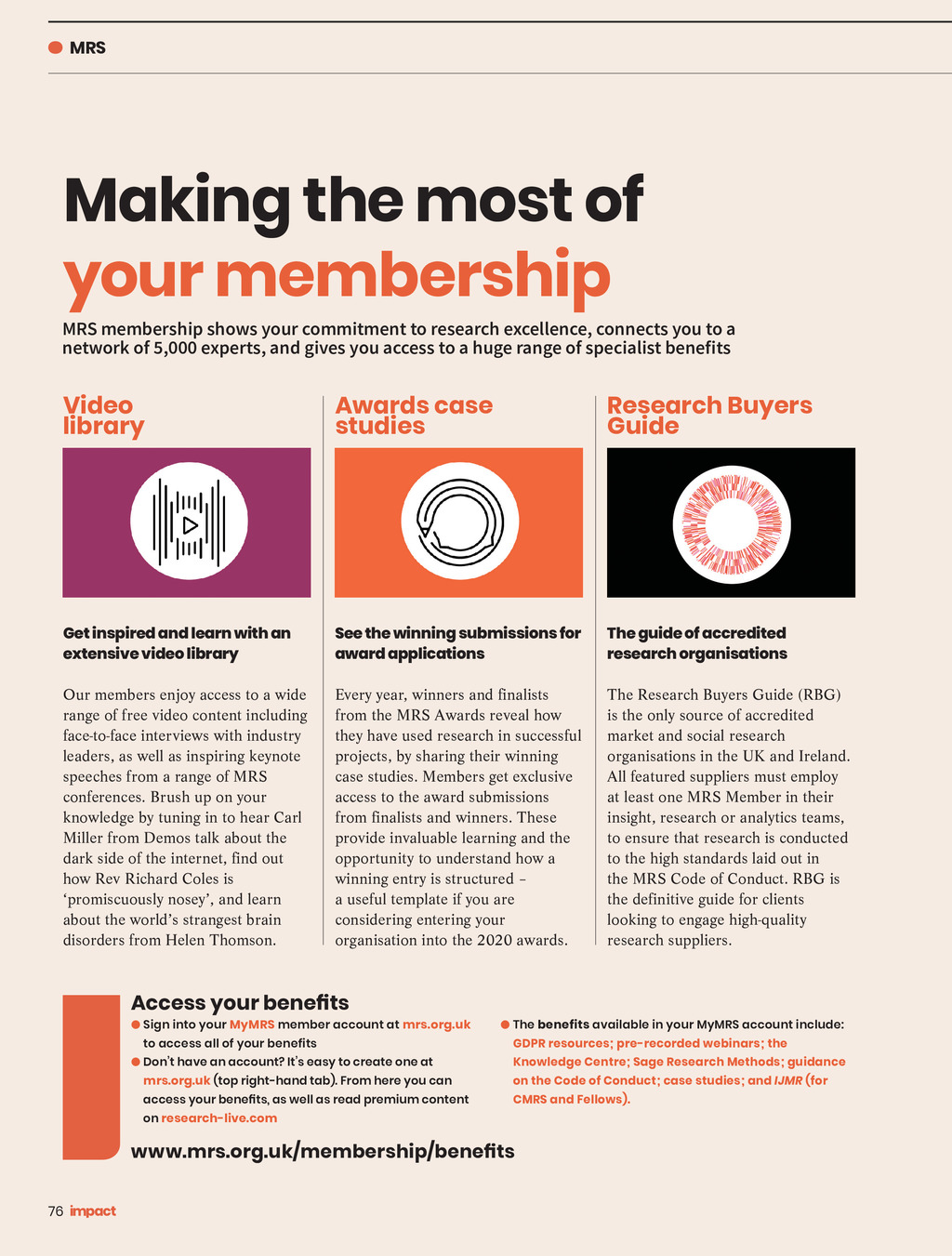 MRS Making the most of your membership MRS membership shows your commitment to research excellence, connects you to a network of 5,000 experts, and gives you access to a huge range of specialist benefits Video library Awards case studies Research Buyers Guide Get inspired and learn with an extensive video library See the winning submissions for award applications The guide of accredited research organisations Our members enjoy access to a wide range of free video content including face-to-face interviews with industry leaders, as well as inspiring keynote speeches from a range of MRS conferences. Brush up on your knowledge by tuning in to hear Carl Miller from Demos talk about the dark side of the internet, find out how Rev Richard Coles is promiscuously nosey, and learn about the worlds strangest brain disorders from Helen Thomson. Every year, winners and finalists from the MRS Awards reveal how they have used research in successful projects, by sharing their winning case studies. Members get exclusive access to the award submissions from finalists and winners. These provide invaluable learning and the opportunity to understand how a winning entry is structured a useful template if you are considering entering your organisation into the 2020 awards. The Research Buyers Guide (RBG) is the only source of accredited market and social research organisations in the UK and Ireland. All featured suppliers must employ at least one MRS Member in their insight, research or analytics teams, to ensure that research is conducted to the high standards laid out in the MRS Code of Conduct. RBG is the definitive guide for clients looking to engage high-quality research suppliers. Access your benefits Sign into your MyMRS member account at mrs.org.uk to access all of your benefits Dont have an account? Its easy to create one at mrs.org.uk (top right-hand tab). From here you can access your benefits, as well as read premium content on research-live.com The benefits available in your MyMRS account include: GDPR resources; pre-recorded webinars; the Knowledge Centre; Sage Research Methods; guidance on the Code of Conduct; case studies; and IJMR (for CMRS and Fellows). www.mrs.org.uk/membership/benefits 76